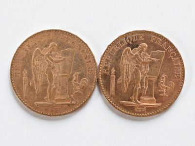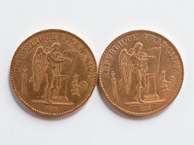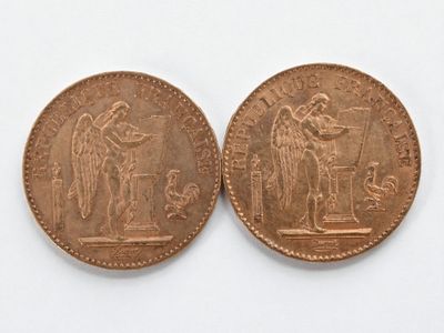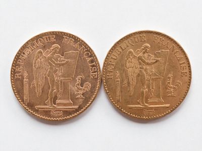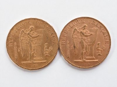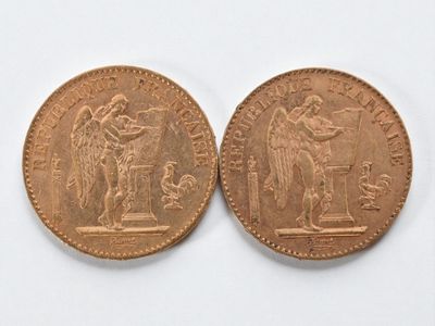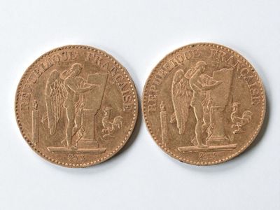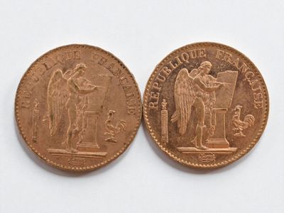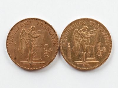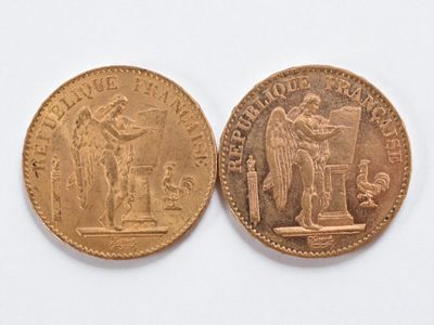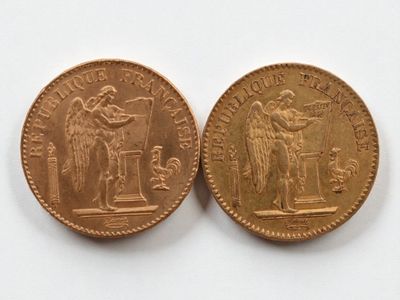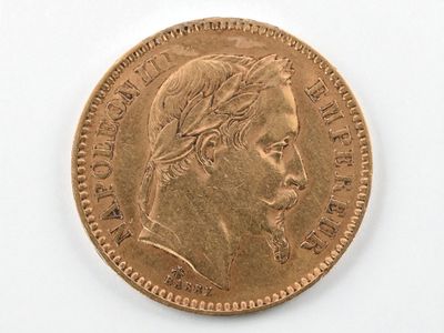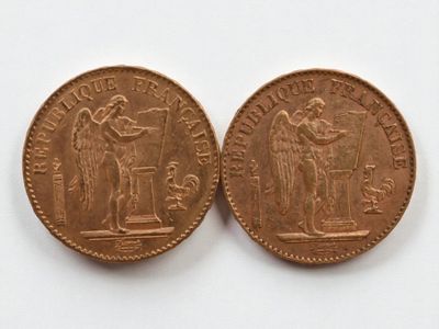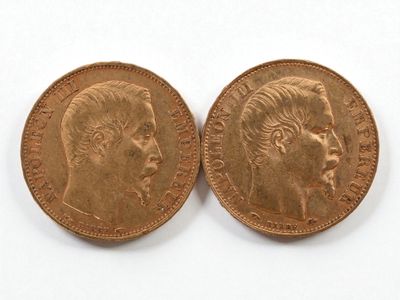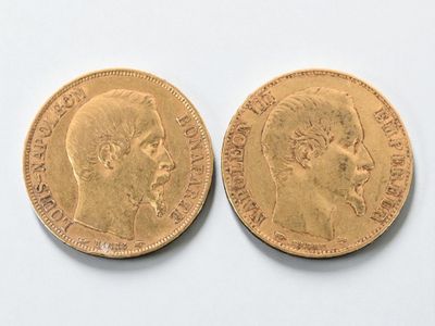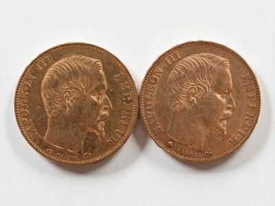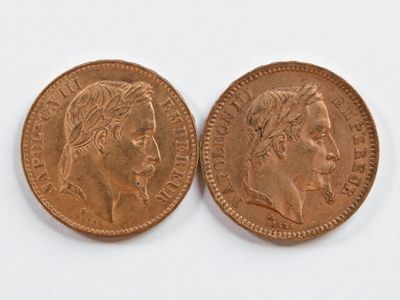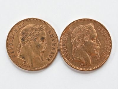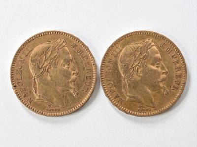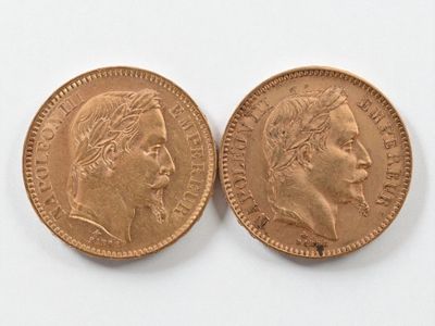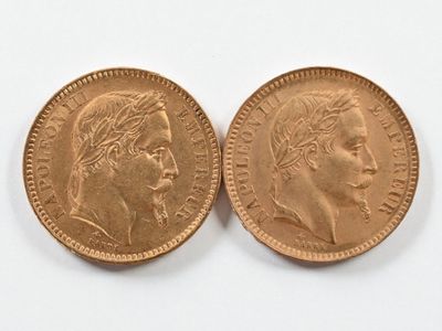 Two 20 franc gold Napoleon III head, 1866 and 1869.
