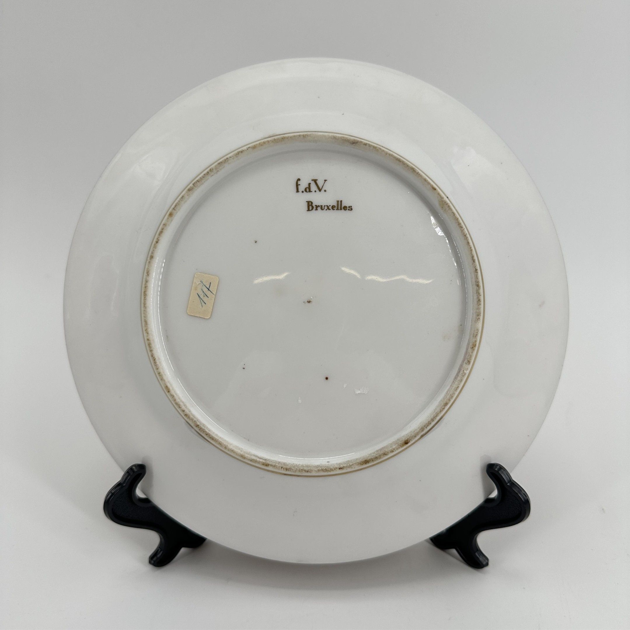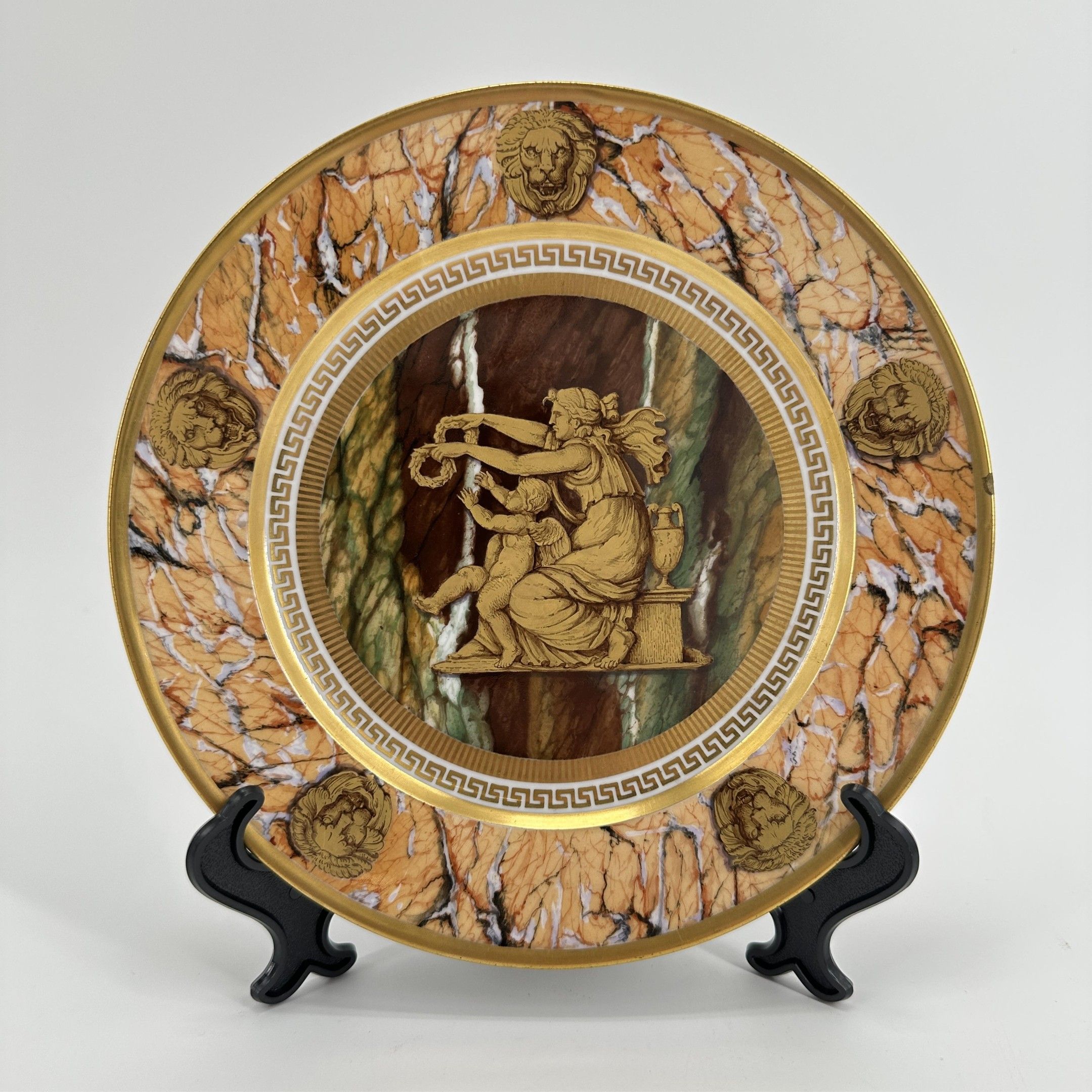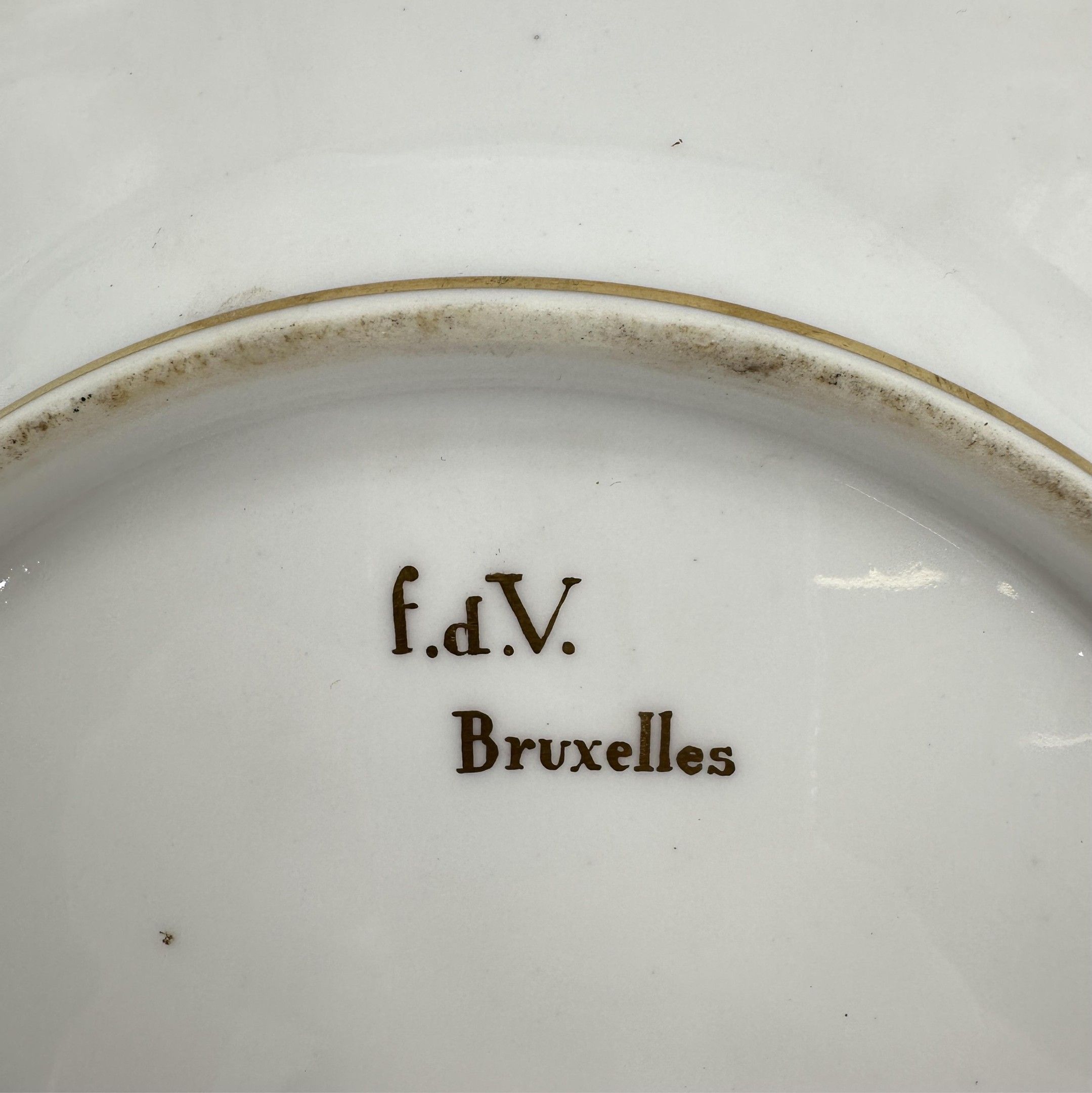 Brussels porcelain plate decorated with a gilded antique scene on a trompe-l'oeil faux marble background, the wing decorated with five lion heads on a trompe-l'oeil faux marble background. Mark on the reverse: f.d.V Brussels. There is a tiny chip on the rim (retouched).