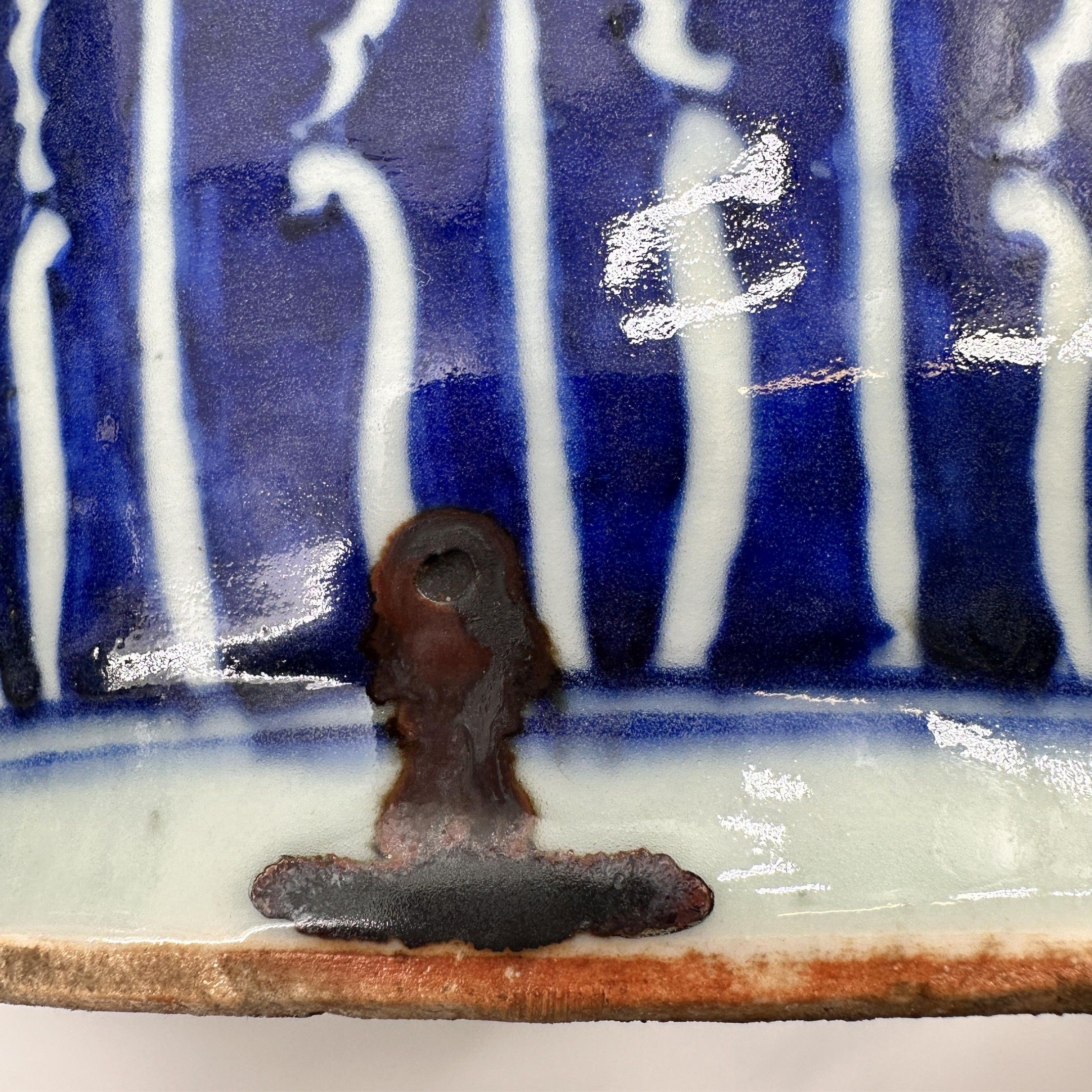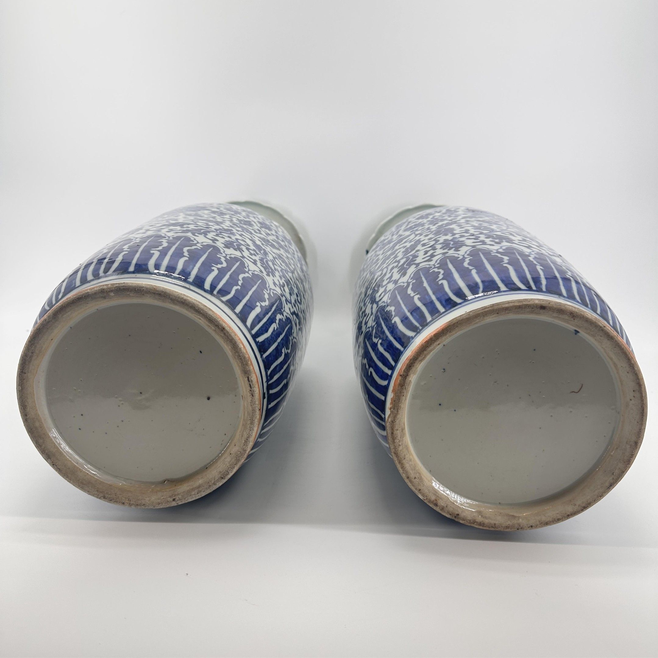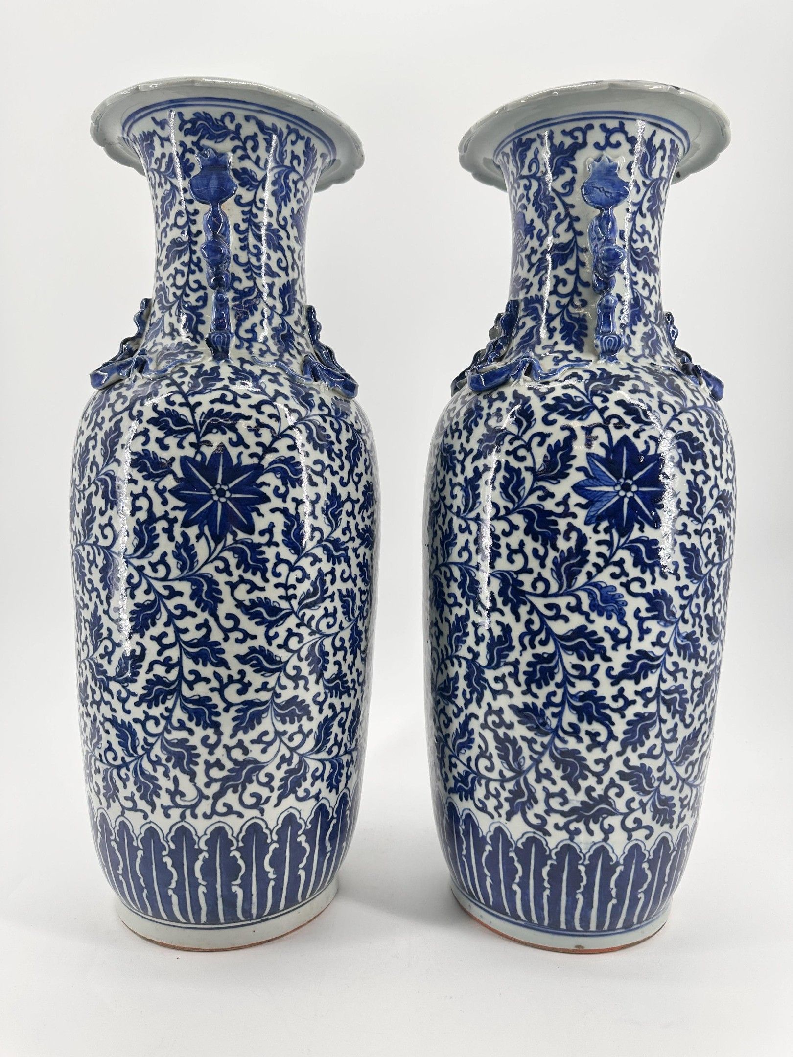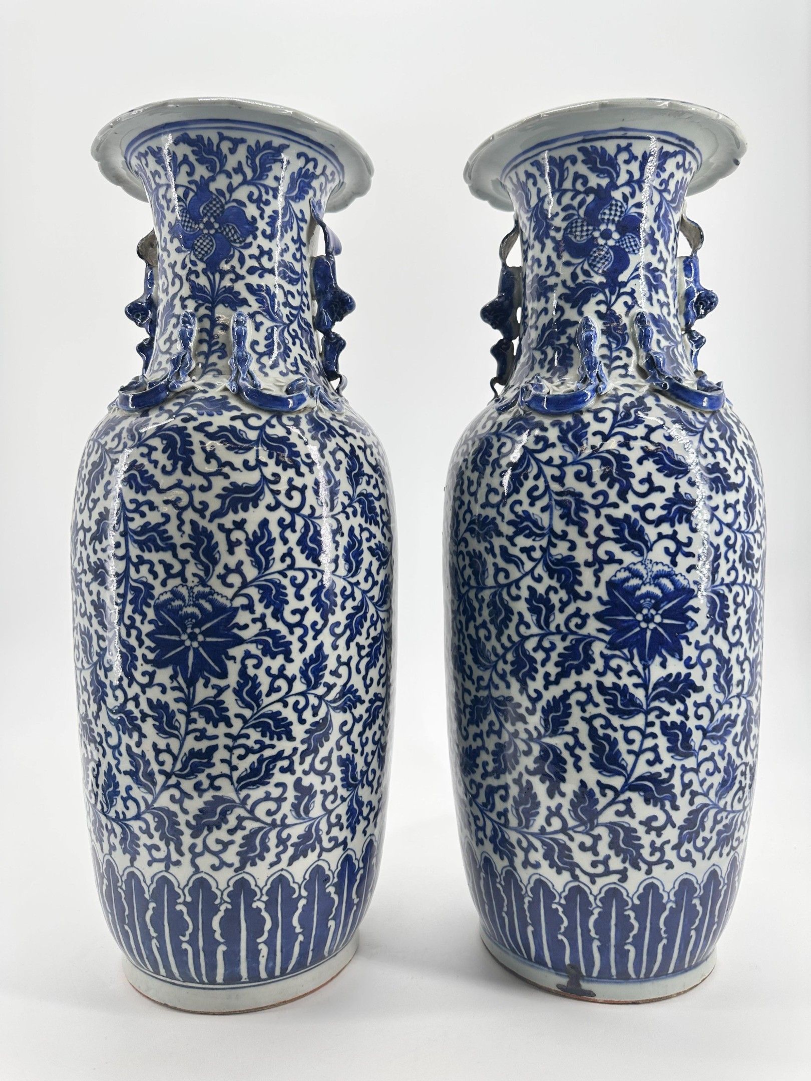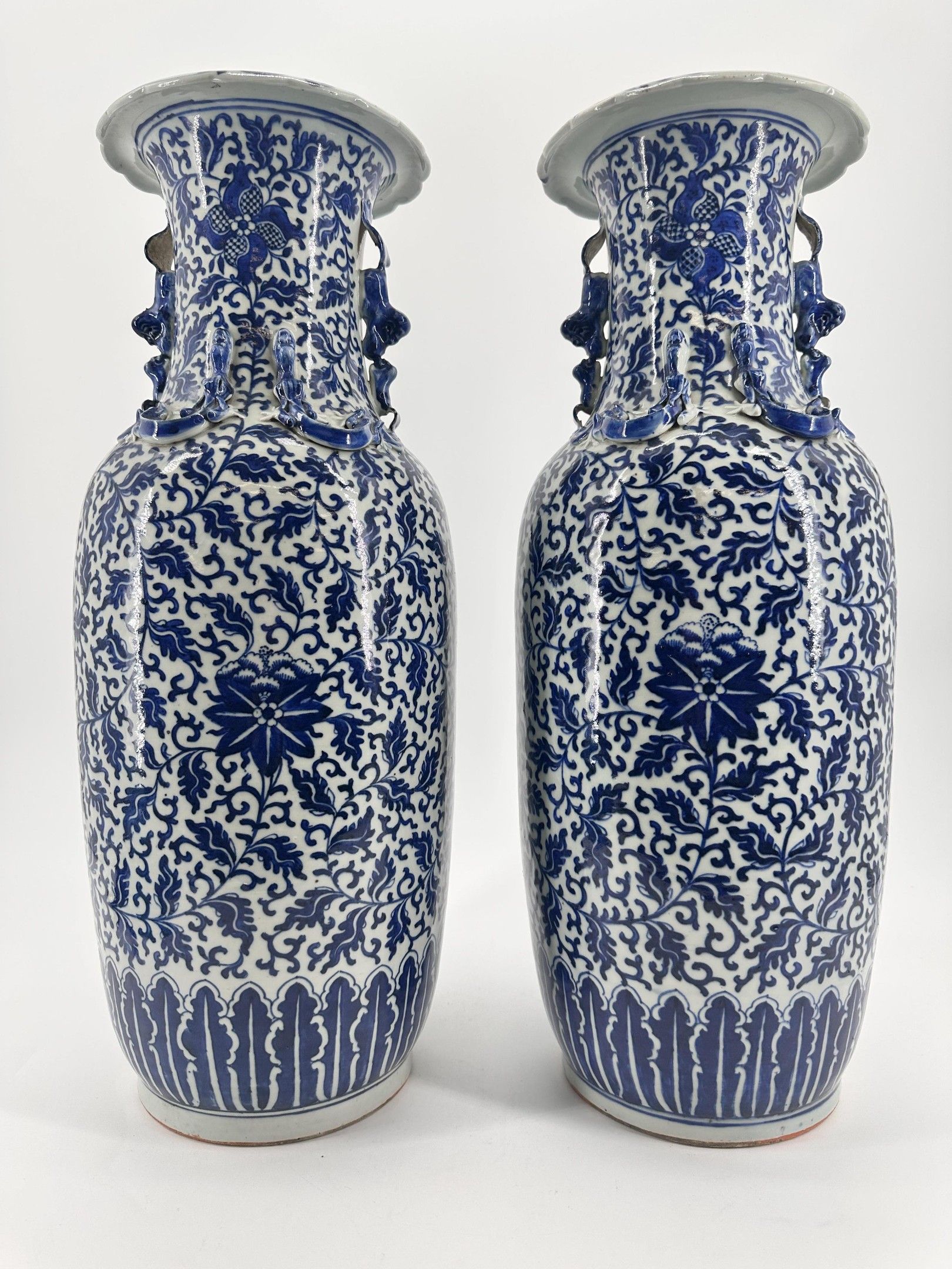 China, 19th century. Pair of porcelain vases with white-blue lotus and foliage decoration. Chilin dragons applied in the upper part, handles in the shape of Fô dogs. Height: 60 cm. Small firing deformation under the base of one of them.