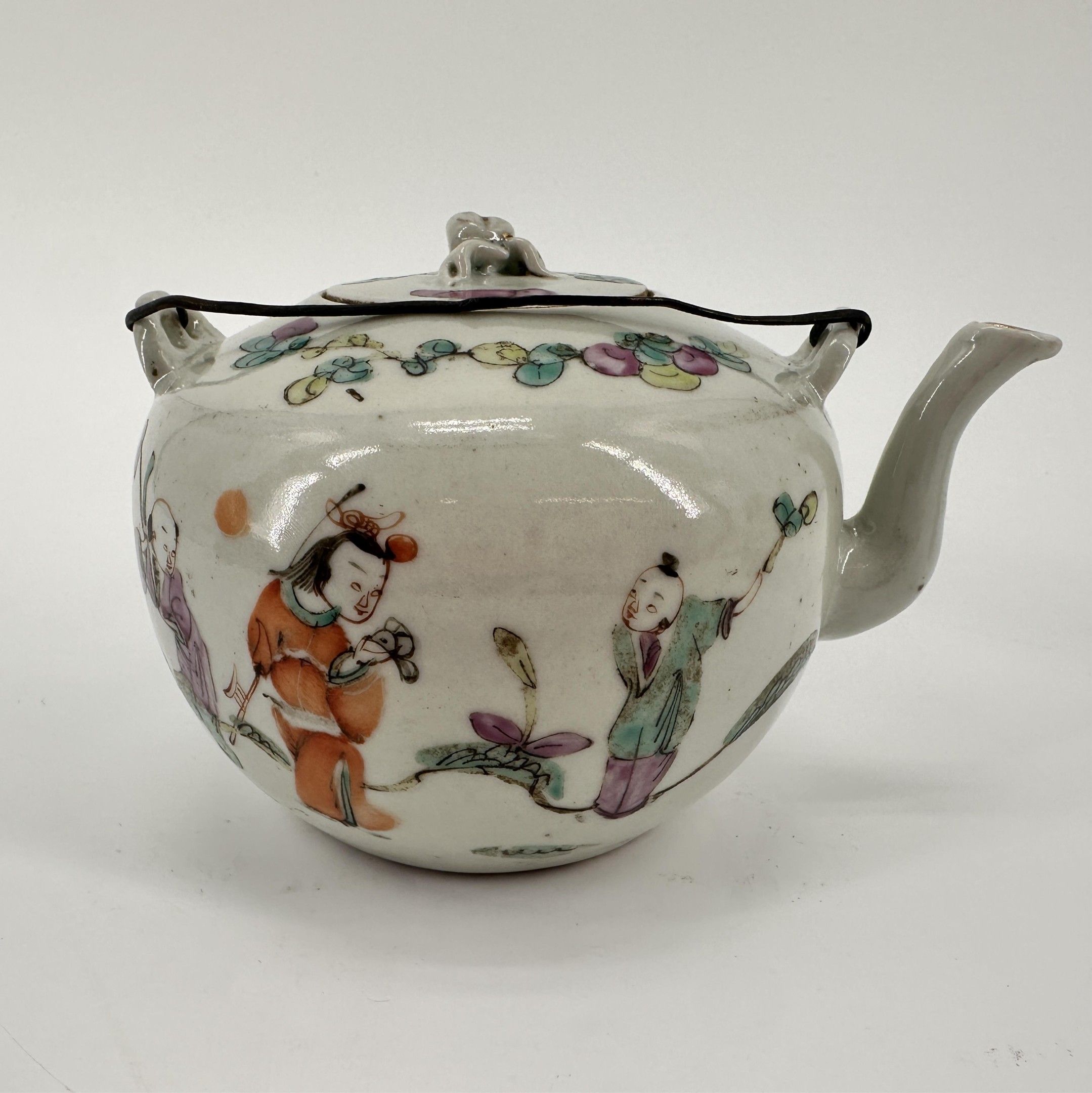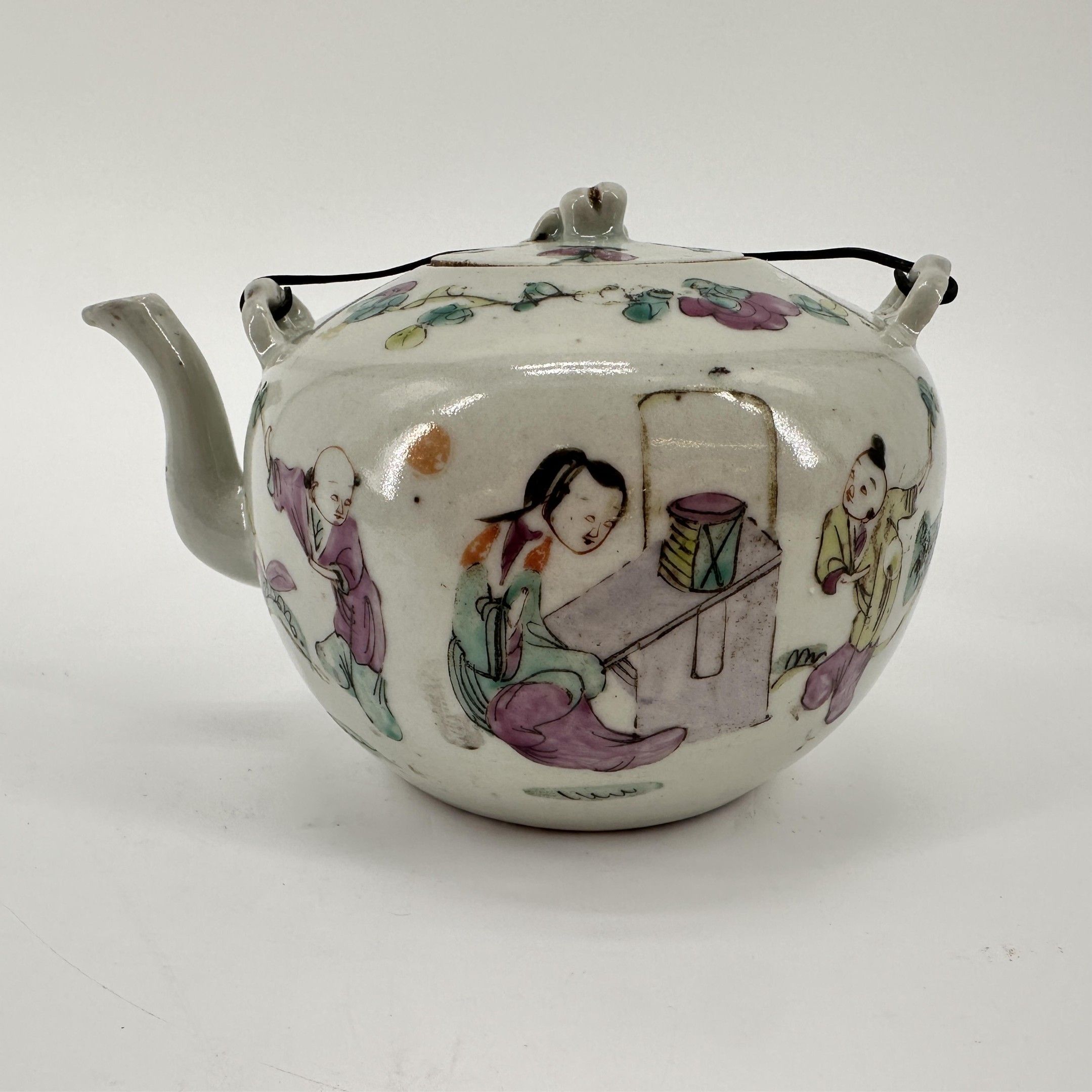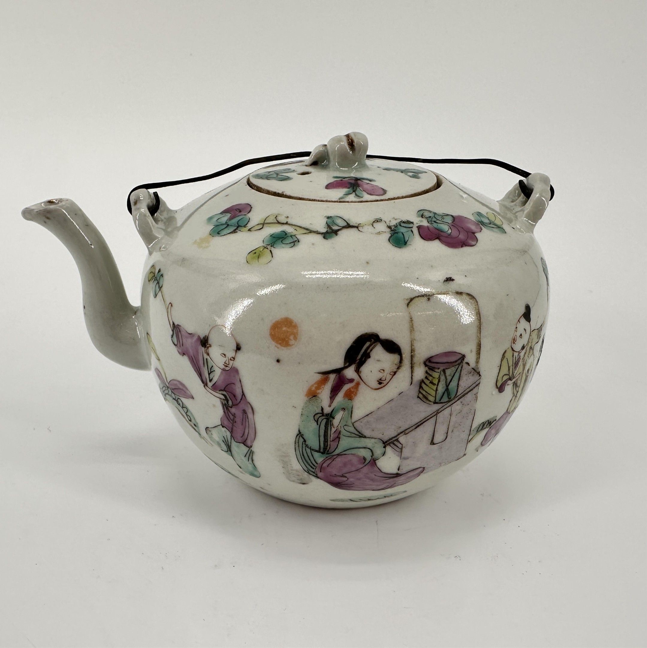 A Famille rose porcelain and enamel teapot decorated with a young woman and children. China, Tongzhi period, 19th century. Height : 10,5 cm. Expert : Cabinet Ansas-Papillon-de Léry. Paris.