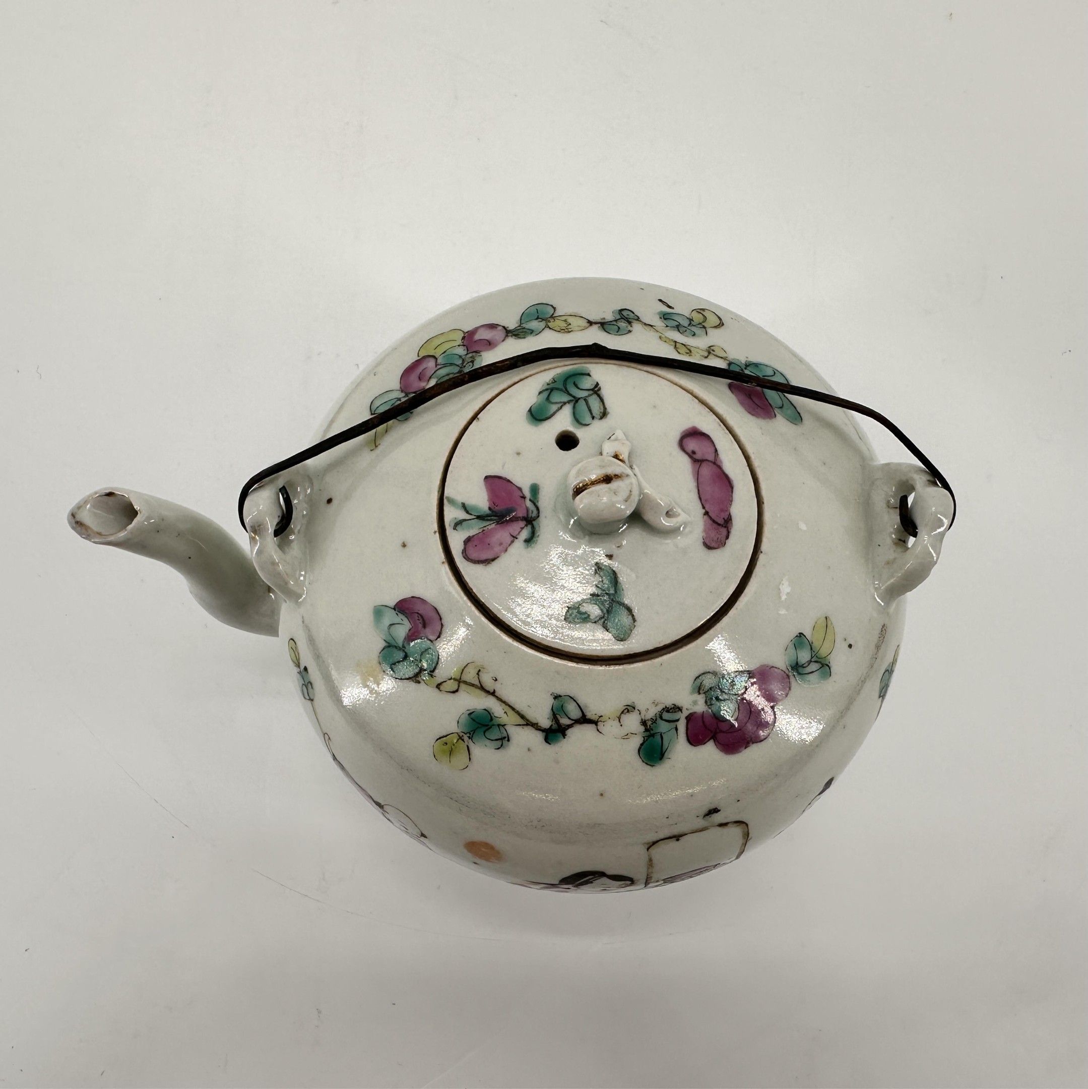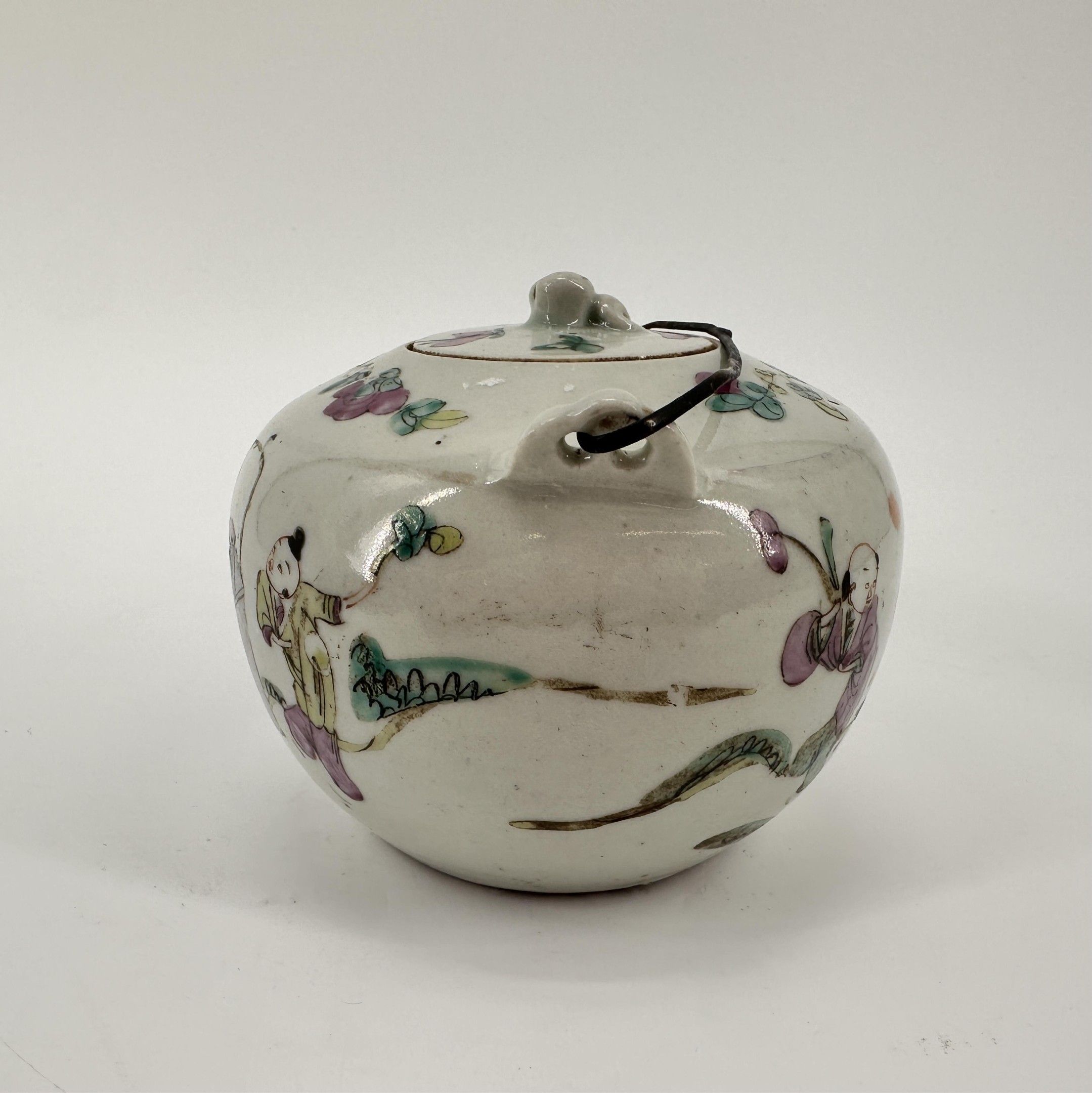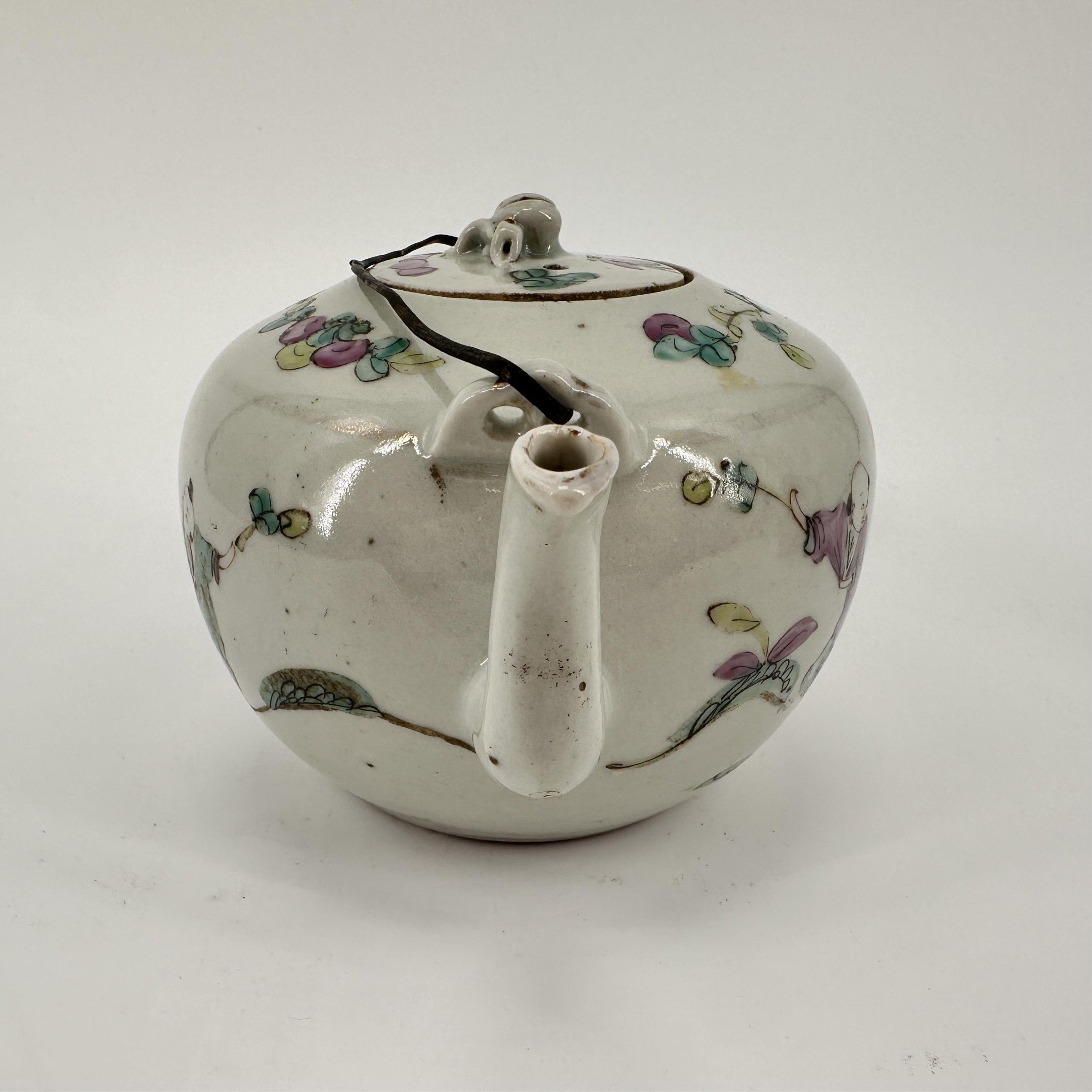 A Famille rose porcelain and enamel teapot decorated with a young woman and children. China, Tongzhi period, 19th century. Height : 10,5 cm. Expert : Cabinet Ansas-Papillon-de Léry. Paris.