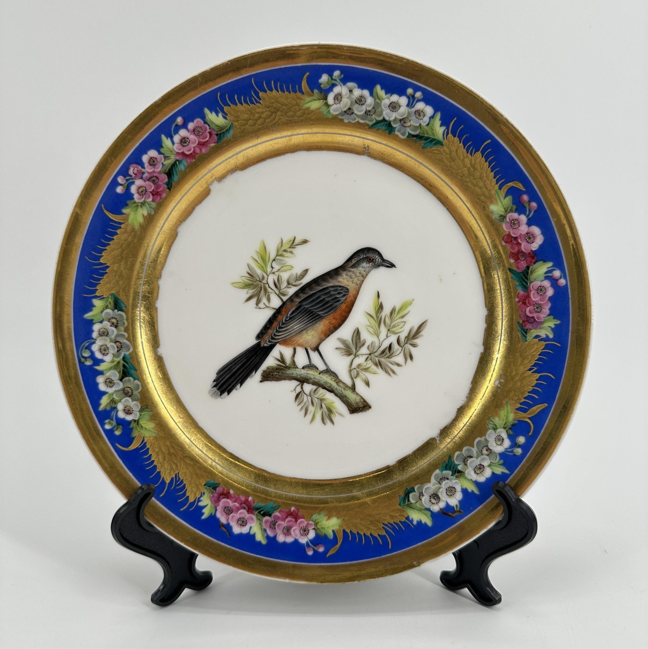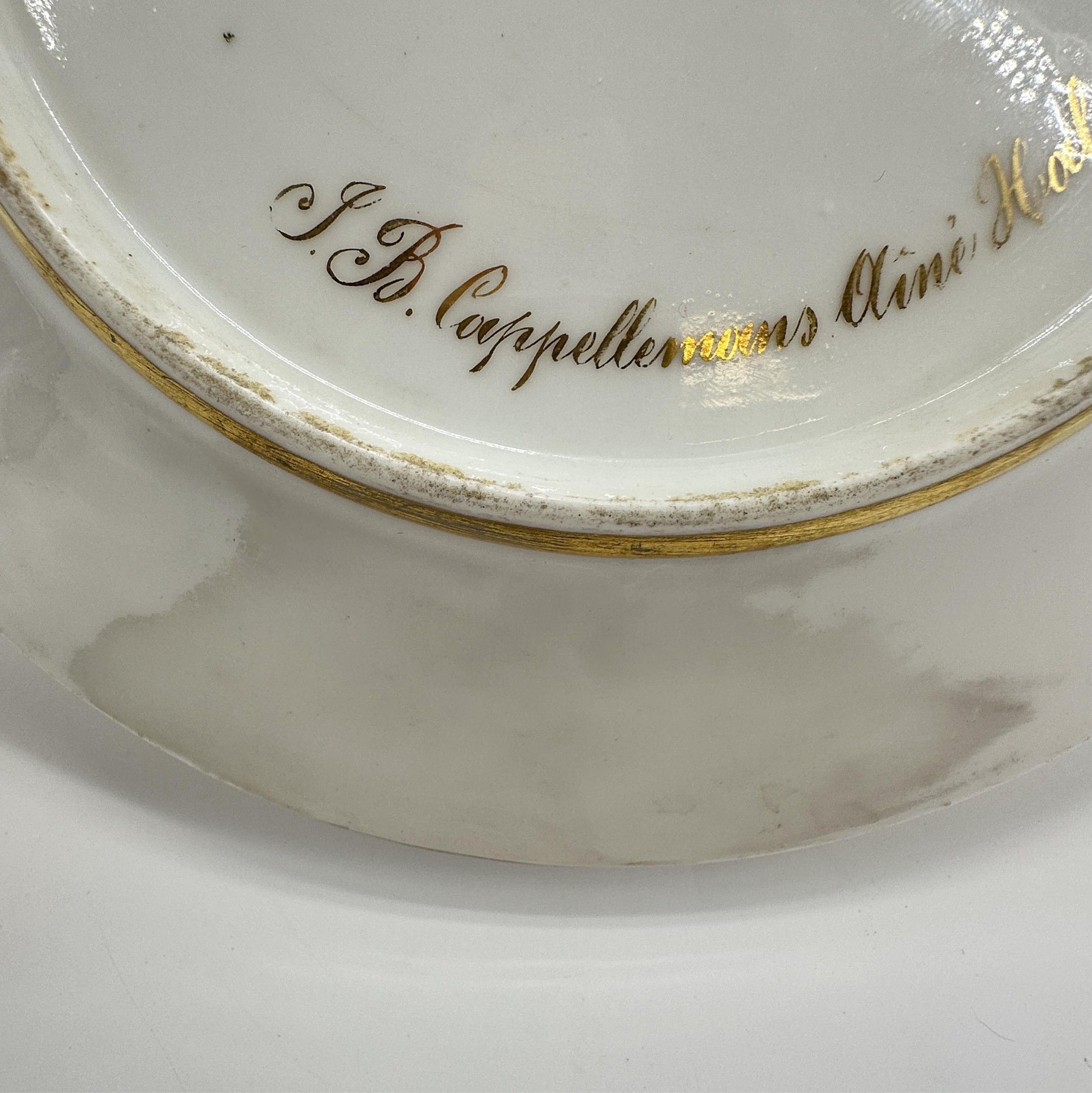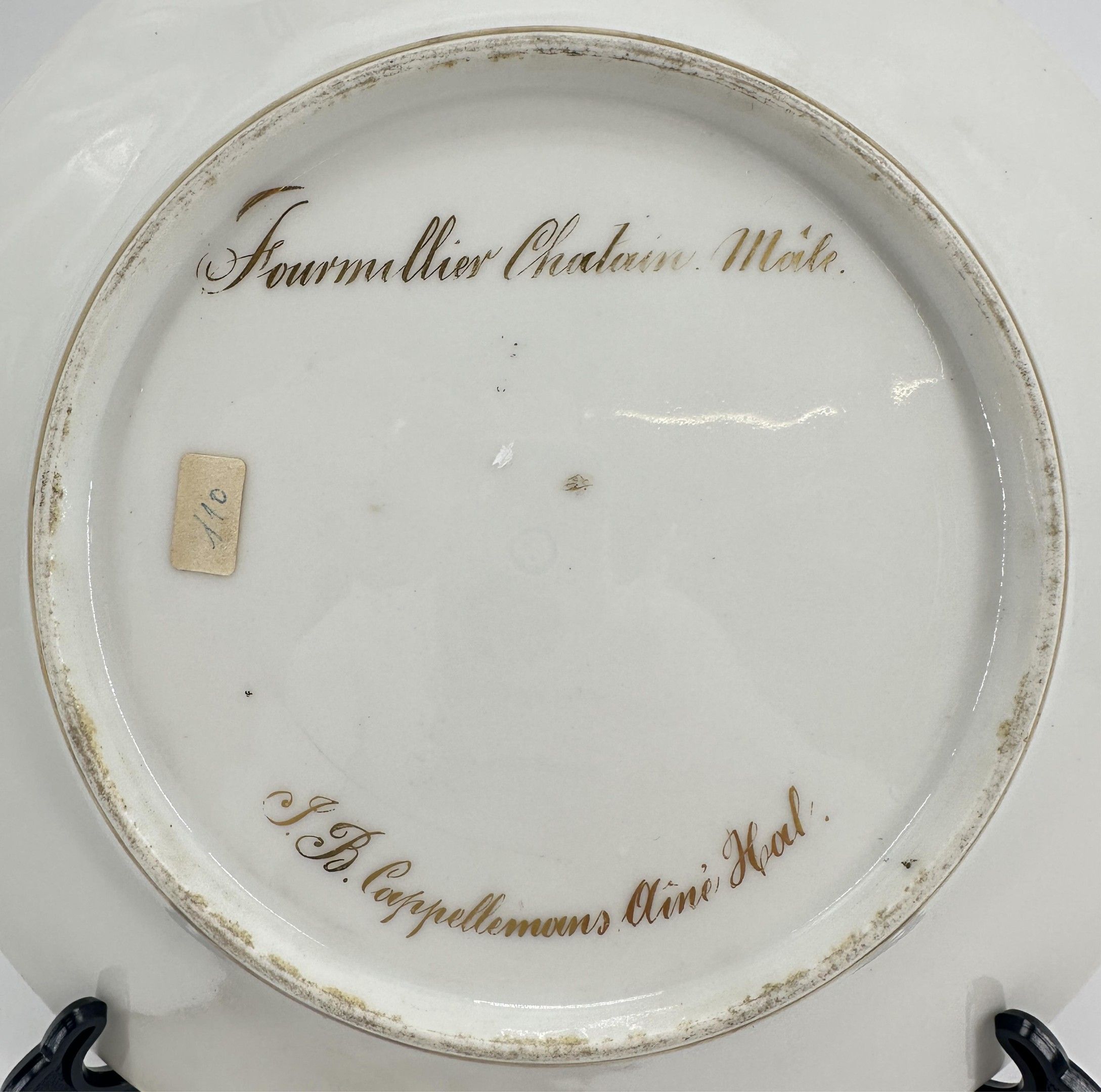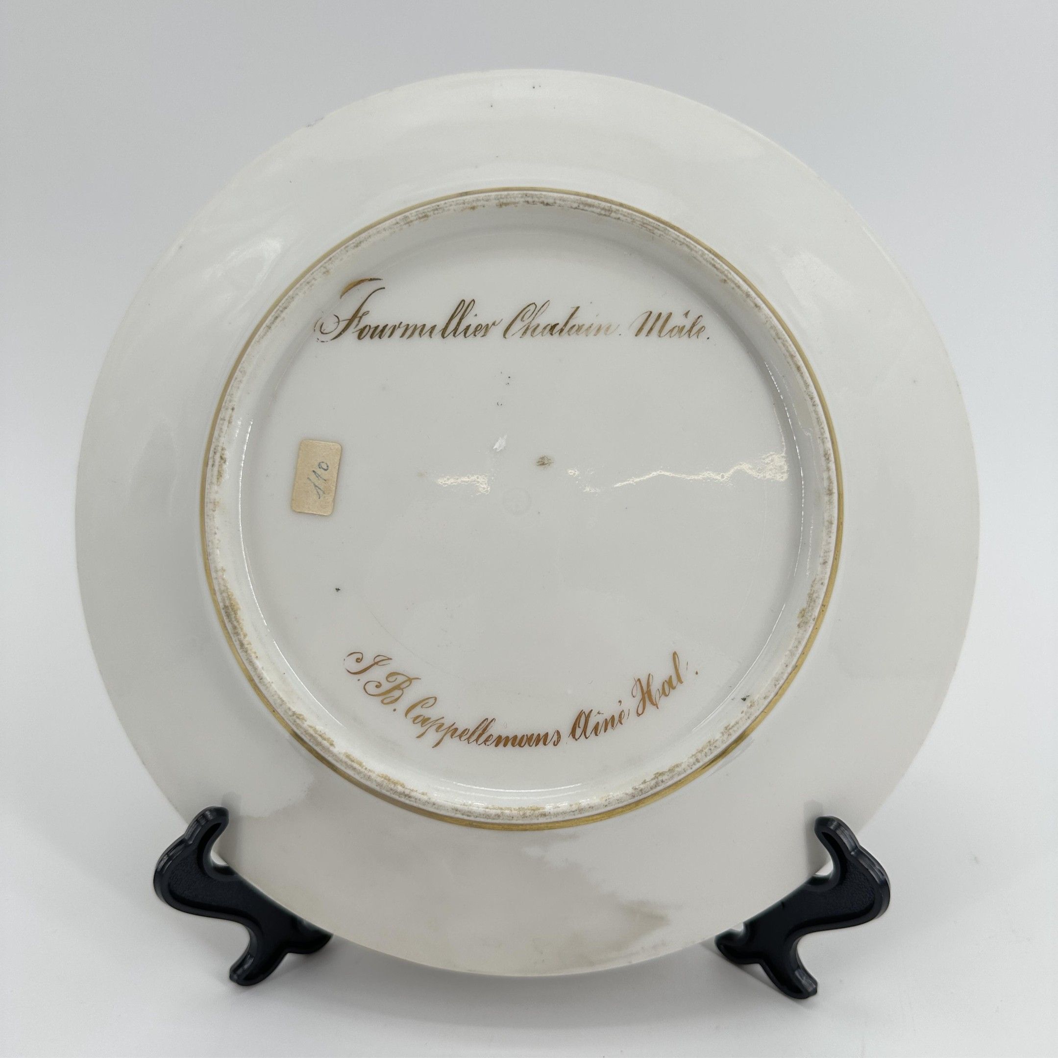 Brussels porcelain plate decorated with a Buffon's bird, manufactured by Cappellemans Aîné. Mark in gold on the reverse: "Fourmilier châtain mâle" J.B Cappellemans Aîné Hal. There is a discreet restoration to the gilded edge. The incident is minimal, but there is a more imposing trace of retouching on the reverse.
