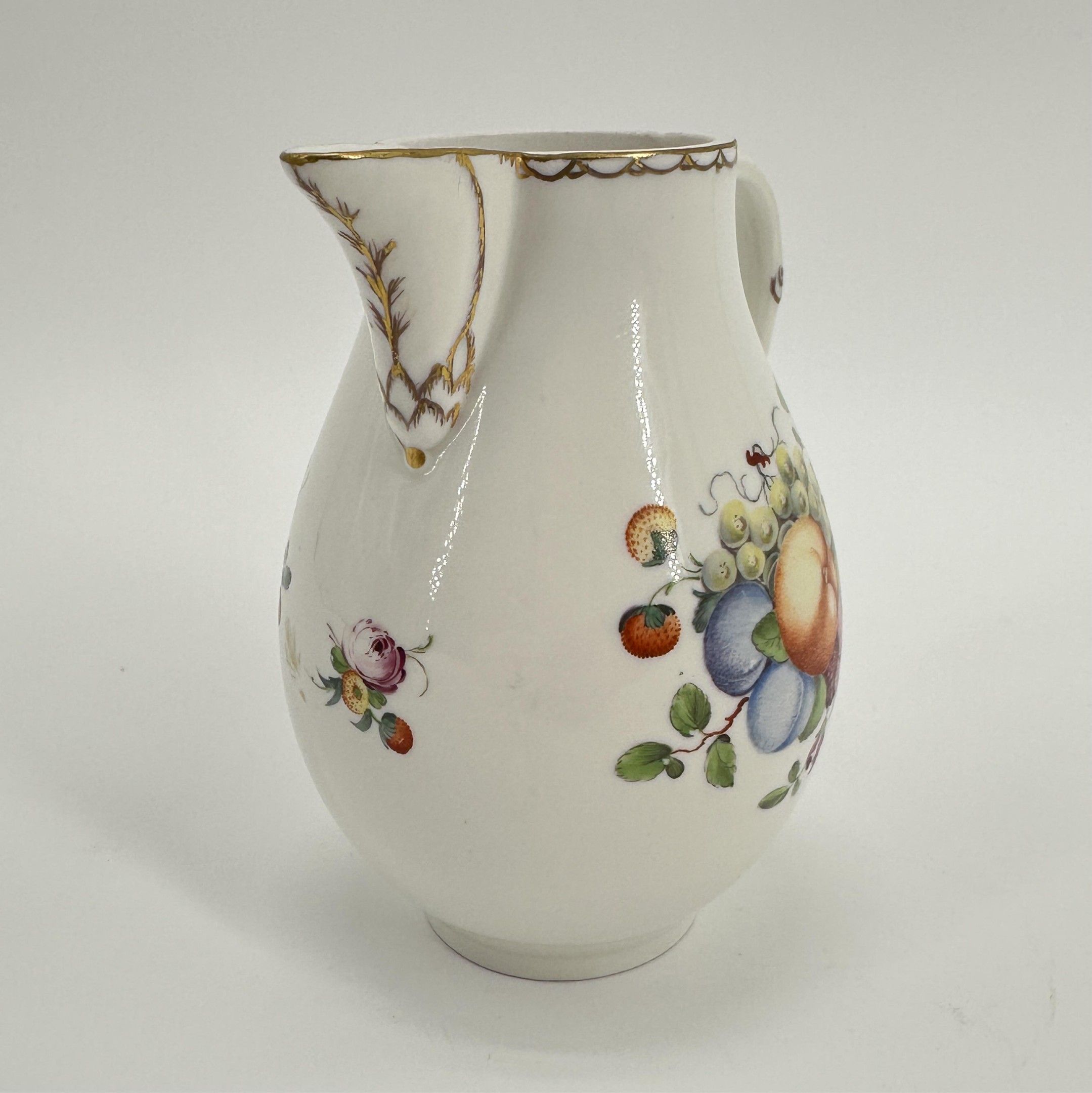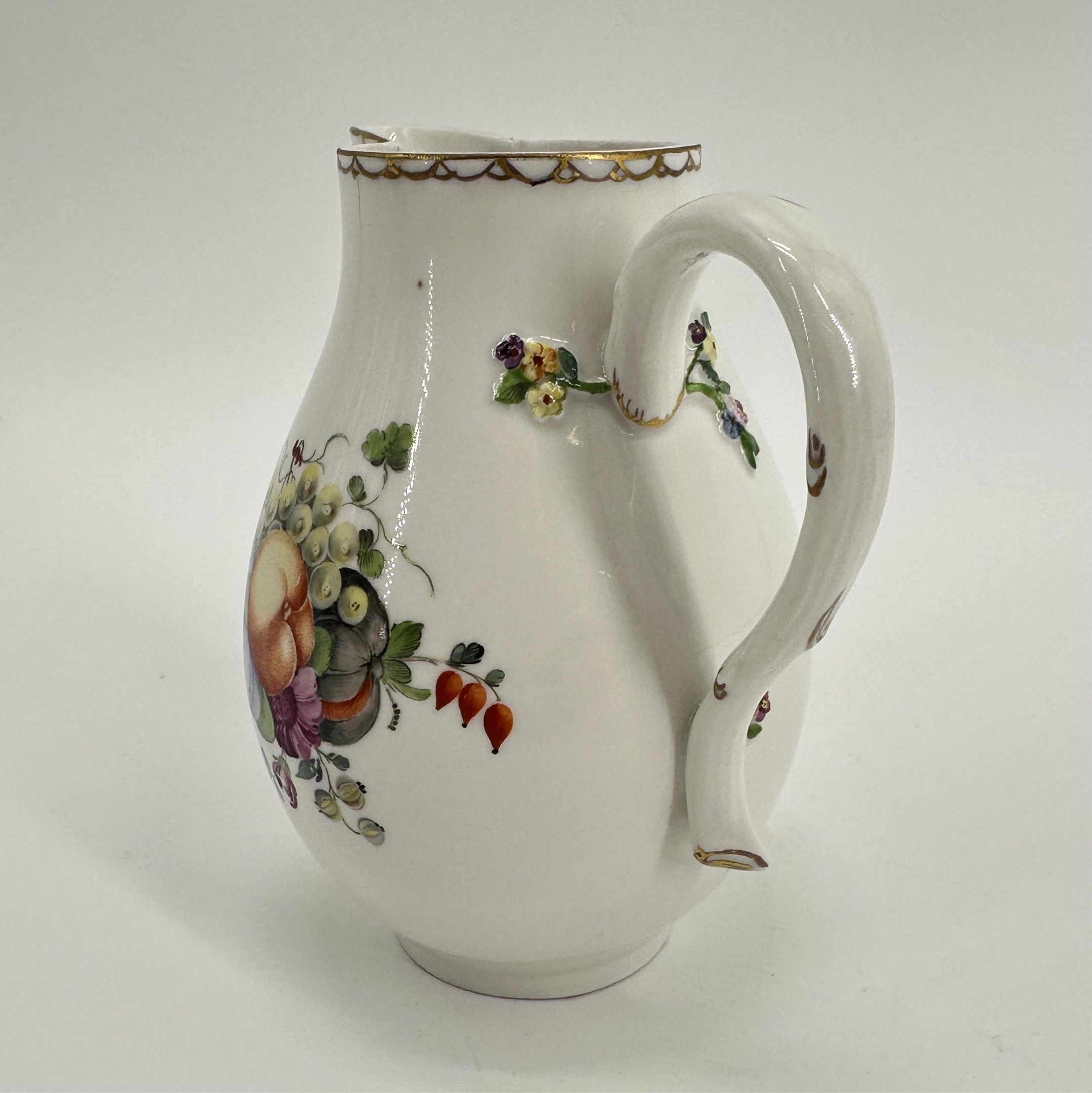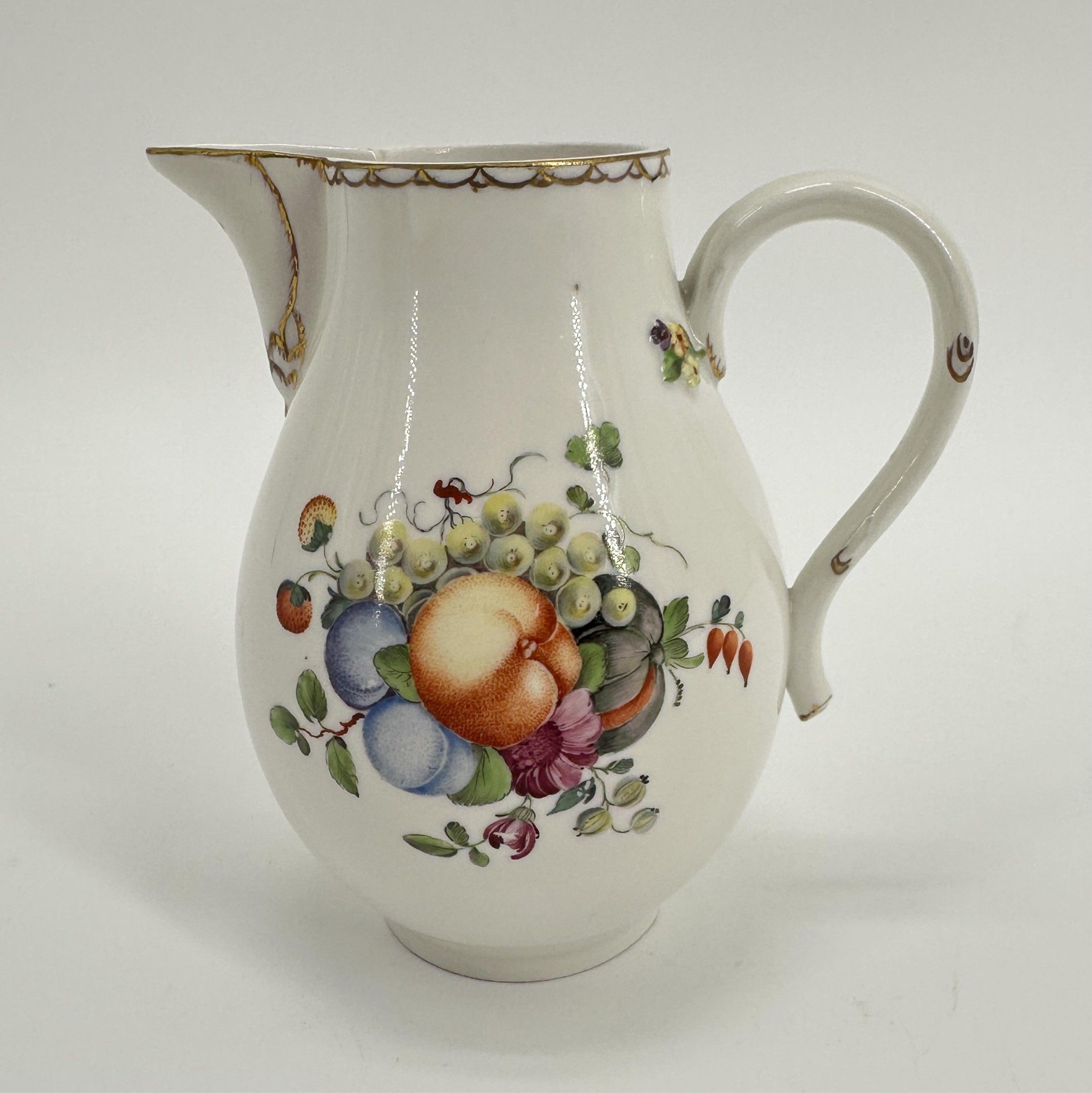 A late 18th / early 19th century porcelain milk jug decorated with flowers and fruit. Probably made in The Hague, stork mark. Height: 14 cm.