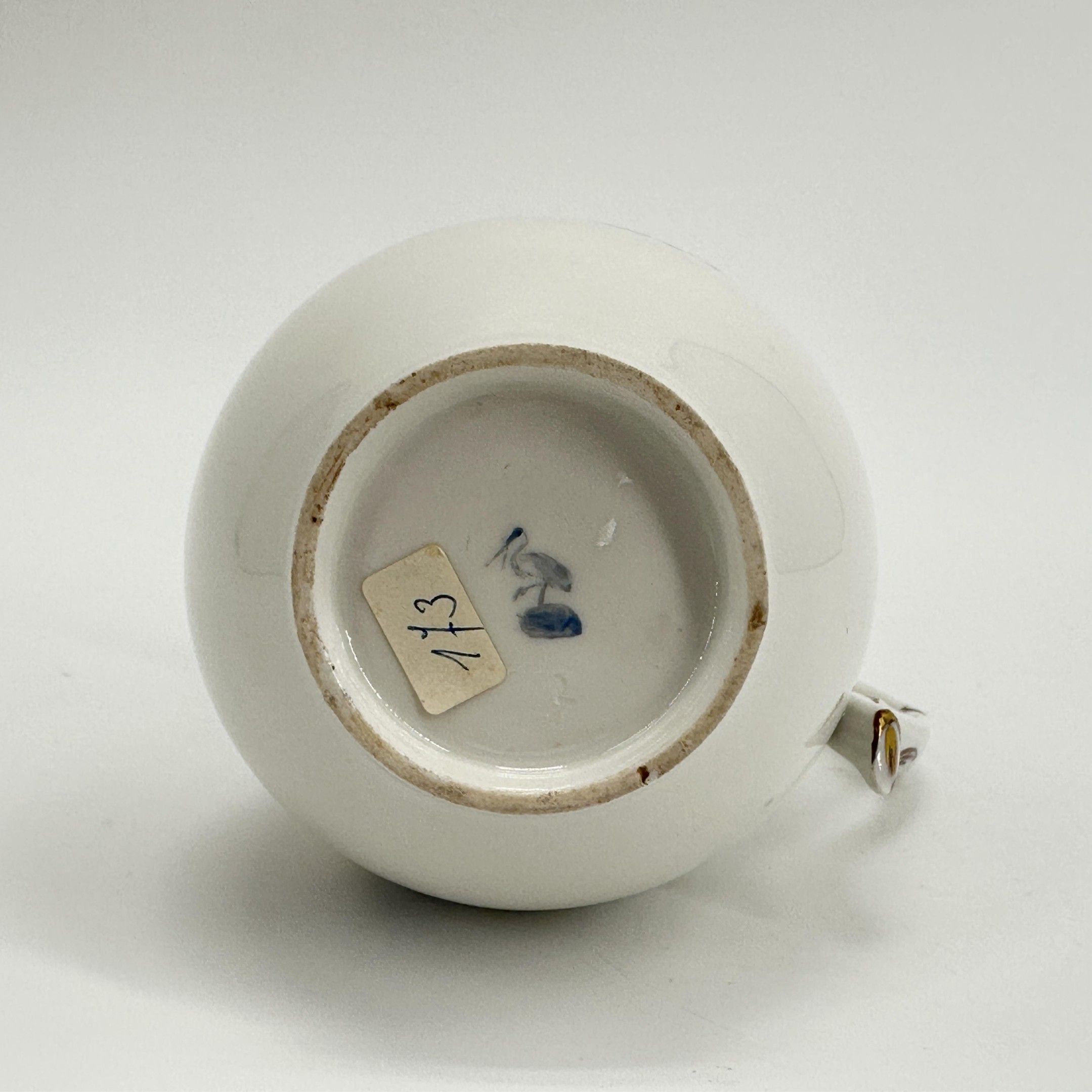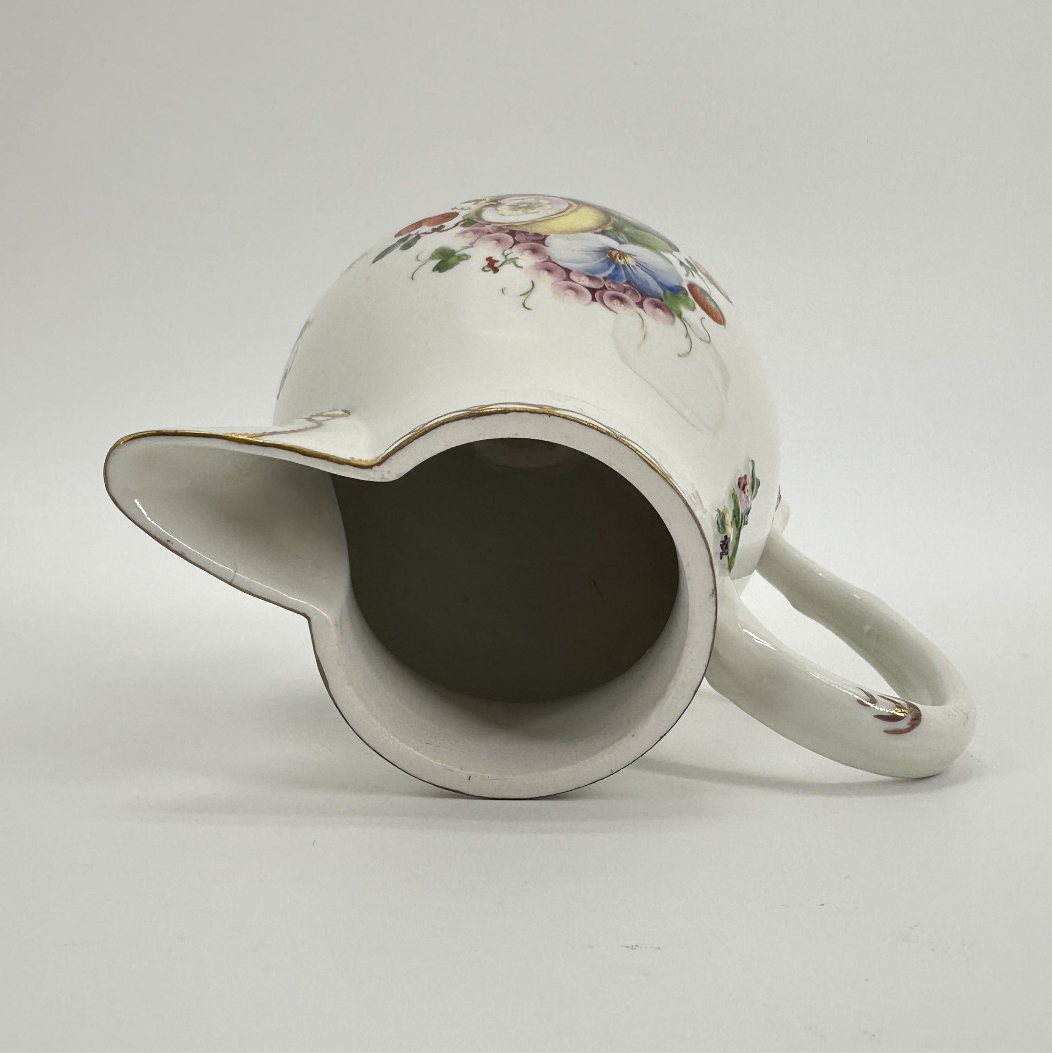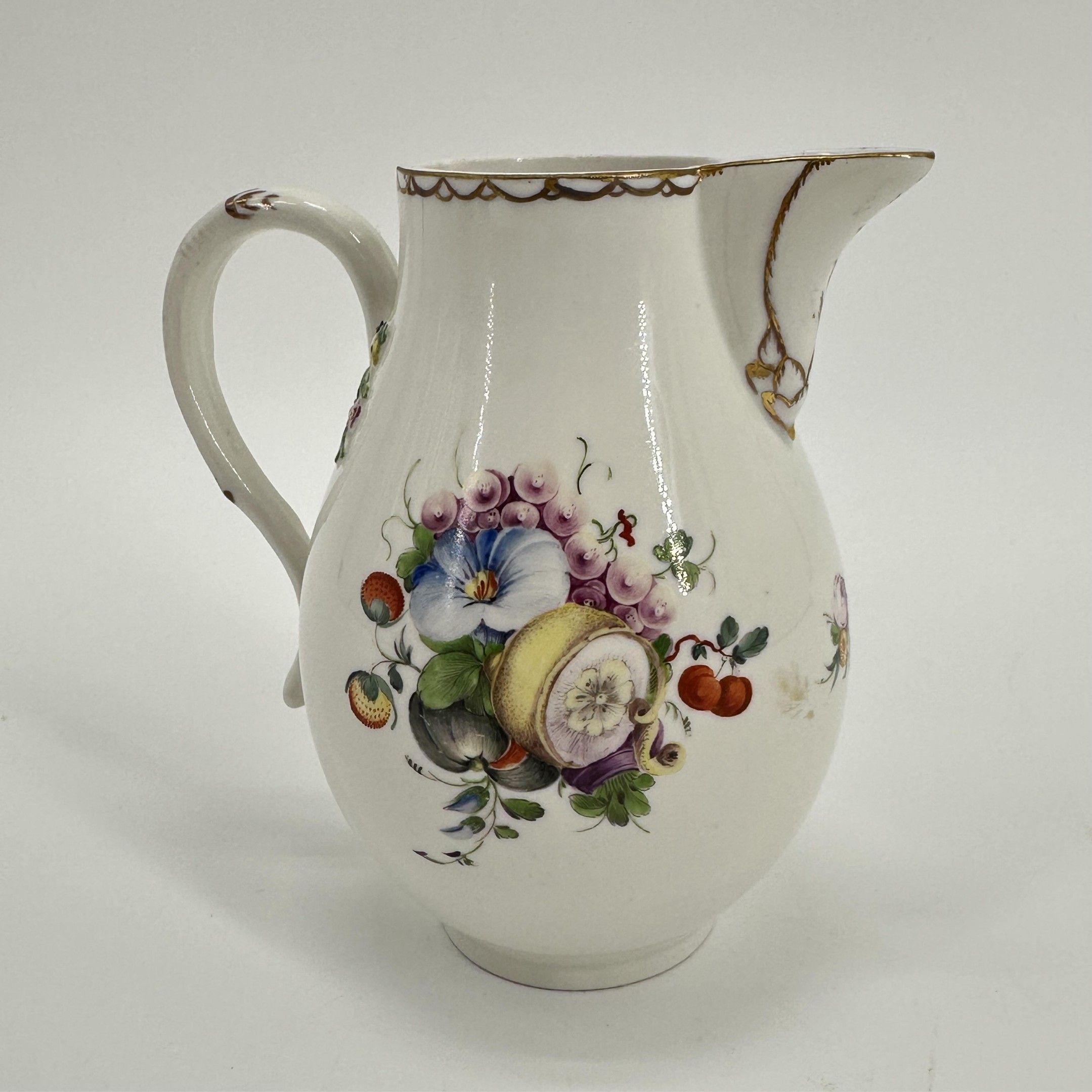 A late 18th / early 19th century porcelain milk jug decorated with flowers and fruit. Probably made in The Hague, stork mark. Height: 14 cm.