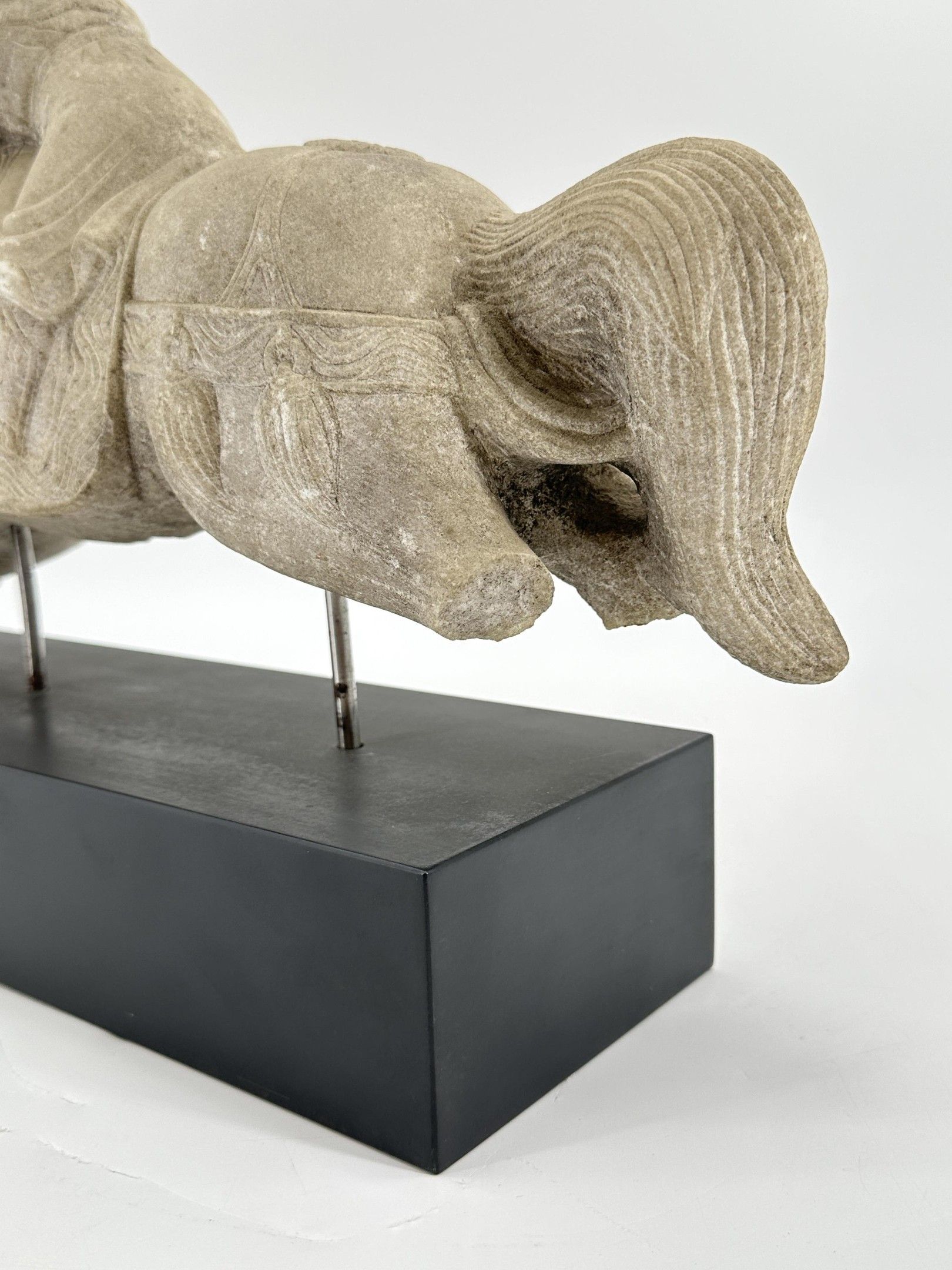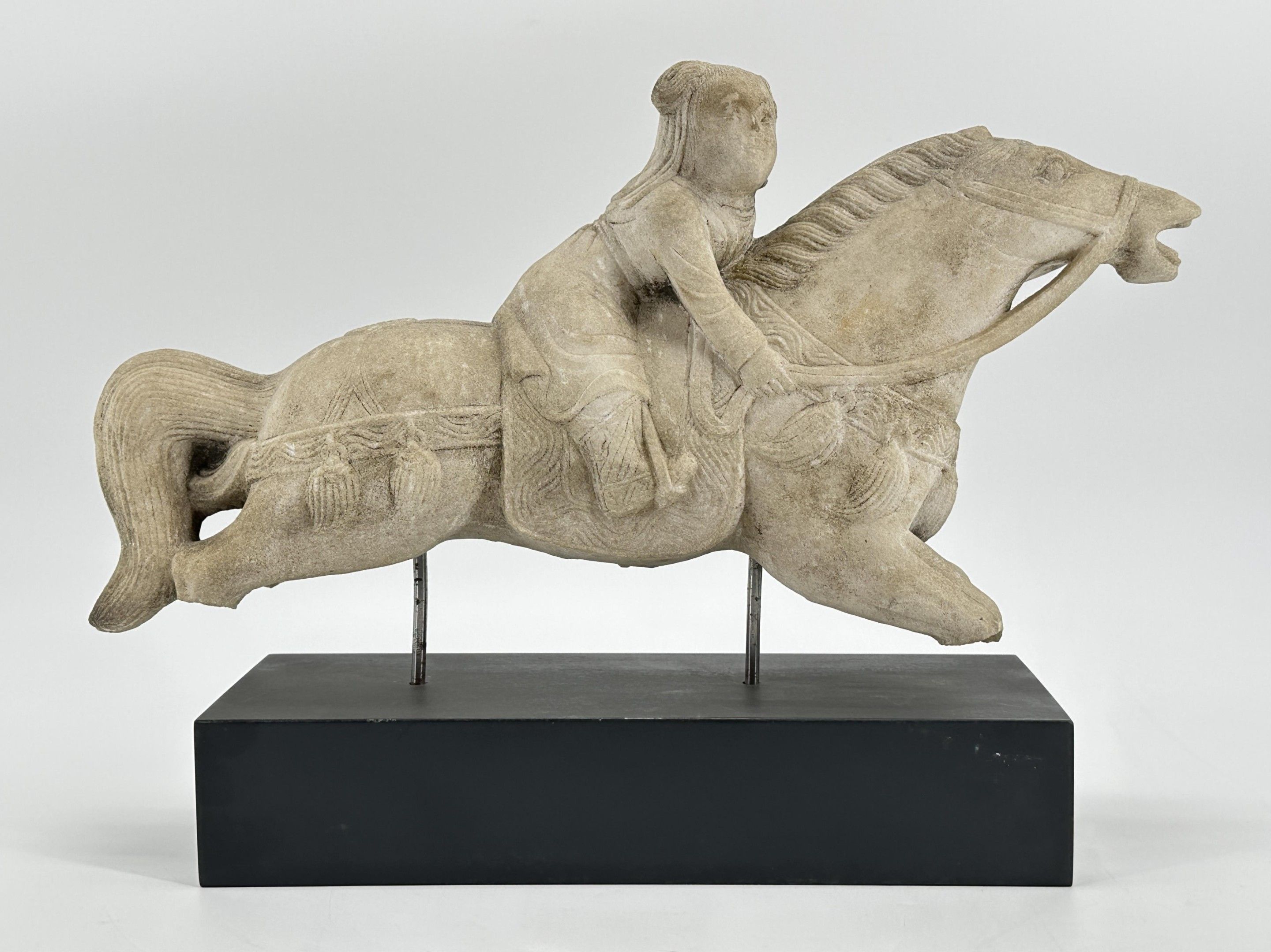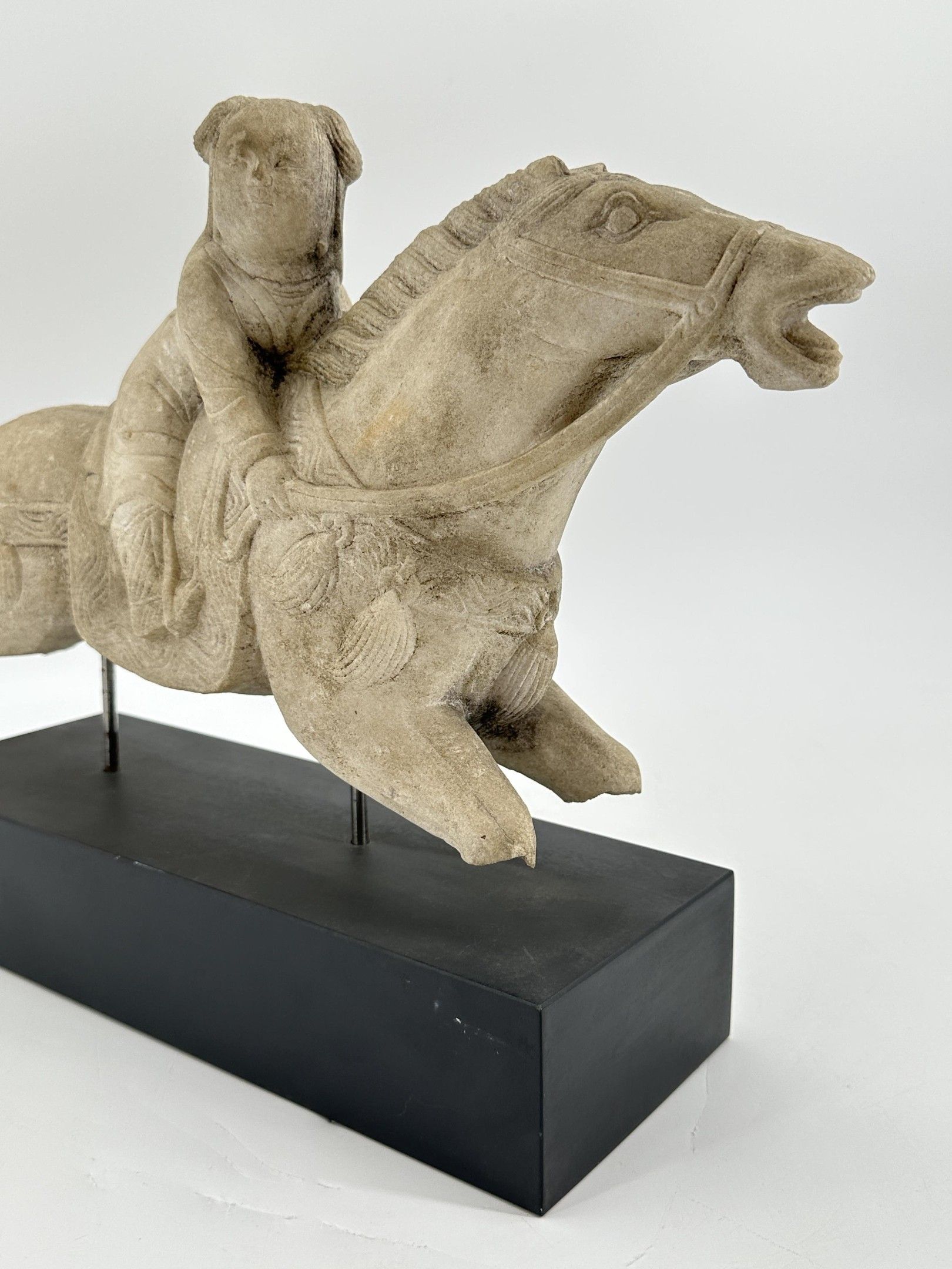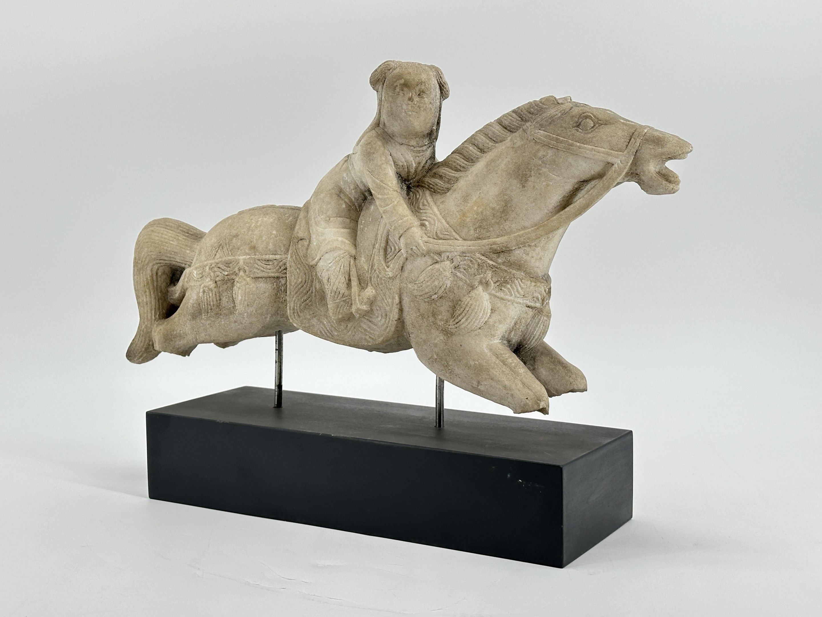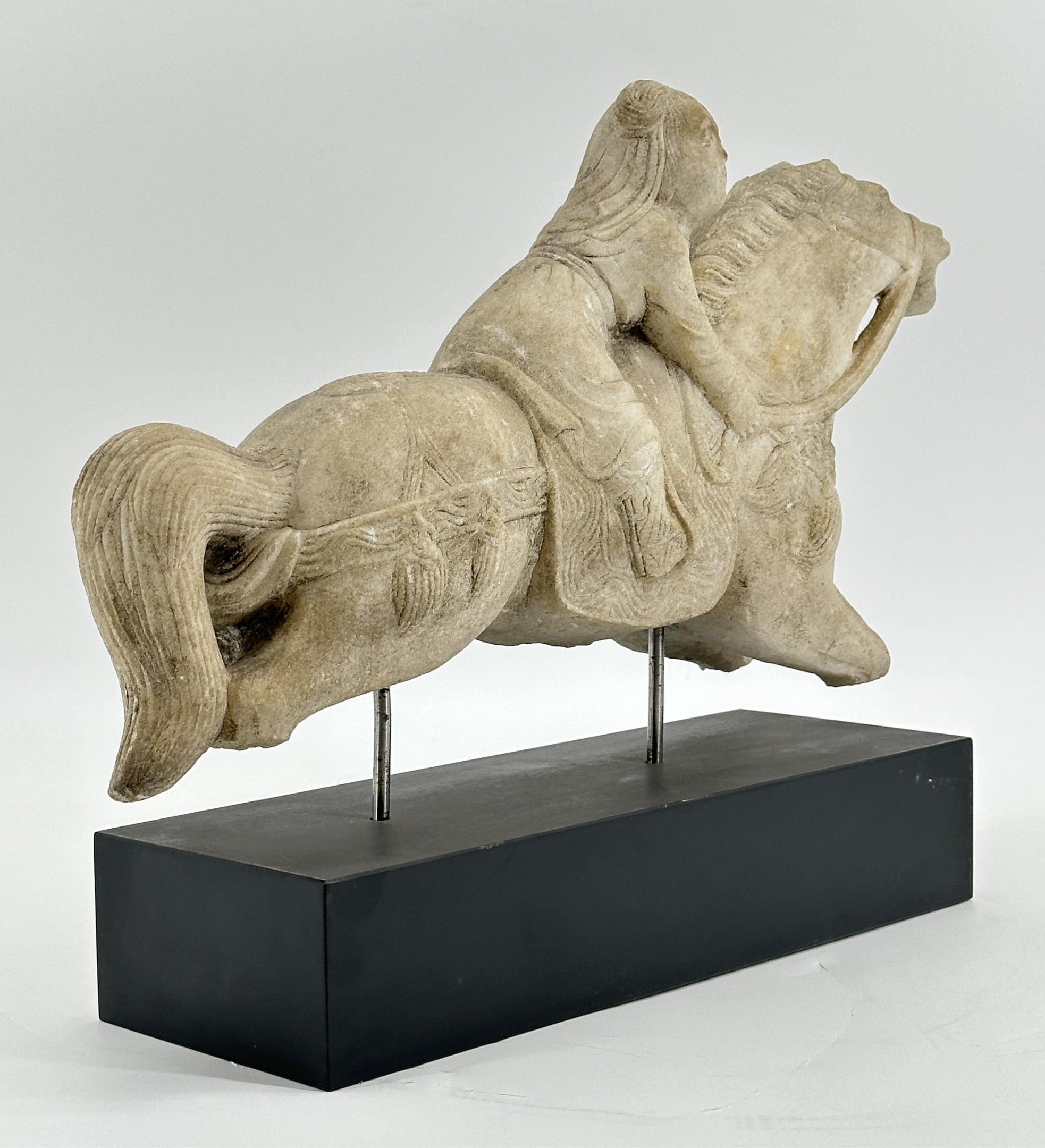 A white marble group with a beautiful patina representing a young rider on a galloping horse. China, 19th century. Height: 22 cm. Length: 44 cm. Expert : Ansas-Papillon-de Léry, Paris.