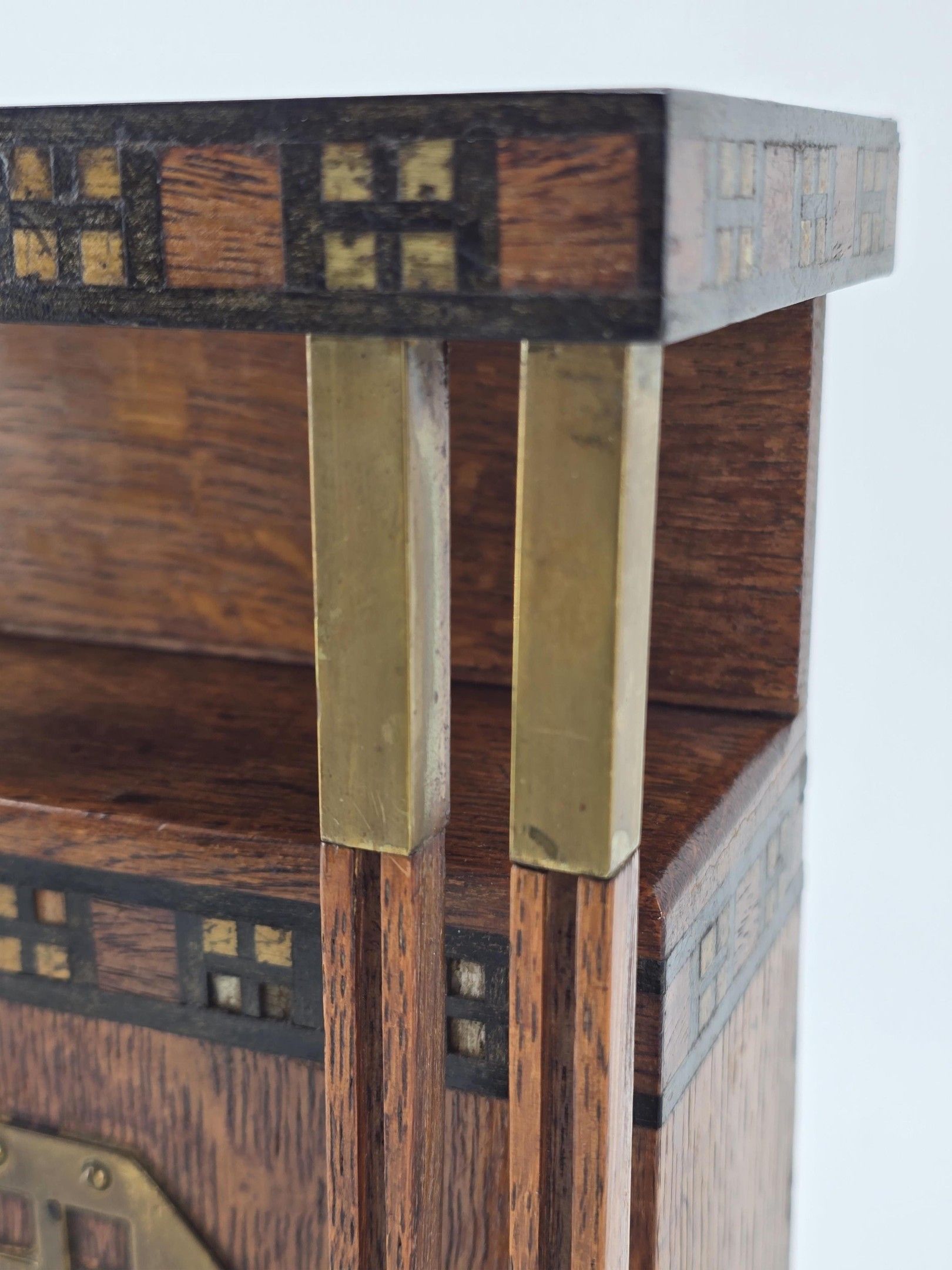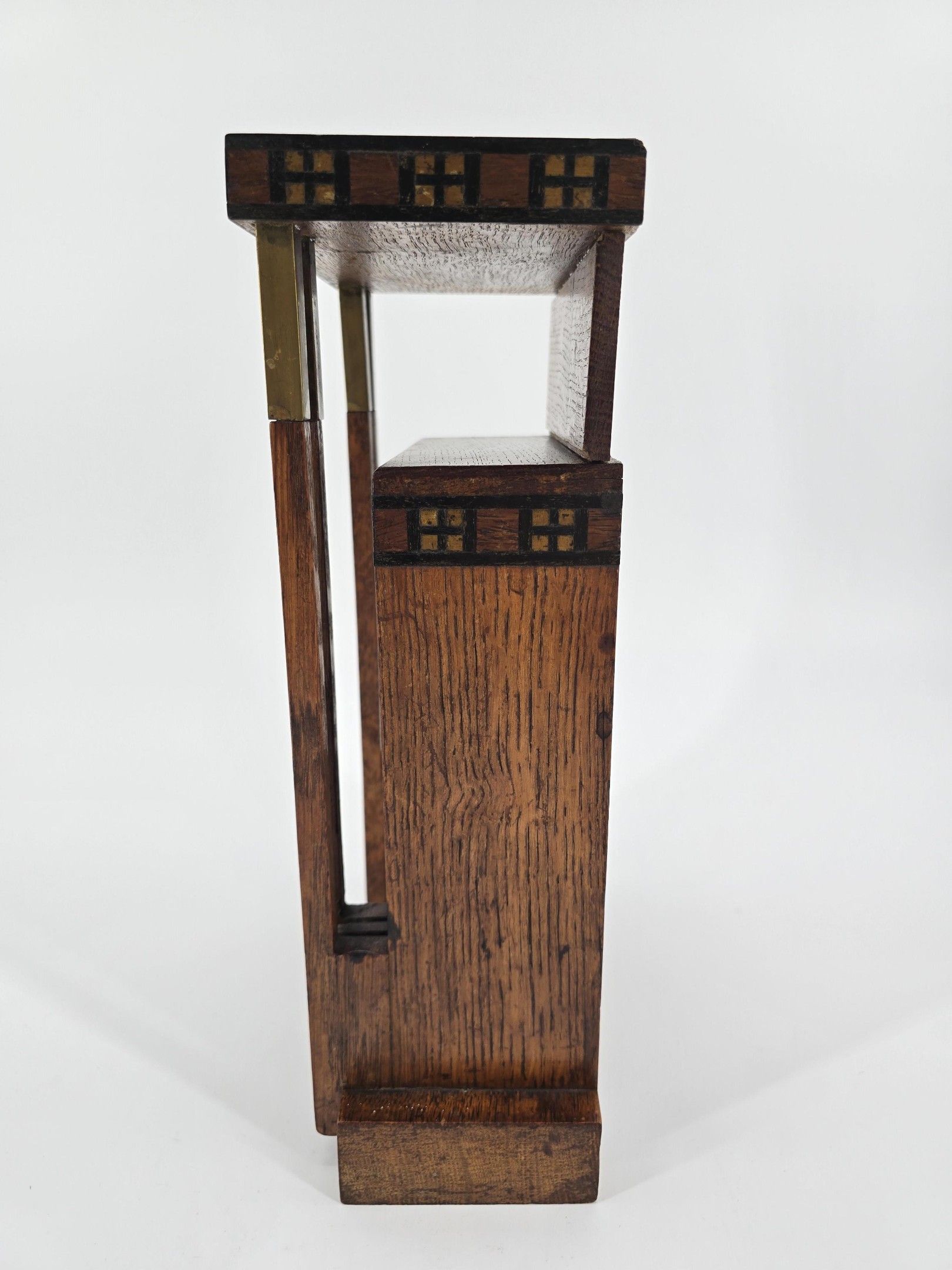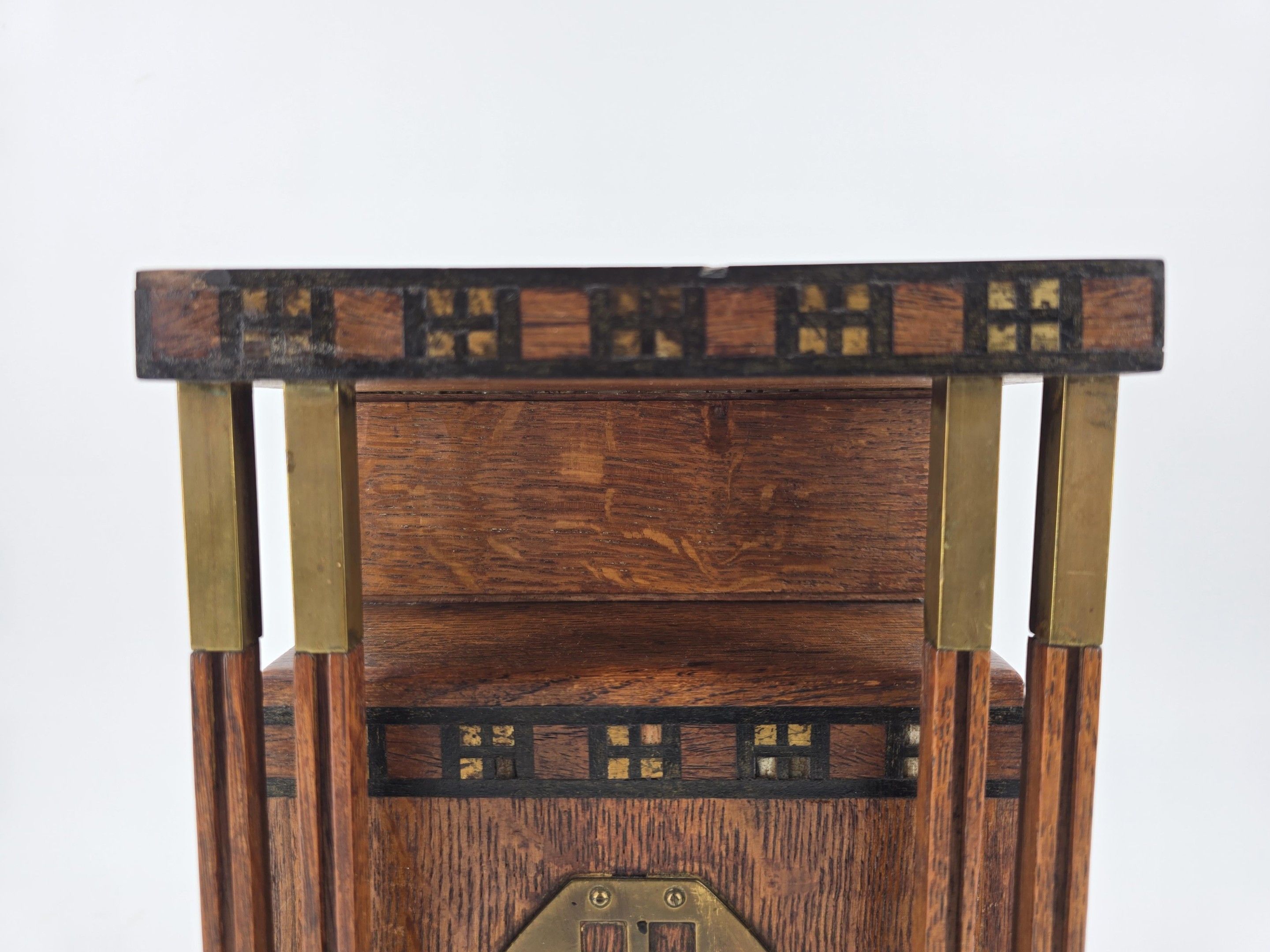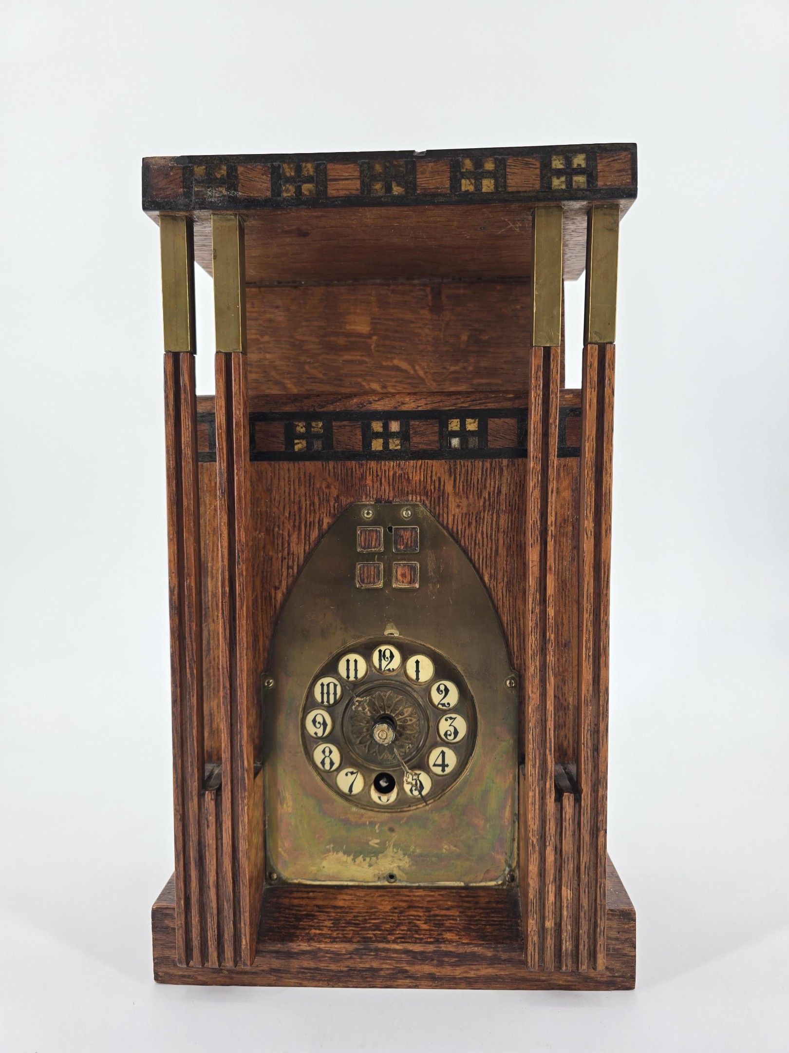Gustave SERRURIER-BOVY (1858-1910). Rare clock by Gustave Serrurier-Bovy, dating from the period 1907-1910. Serrurier-Bovy designed his furniture in series, each corresponding to an identifiable stylistic period. Each period is characterised by recurring decorative elements that serve as an implicit signature. For example, the so-called Silex series (1904-1905) is characterised by the use of light-coloured woods, coloured square-head screws (blue, green or red), and the application of repeated stencil motifs throughout the furniture. The extremely rare clock shown here is the only one known to date. Provenance: Mosan sale 2018, private collection from Liège. It clearly bears the hallmarks of a late phase in Serrurier-Bovy's work, around 1910. This period corresponds to the end of his career, with limited production from the Liège factory. The ornamental elements confirming this attribution are as follows: -Mosaic inlay of small contrasting squares of wood, forming a checkerboard pattern. This motif appears on a famous buffet-vitrine reproduced on a postcard dated 1910 showing the showroom on rue de la Joie in Liège (see Jean-Grégoire Wathelet, Serrurier-Bovy, Atelier Vokaer, Brussels, p. 102). The same motif is repeated on the doors of the shop windows (see p. 106), marking the transition from Art Nouveau to Modernism. Cut-out brass plate used as a cover plate around the mechanism (the mechanism did not come from the Serrurier workshops). The shape of this plate, with its slightly smoothed edges, perfectly highlights Serrurier-Bovy's most famous leitmotif: the four openwork squares. As usual, the corners of these squares are very slightly curved, a detail that is perfectly respected here. The overall composition combines Serrurier-Bovy's own Belgian style with the influence of Darmstadt, giving this piece a modernist aesthetic that already heralds Art Deco. It is therefore unequivocally a genuine work by Serrurier-Bovy, requiring no attribution. Although the archives are incomplete, and no drawings or photographs of this model have been found, the recurring motifs, manufacturing processes and formal vocabulary unquestionably confirm the piece's authenticity. This clock is a rare and remarkable example of Walloon artistic heritage. Height: 32 cm. Dimensions: 19.8 x 10 cm. Presented in its original condition. In need of refurbishment / Restoration.