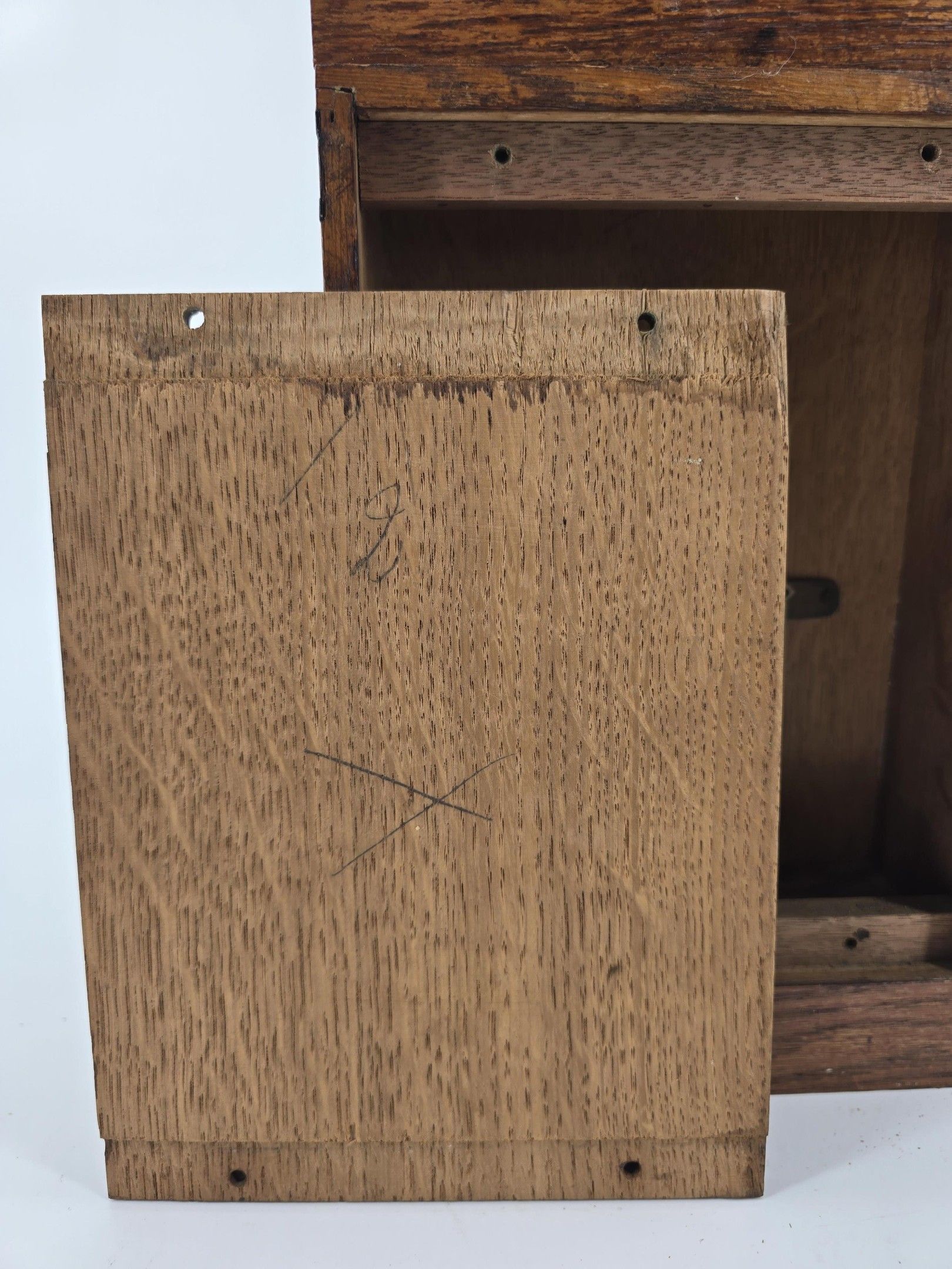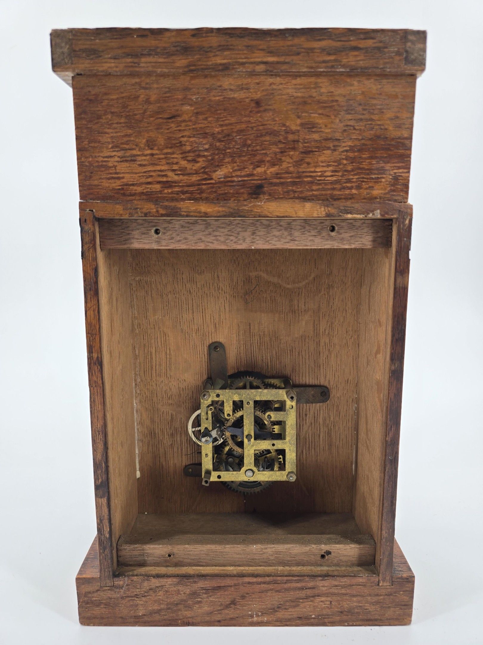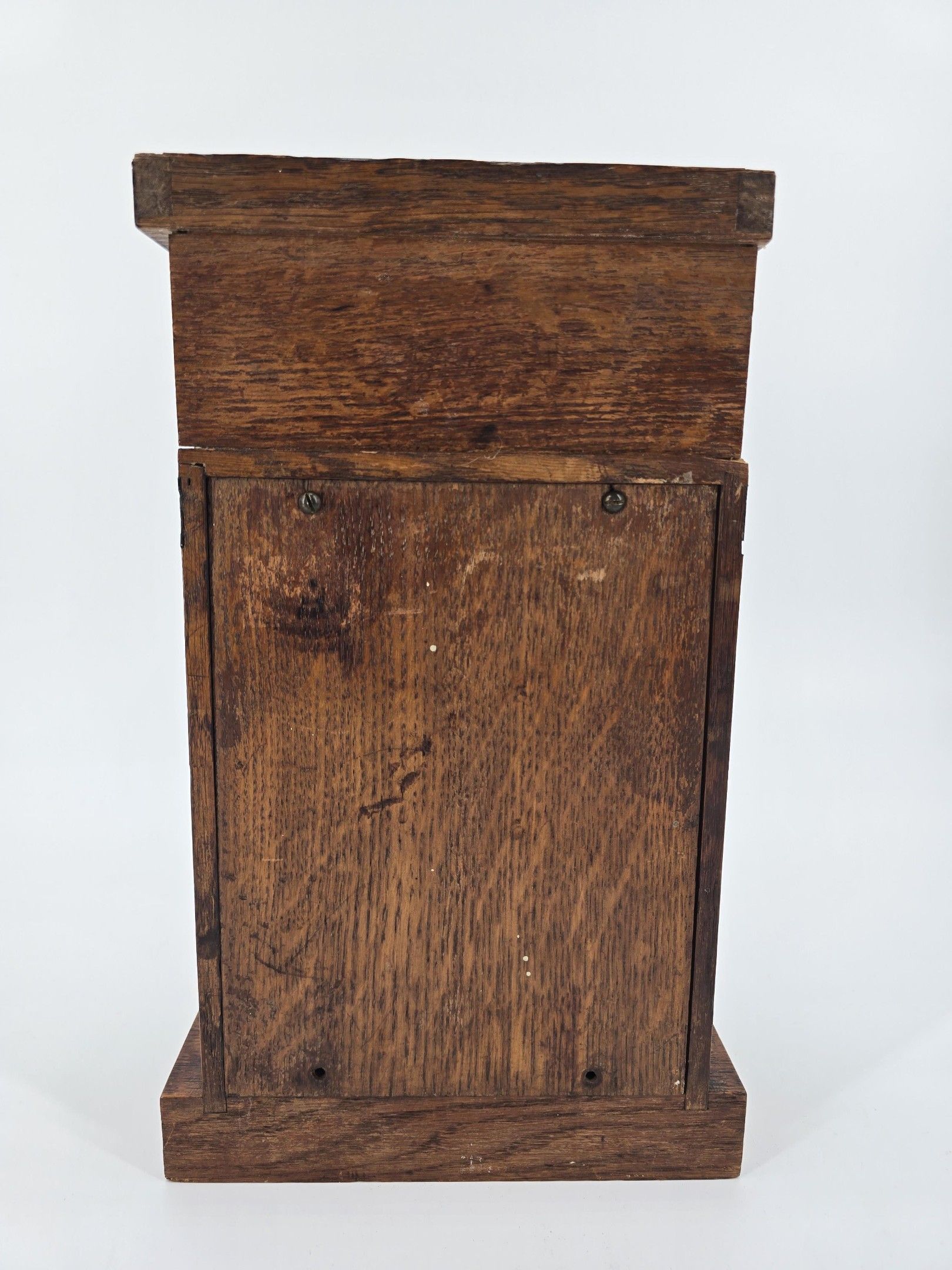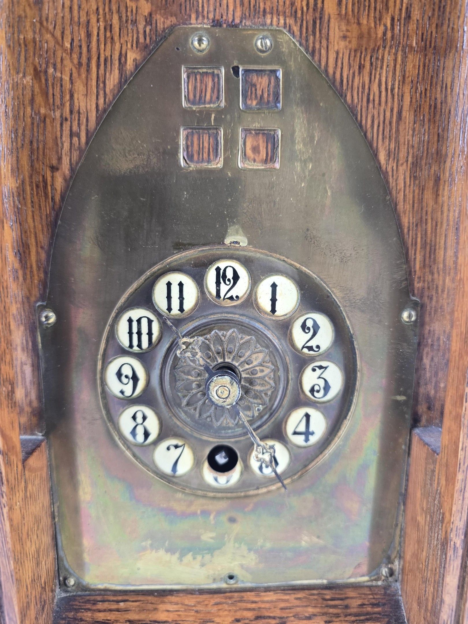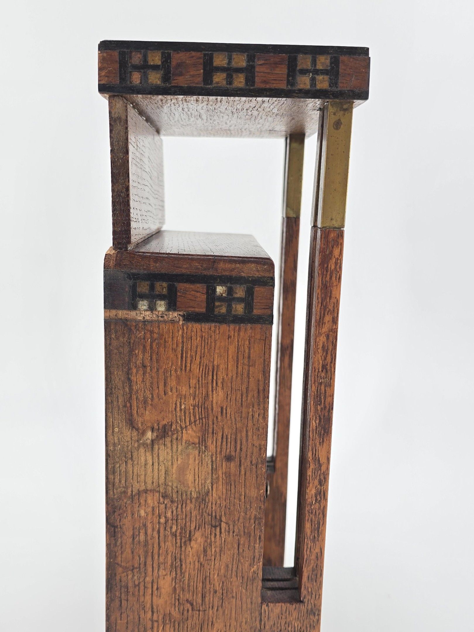 Gustave SERRURIER-BOVY (1858-1910). Rare clock by Gustave Serrurier-Bovy, dating from the period 1907-1910. Serrurier-Bovy designed his furniture in series, each corresponding to an identifiable stylistic period. Each period is characterised by recurring decorative elements that serve as an implicit signature. For example, the so-called Silex series (1904-1905) is characterised by the use of light-coloured woods, coloured square-head screws (blue, green or red), and the application of repeated stencil motifs throughout the furniture. The extremely rare clock shown here is the only one known to date. Provenance: Mosan sale 2018, private collection from Liège. It clearly bears the hallmarks of a late phase in Serrurier-Bovy's work, around 1910. This period corresponds to the end of his career, with limited production from the Liège factory. The ornamental elements confirming this attribution are as follows: -Mosaic inlay of small contrasting squares of wood, forming a checkerboard pattern. This motif appears on a famous buffet-vitrine reproduced on a postcard dated 1910 showing the showroom on rue de la Joie in Liège (see Jean-Grégoire Wathelet, Serrurier-Bovy, Atelier Vokaer, Brussels, p. 102). The same motif is repeated on the doors of the shop windows (see p. 106), marking the transition from Art Nouveau to Modernism. Cut-out brass plate used as a cover plate around the mechanism (the mechanism did not come from the Serrurier workshops). The shape of this plate, with its slightly smoothed edges, perfectly highlights Serrurier-Bovy's most famous leitmotif: the four openwork squares. As usual, the corners of these squares are very slightly curved, a detail that is perfectly respected here. The overall composition combines Serrurier-Bovy's own Belgian style with the influence of Darmstadt, giving this piece a modernist aesthetic that already heralds Art Deco. It is therefore unequivocally a genuine work by Serrurier-Bovy, requiring no attribution. Although the archives are incomplete, and no drawings or photographs of this model have been found, the recurring motifs, manufacturing processes and formal vocabulary unquestionably confirm the piece's authenticity. This clock is a rare and remarkable example of Walloon artistic heritage. Height: 32 cm. Dimensions: 19.8 x 10 cm. Presented in its original condition. In need of refurbishment / Restoration.