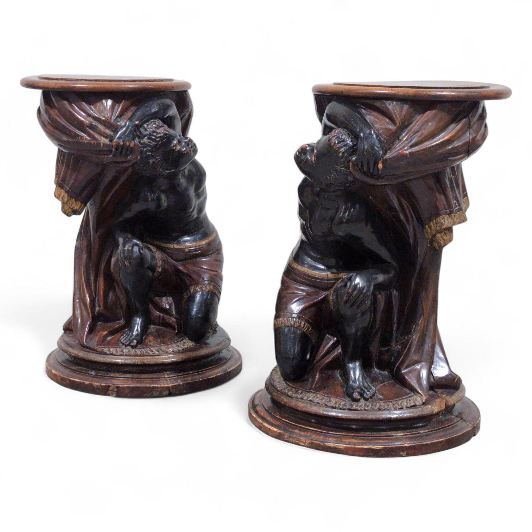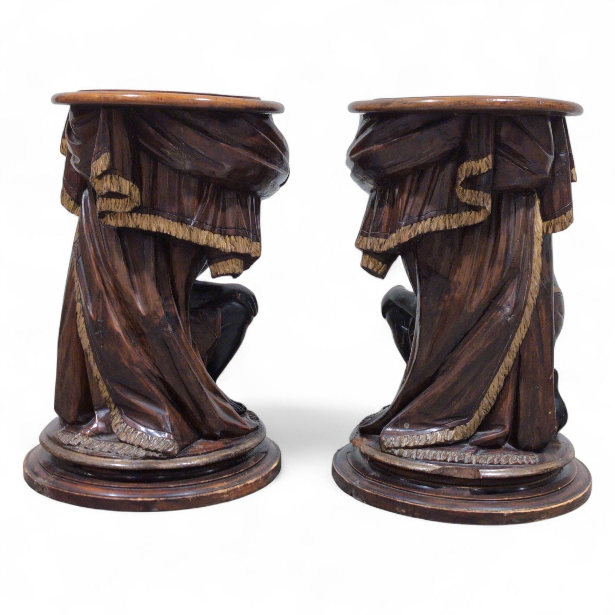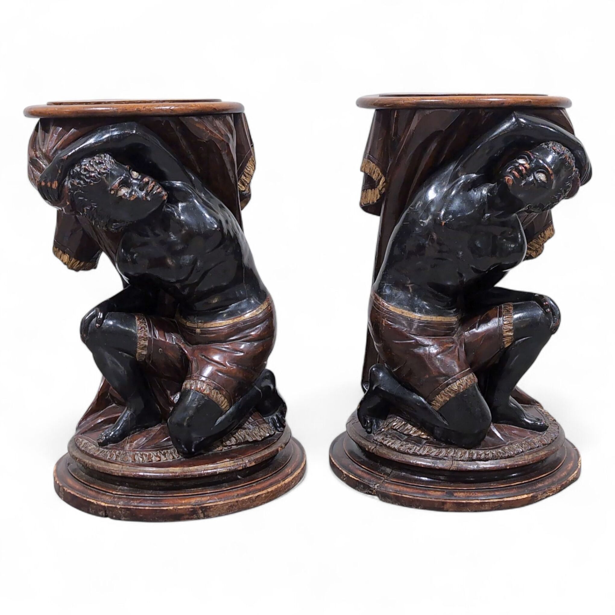 Pair of TABOURETS in carved, moulded and painted wood depicting a crouching Nubian 19th century H.: 55.5 cm (cracks)