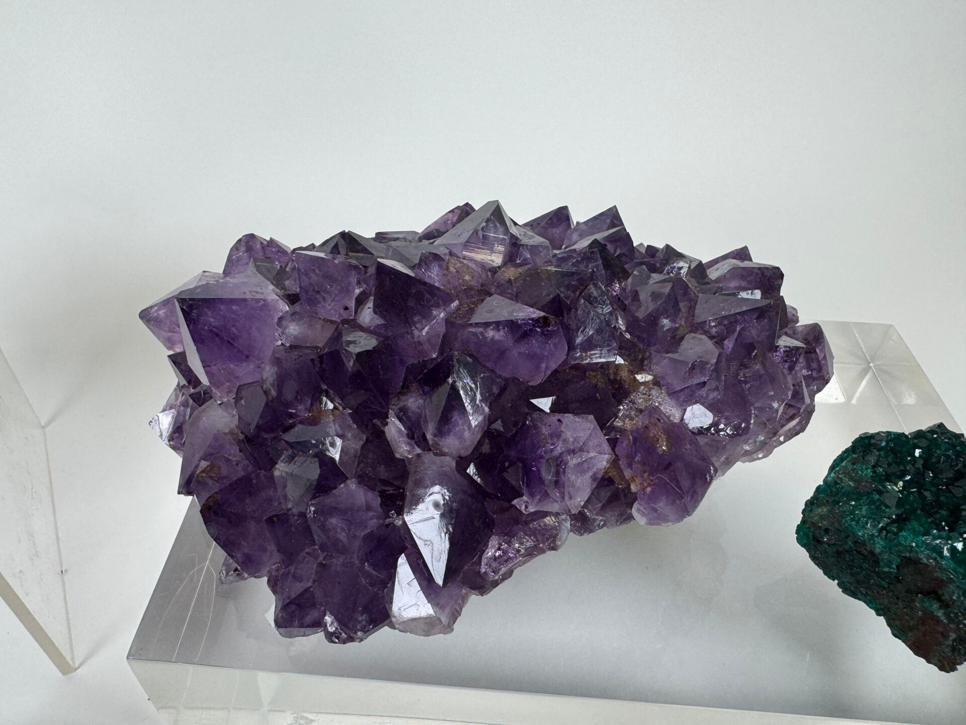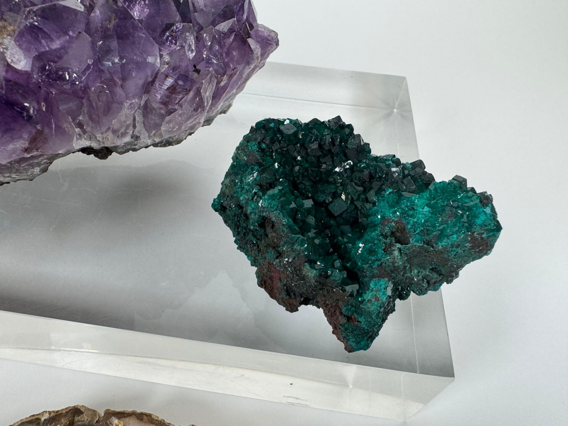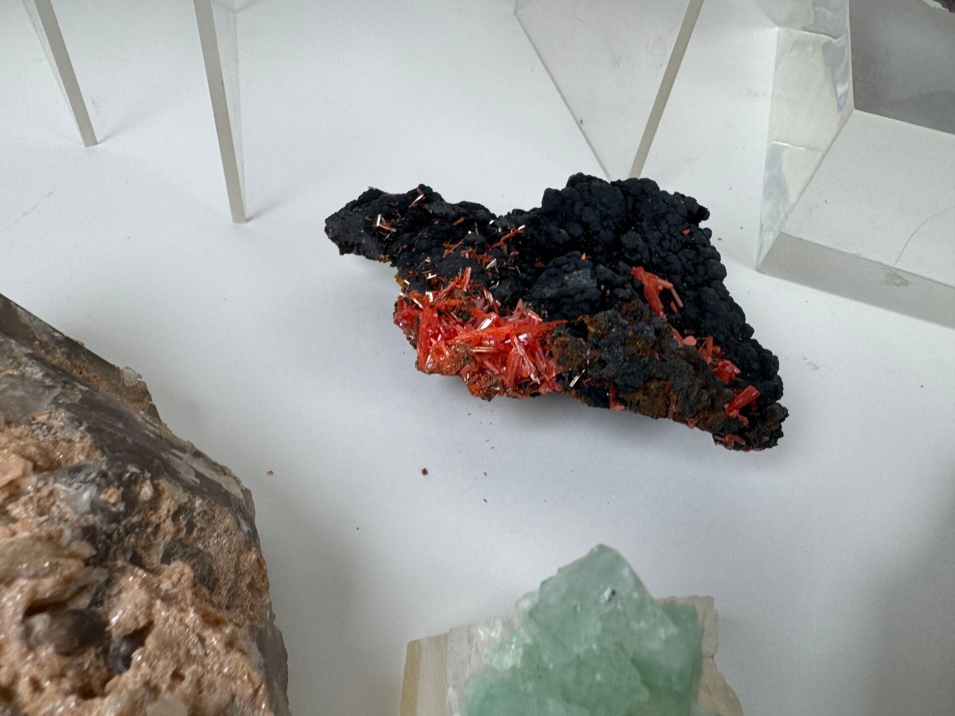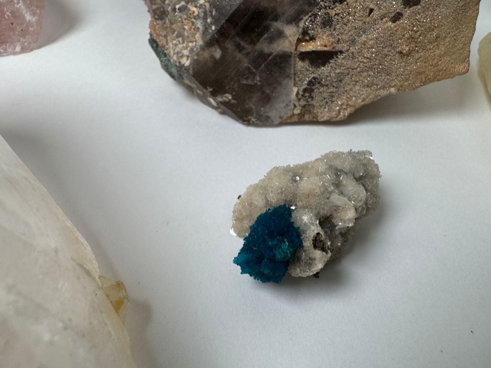 Collection of minerals including AGATE MINAS GERAIS (Brazil), Tourmaline Cristal de Roche, CAVANSITE (India), CHAROITE on HERMATITE (Tasmania), Green APOPHYLLITE and Calcite on Hematite, Quartz, etc...