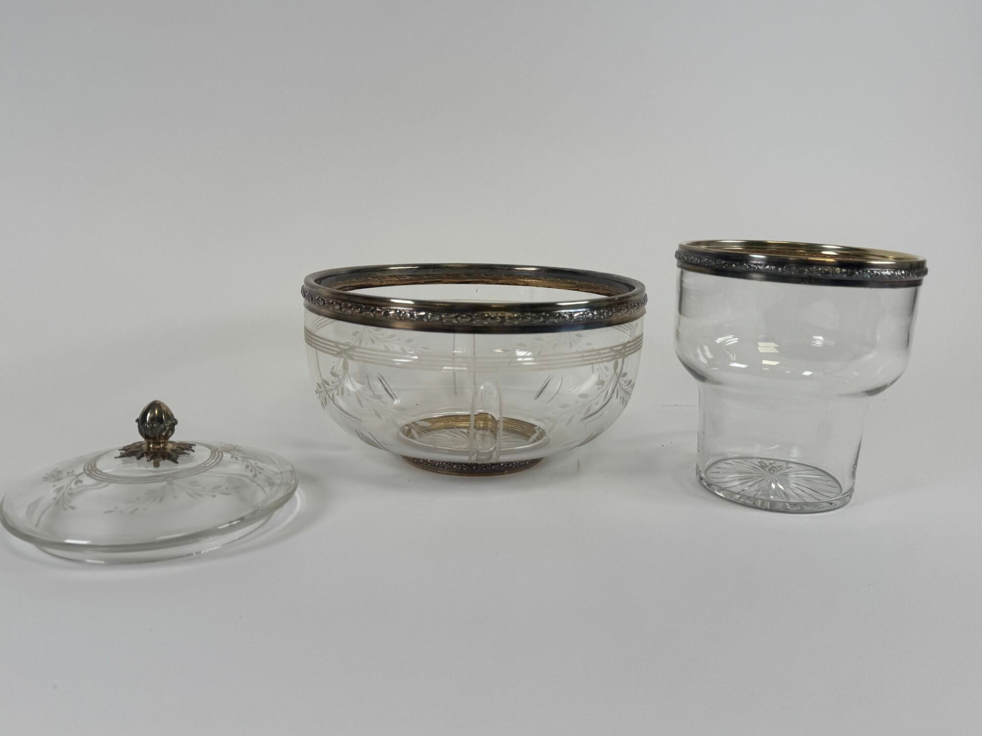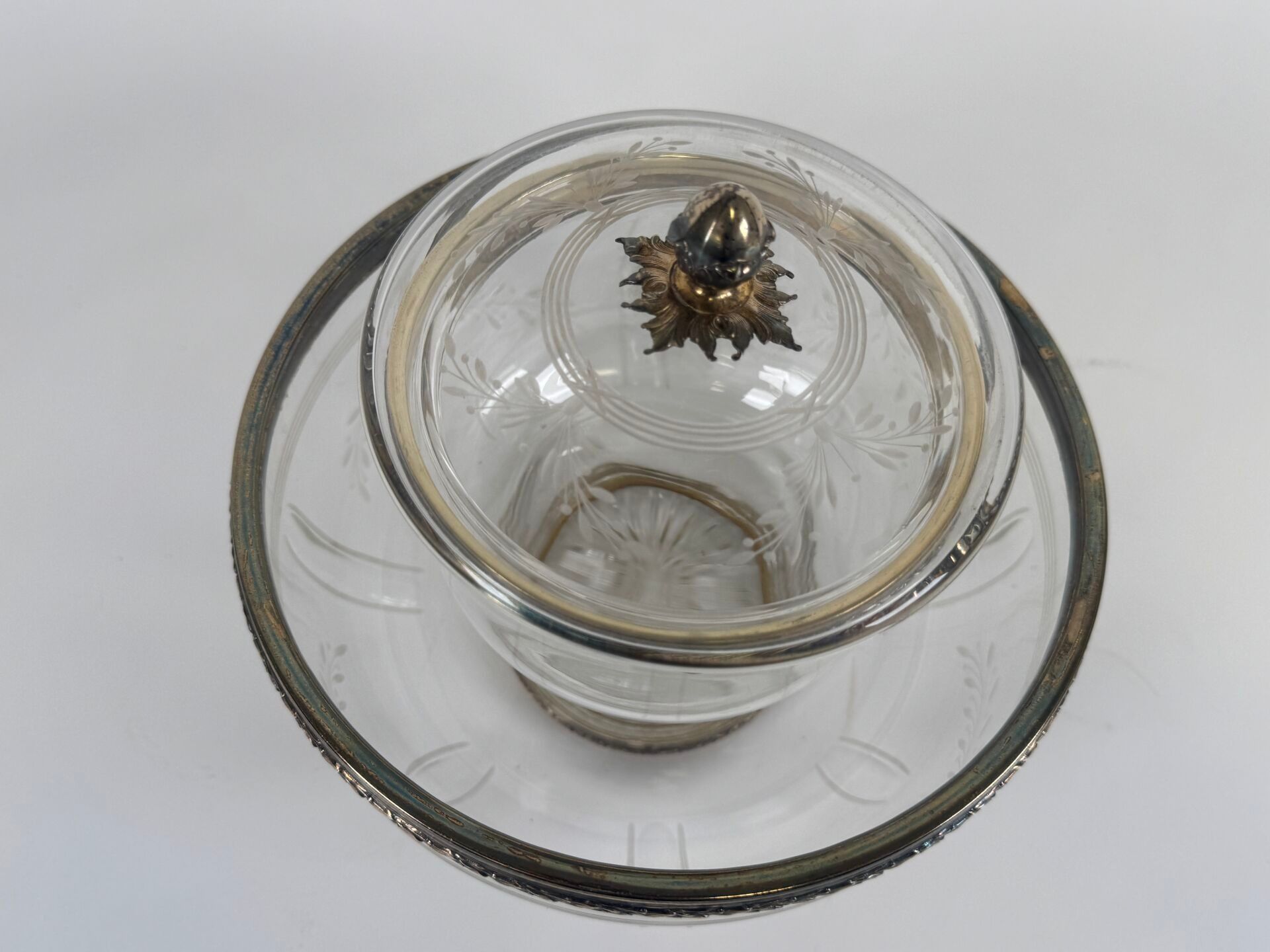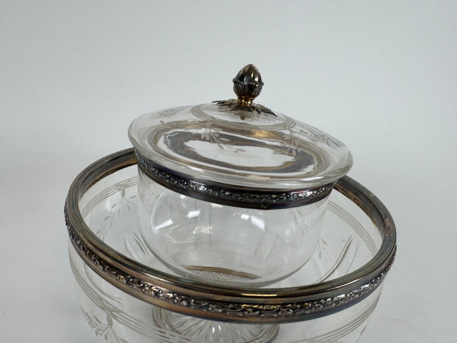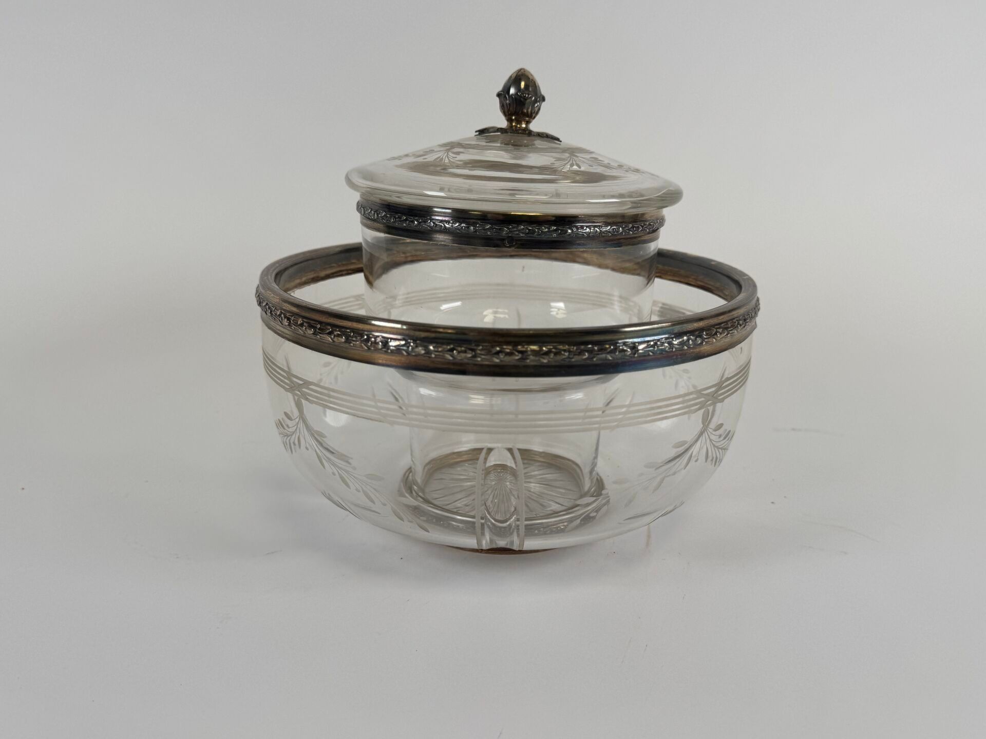 Moulded and pressed crystal caviar cooler bowl, 950/1000 silver mounting decorated with laurel wreaths, the whole engraved with garlands of foliage, the lid in the shape of a stylised fruit.