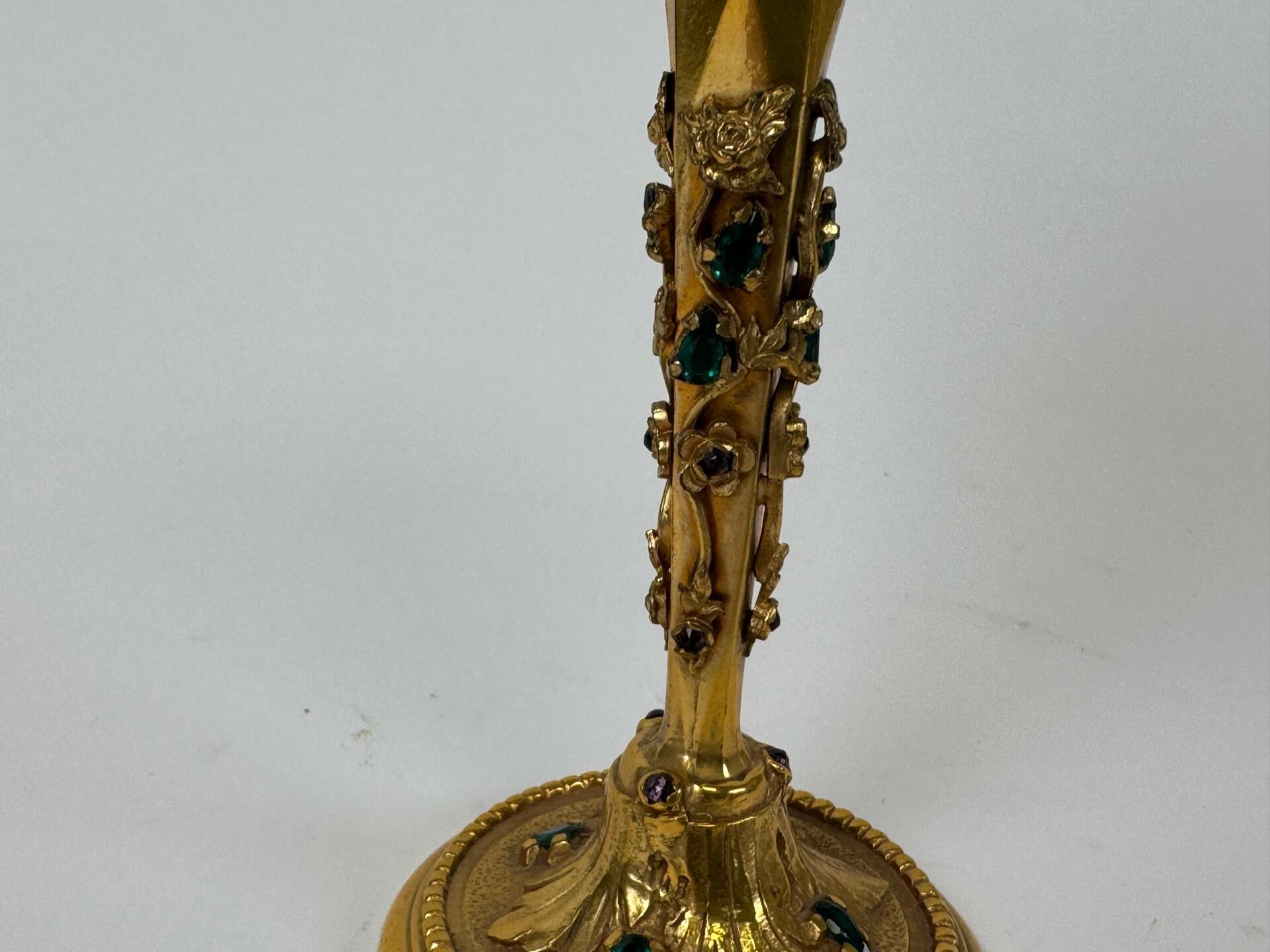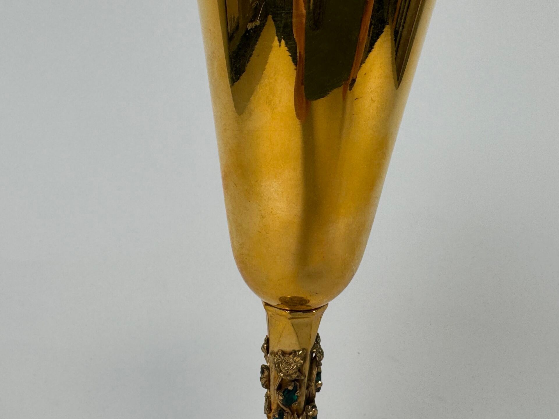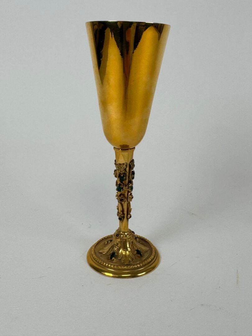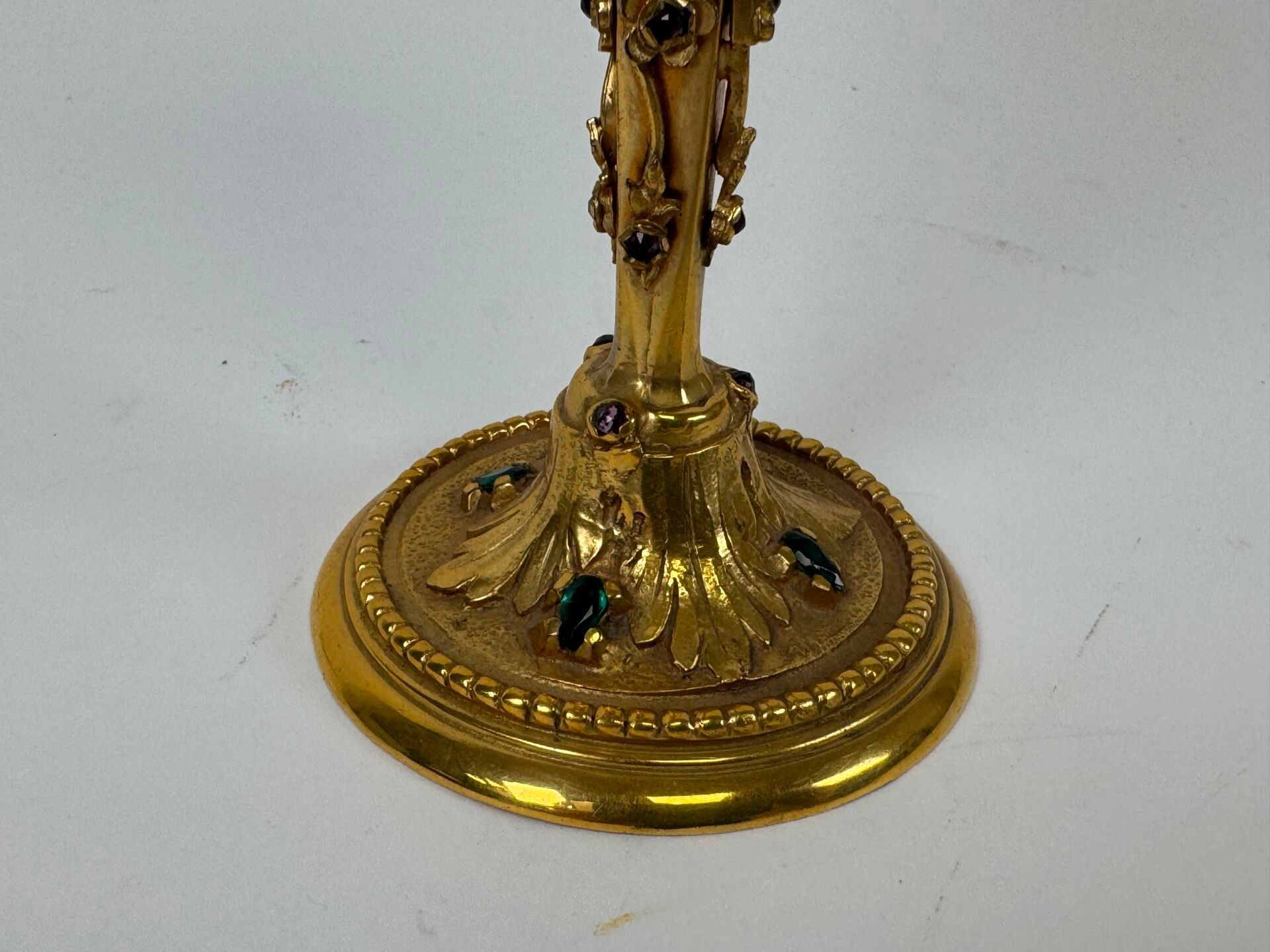 An ormolu champagne flute, the foot decorated with coloured stones and stylised flowers, the circular base with a row of pearls.