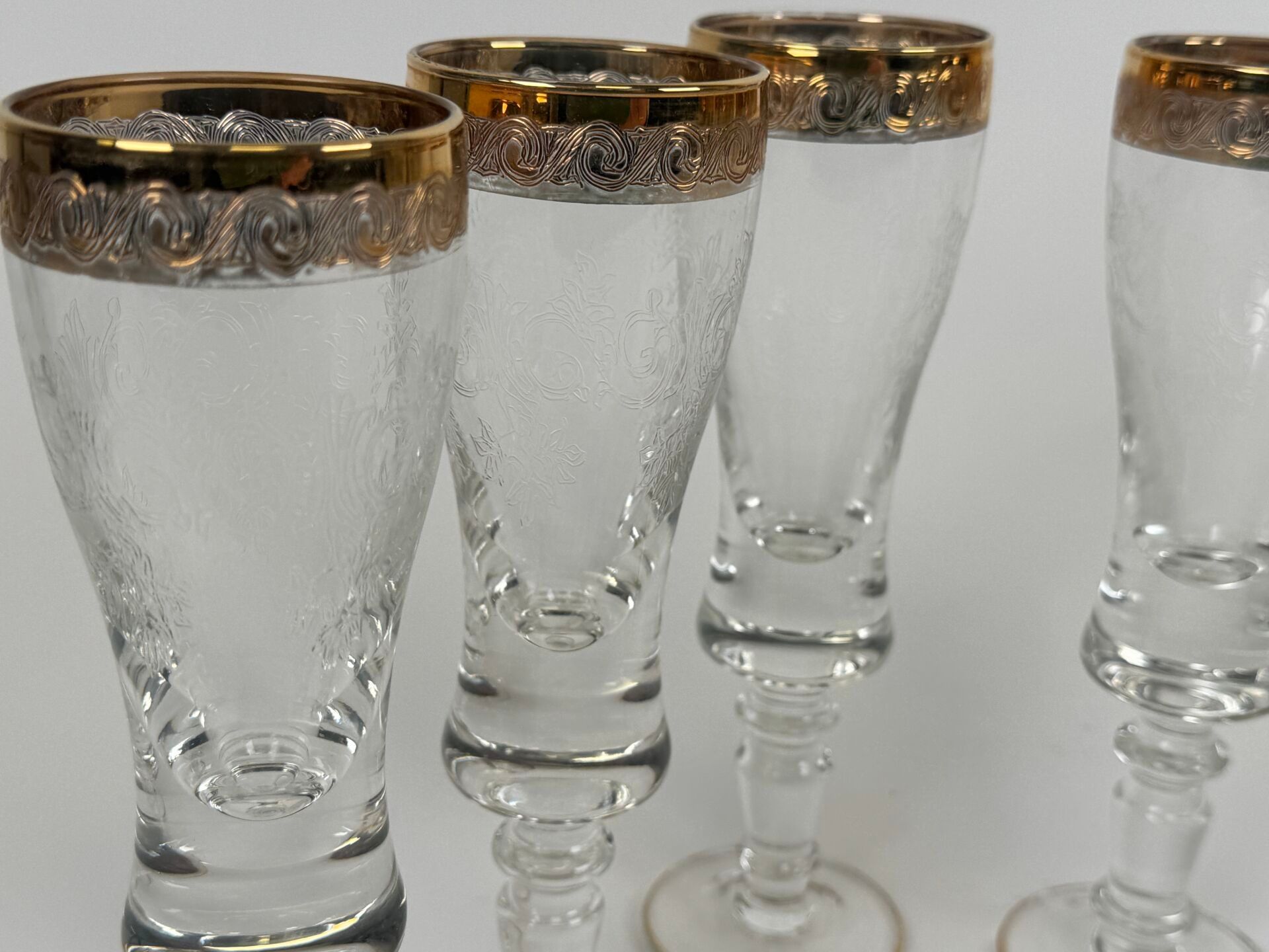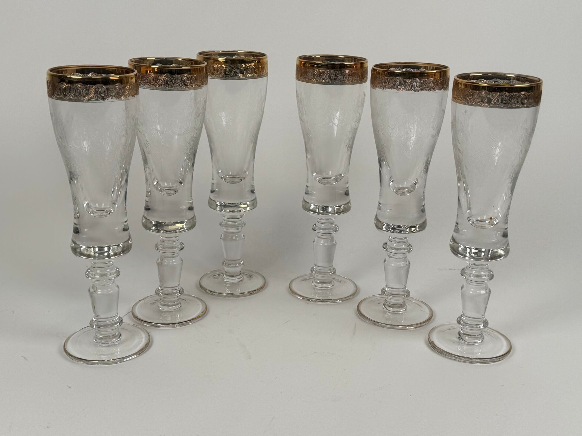 Suite of 6 champagne flutes in chased and gilded glass with foliate scrolls.