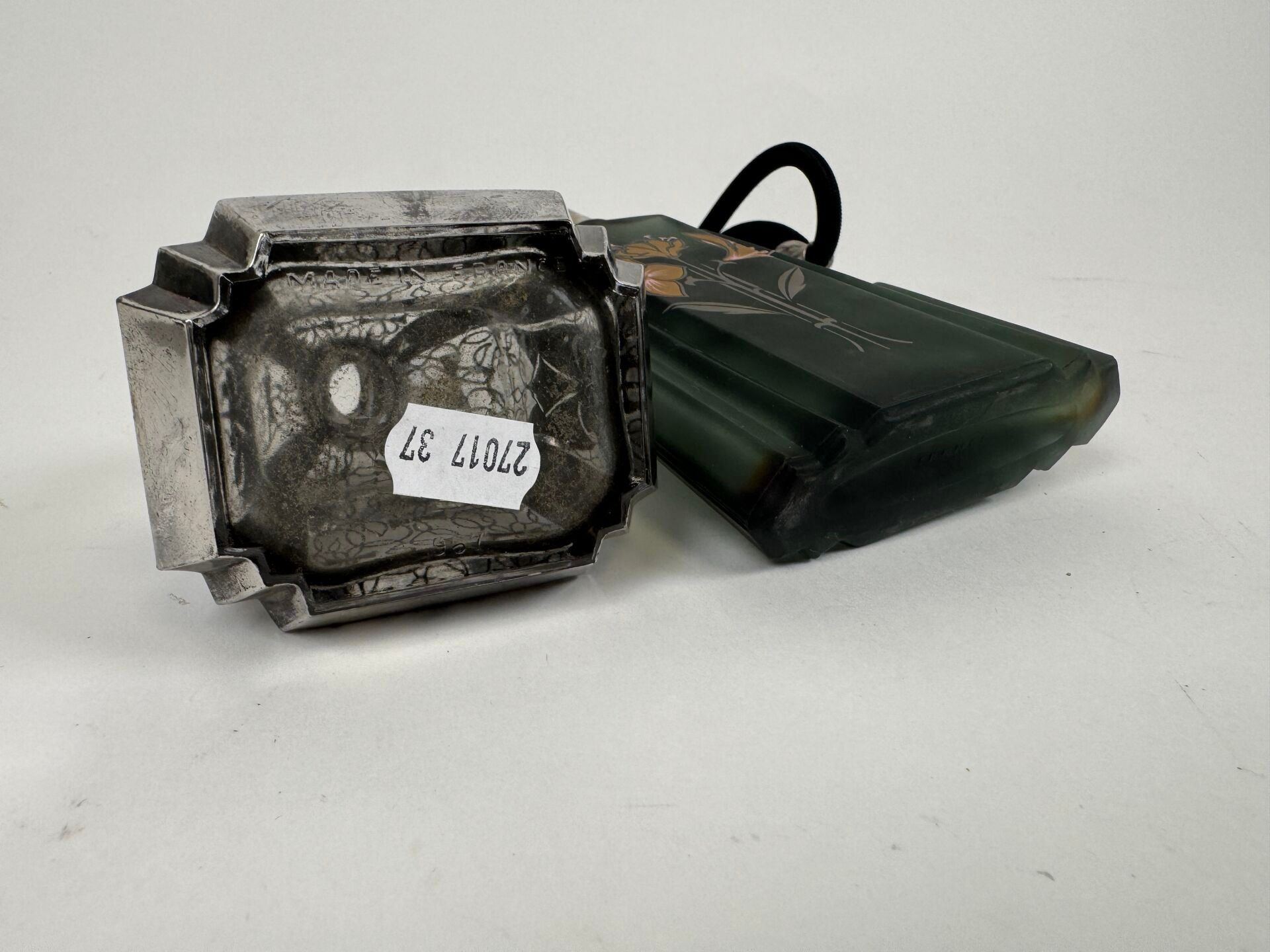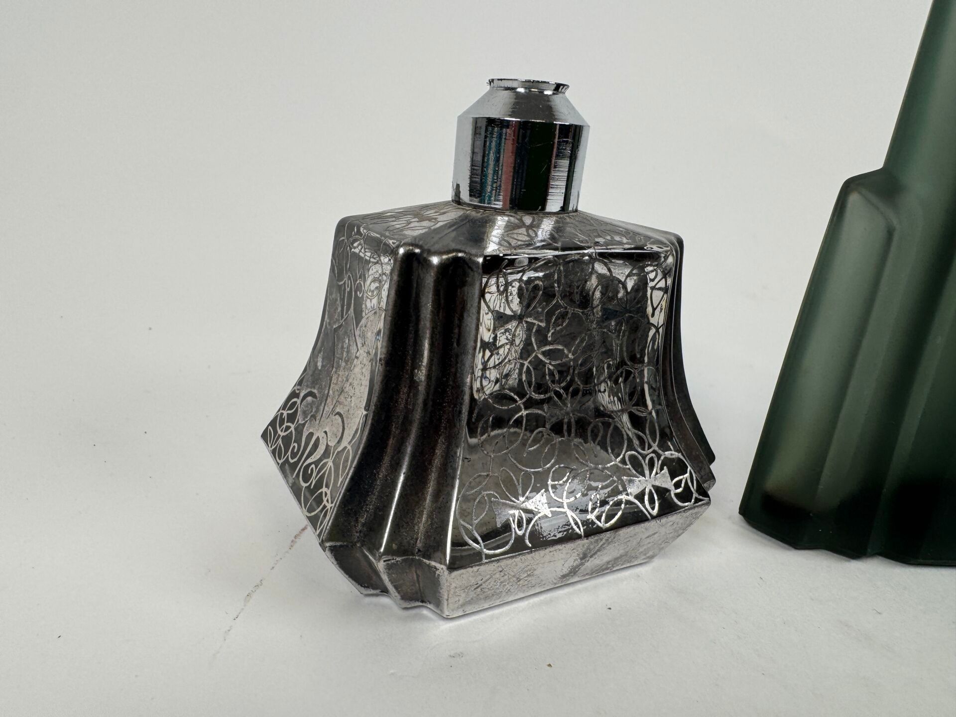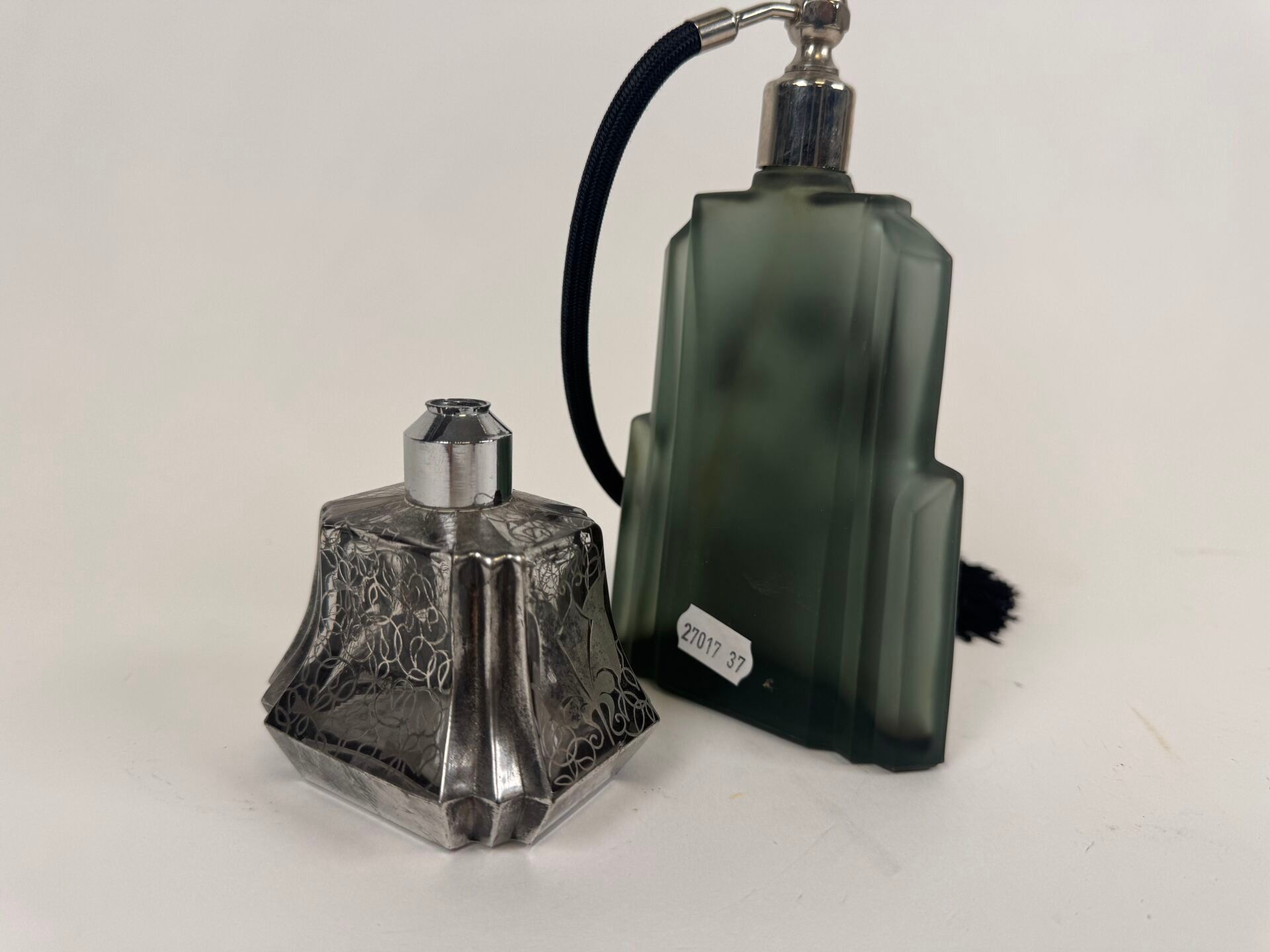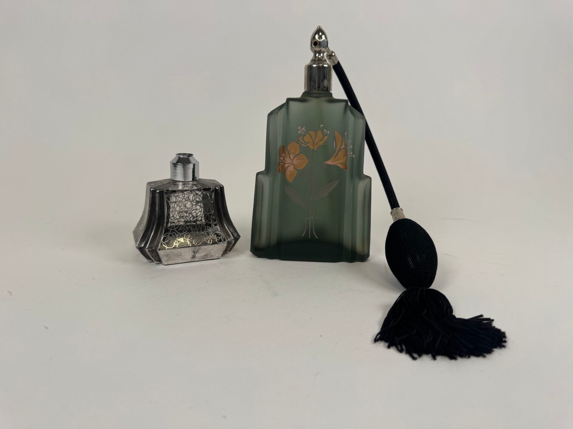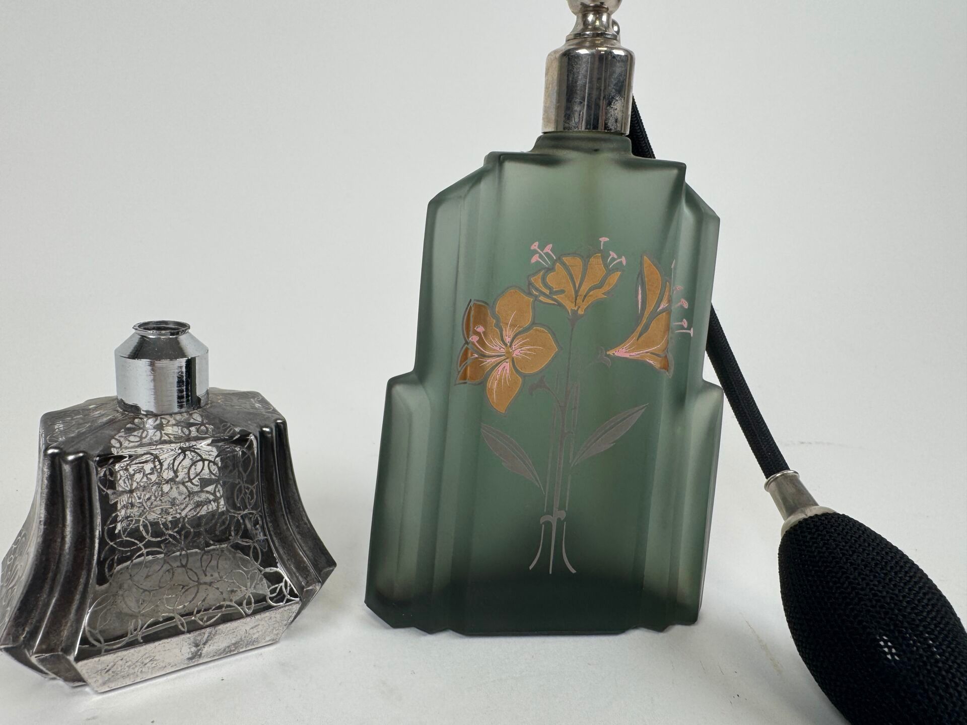 Two coloured glass atomisers, one decorated with silver foliage scrolls, the other with painted flowers.