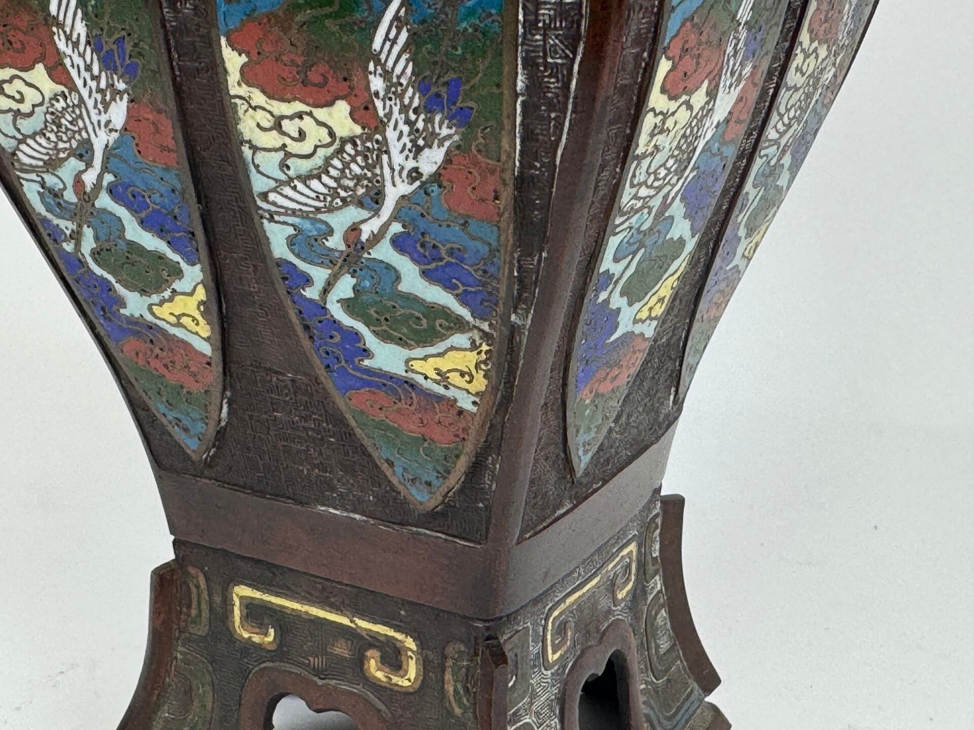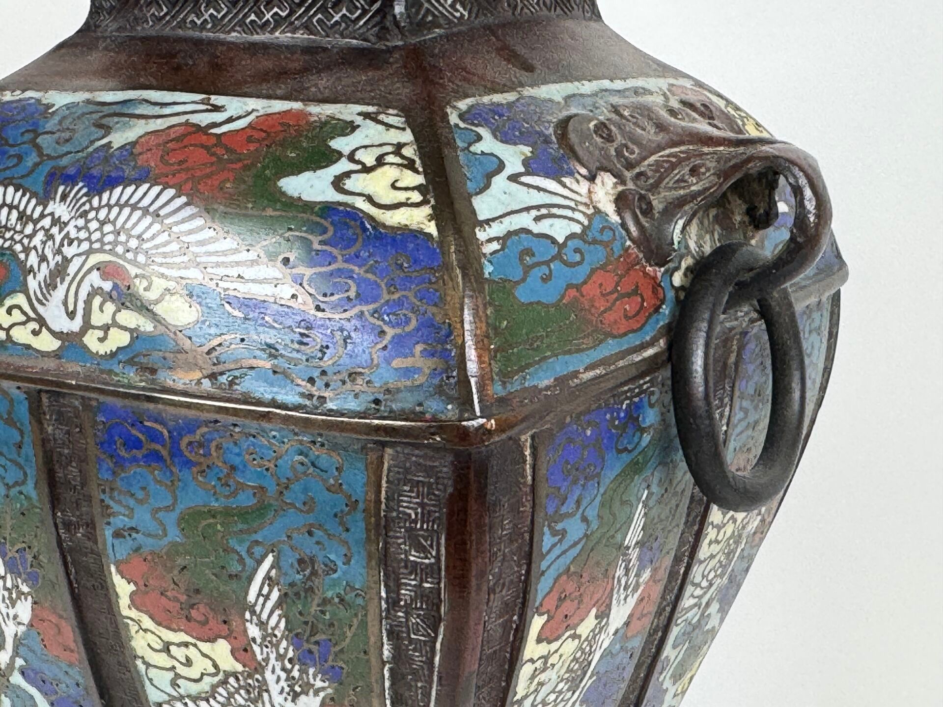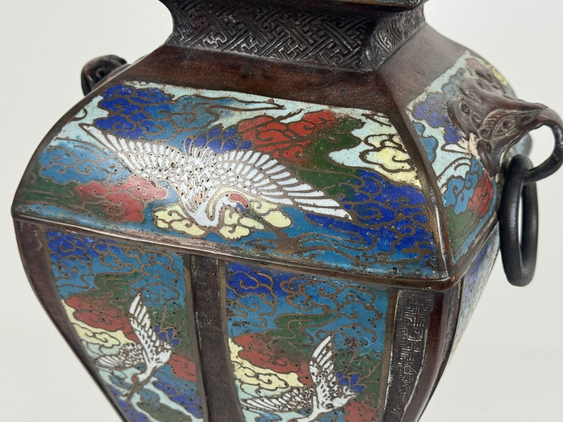 A large cloisonné bronze vase with two openwork handles decorated with stylised birds.