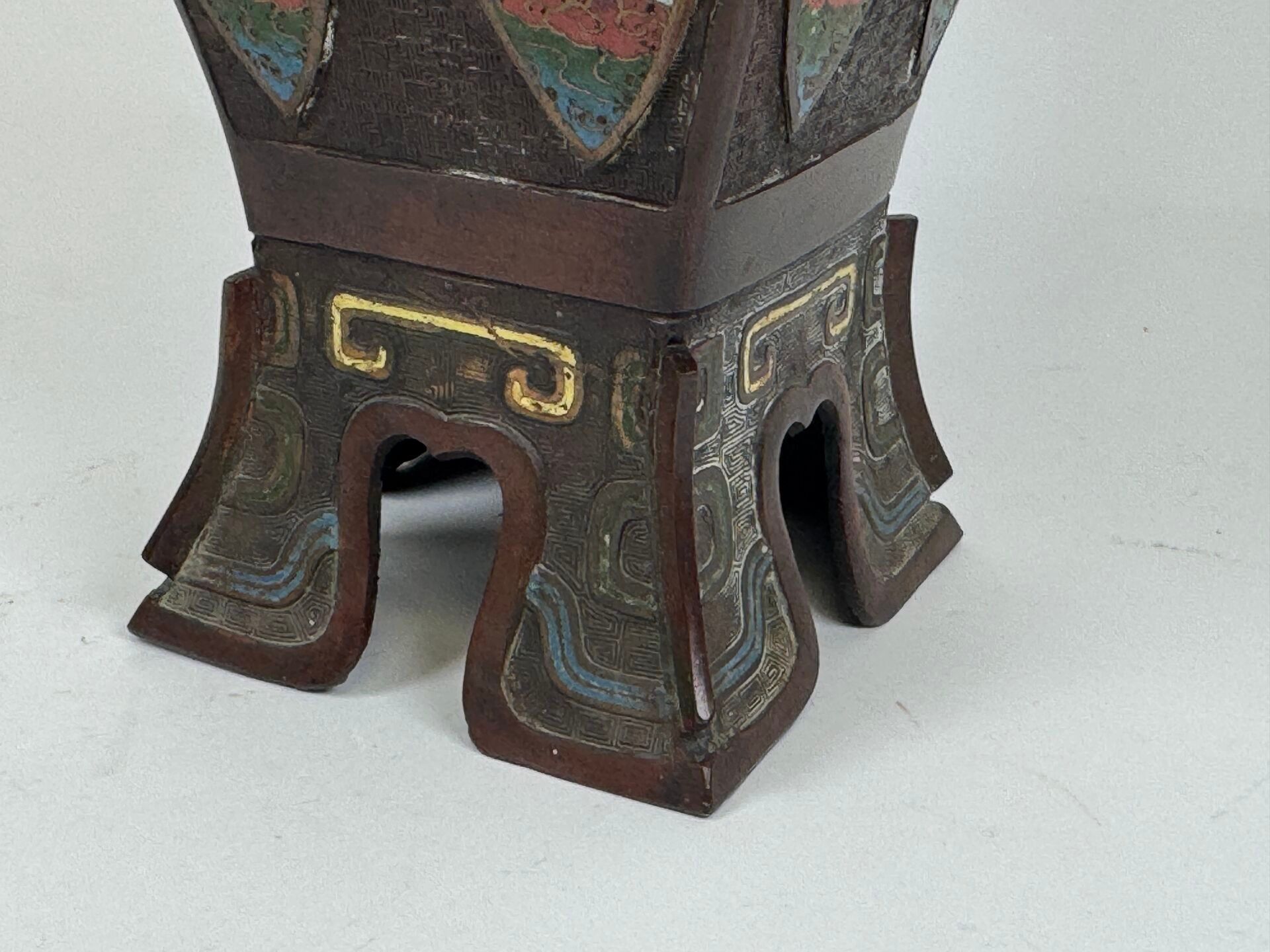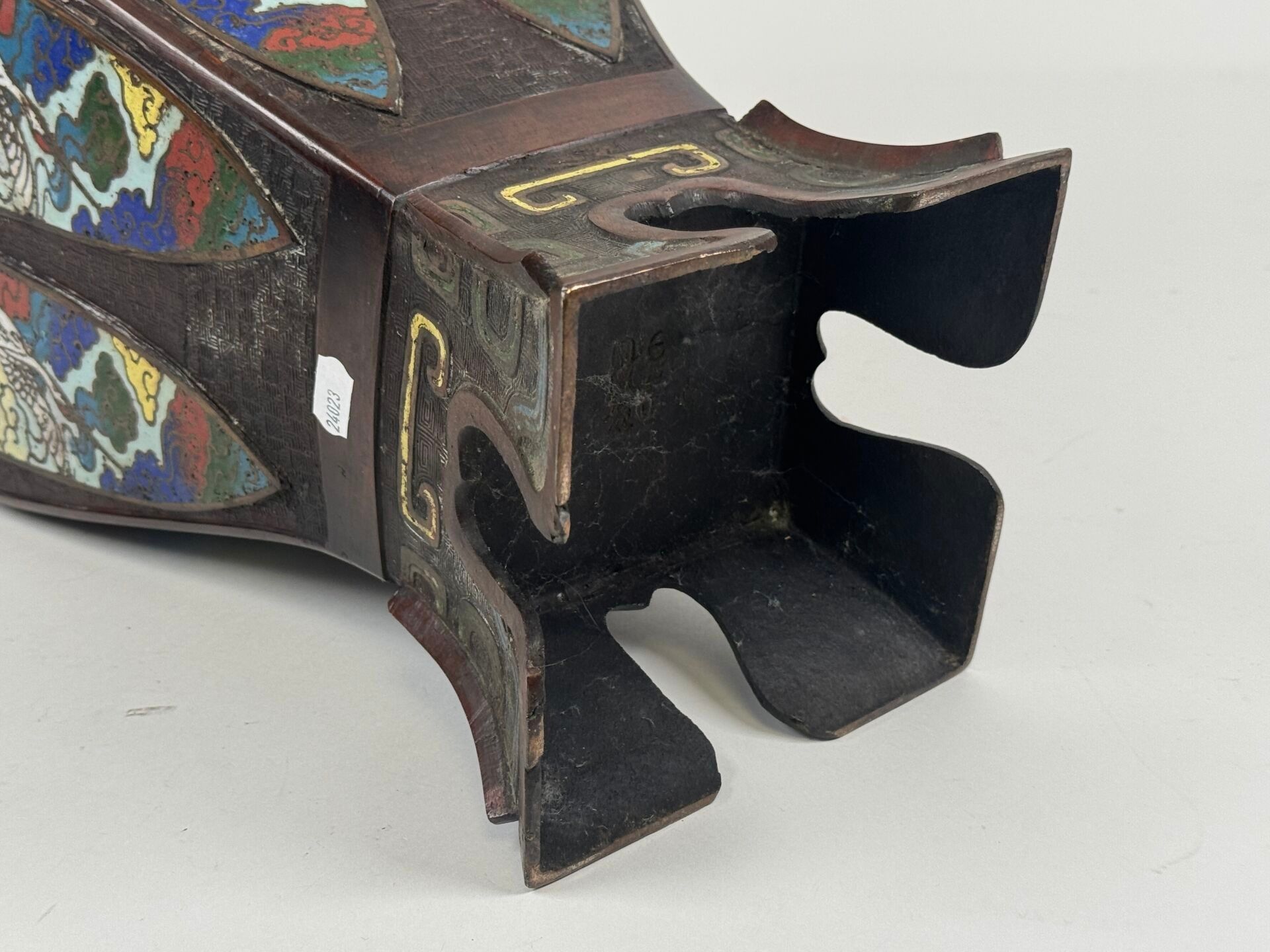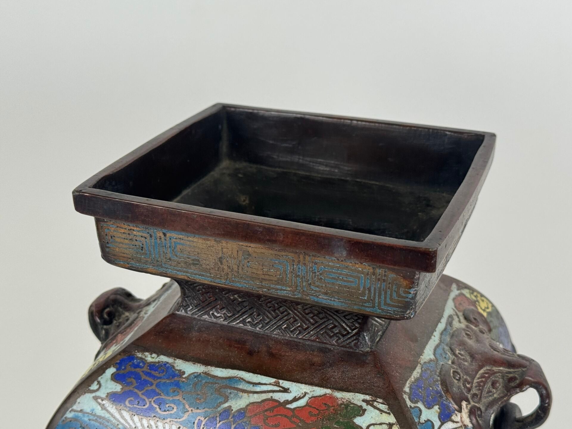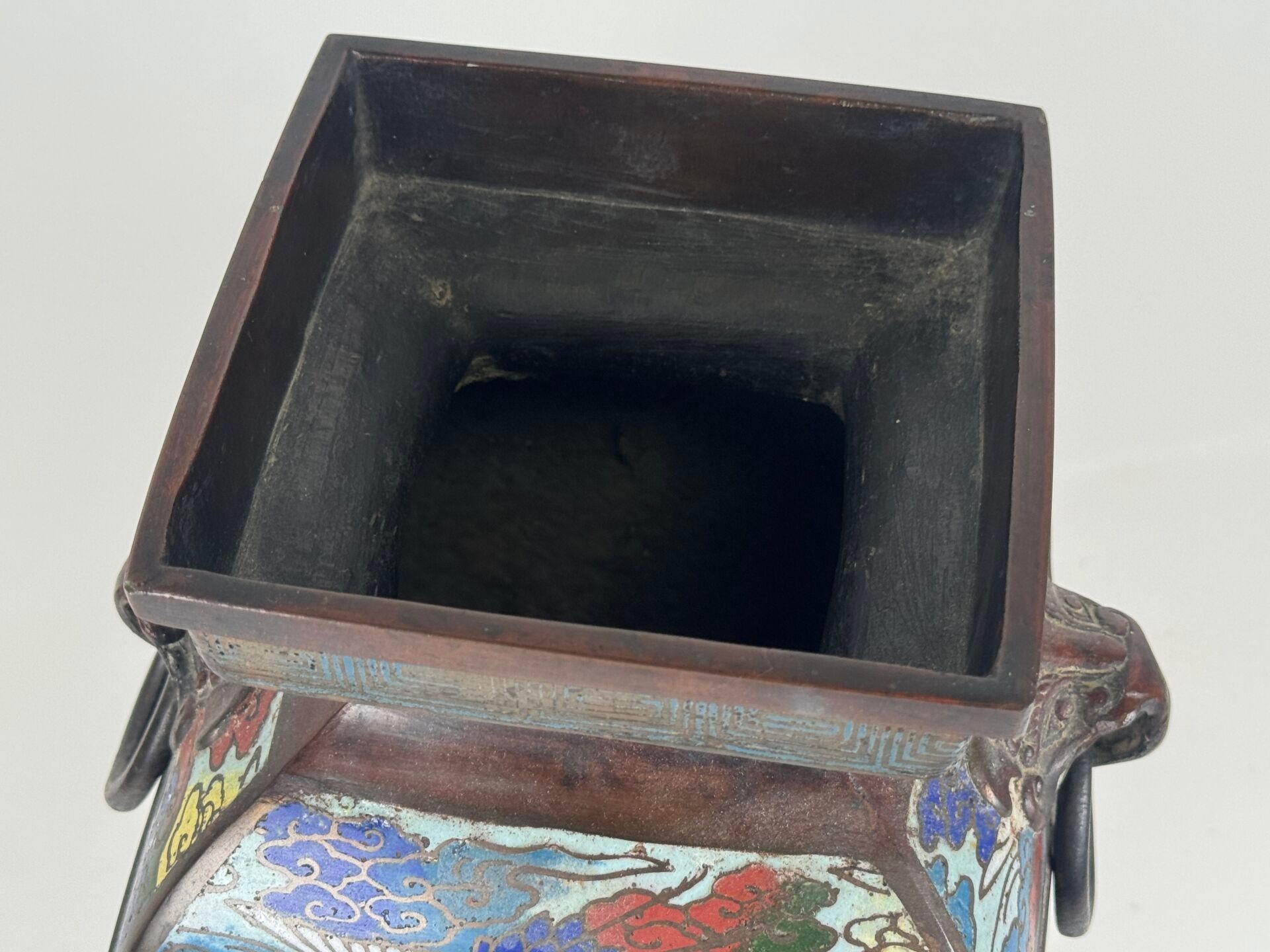 A large cloisonné bronze vase with two openwork handles decorated with stylised birds.