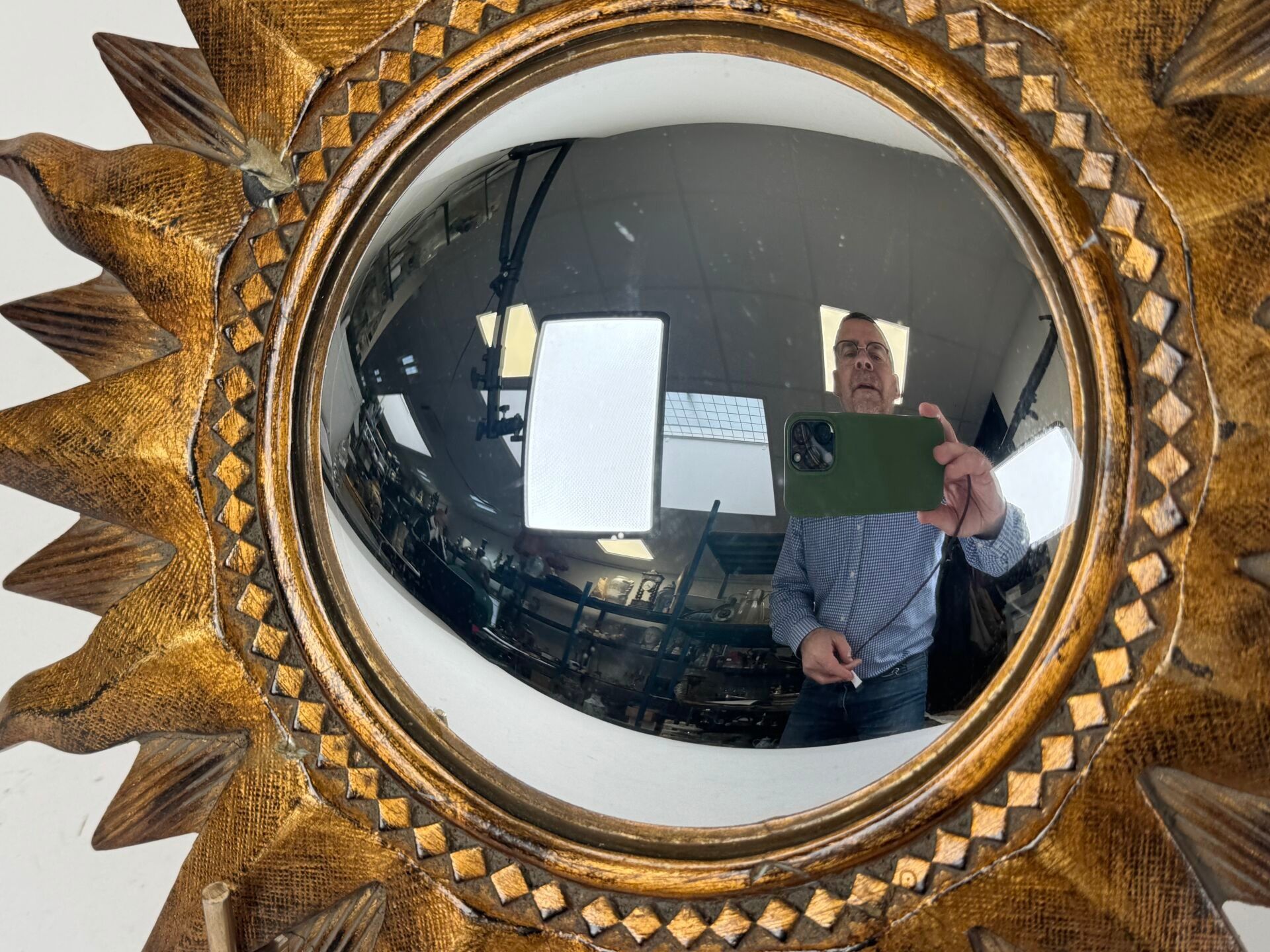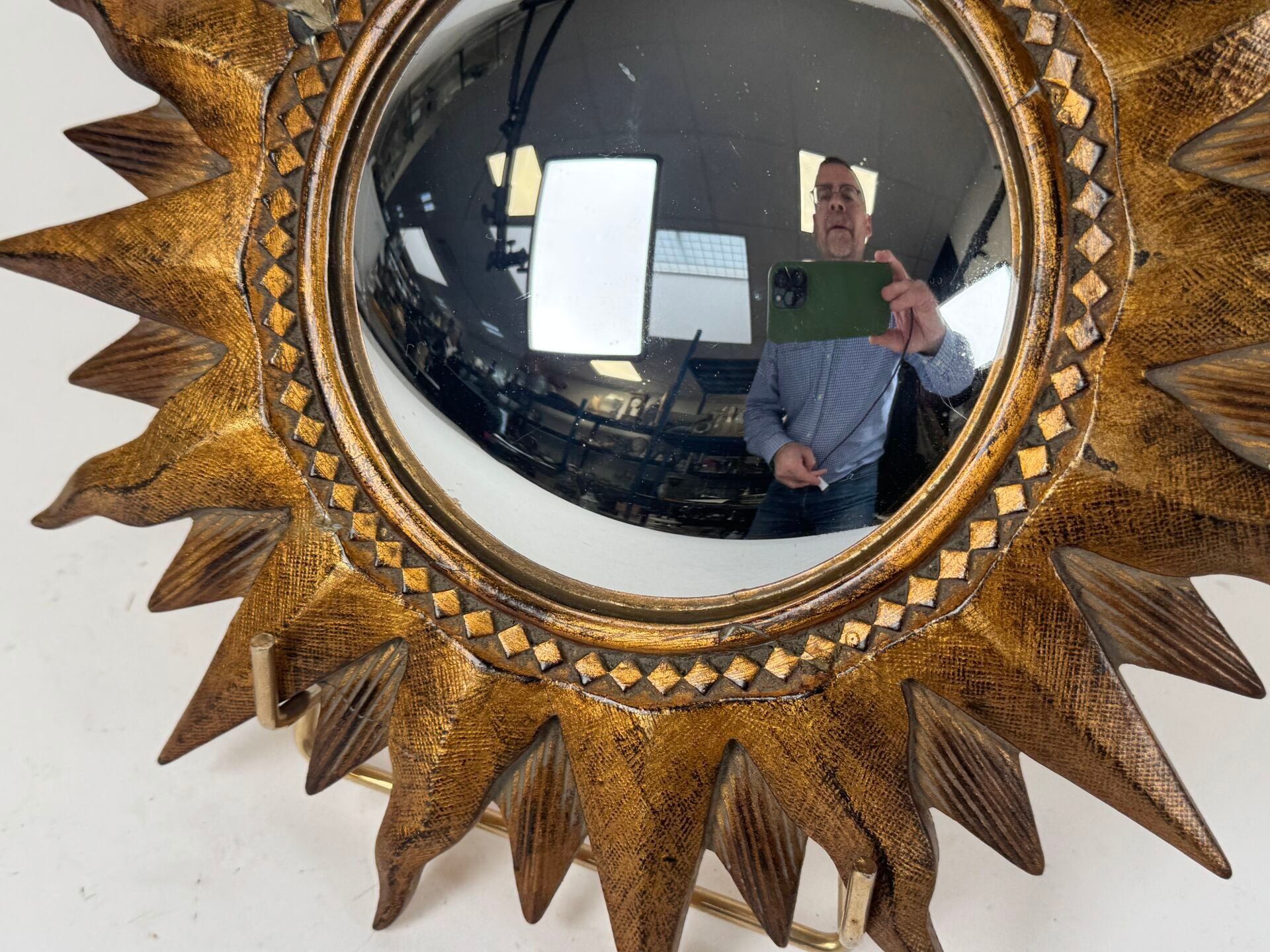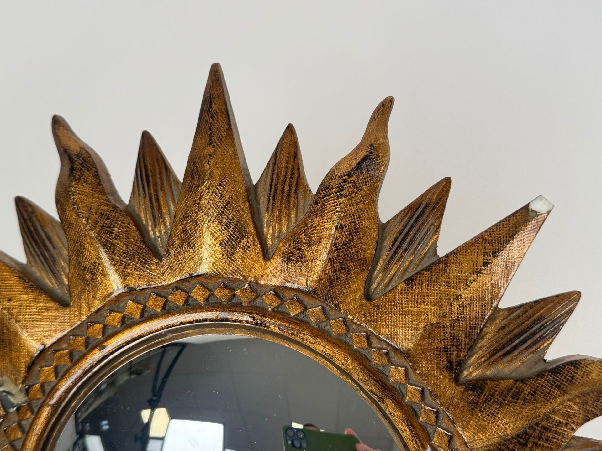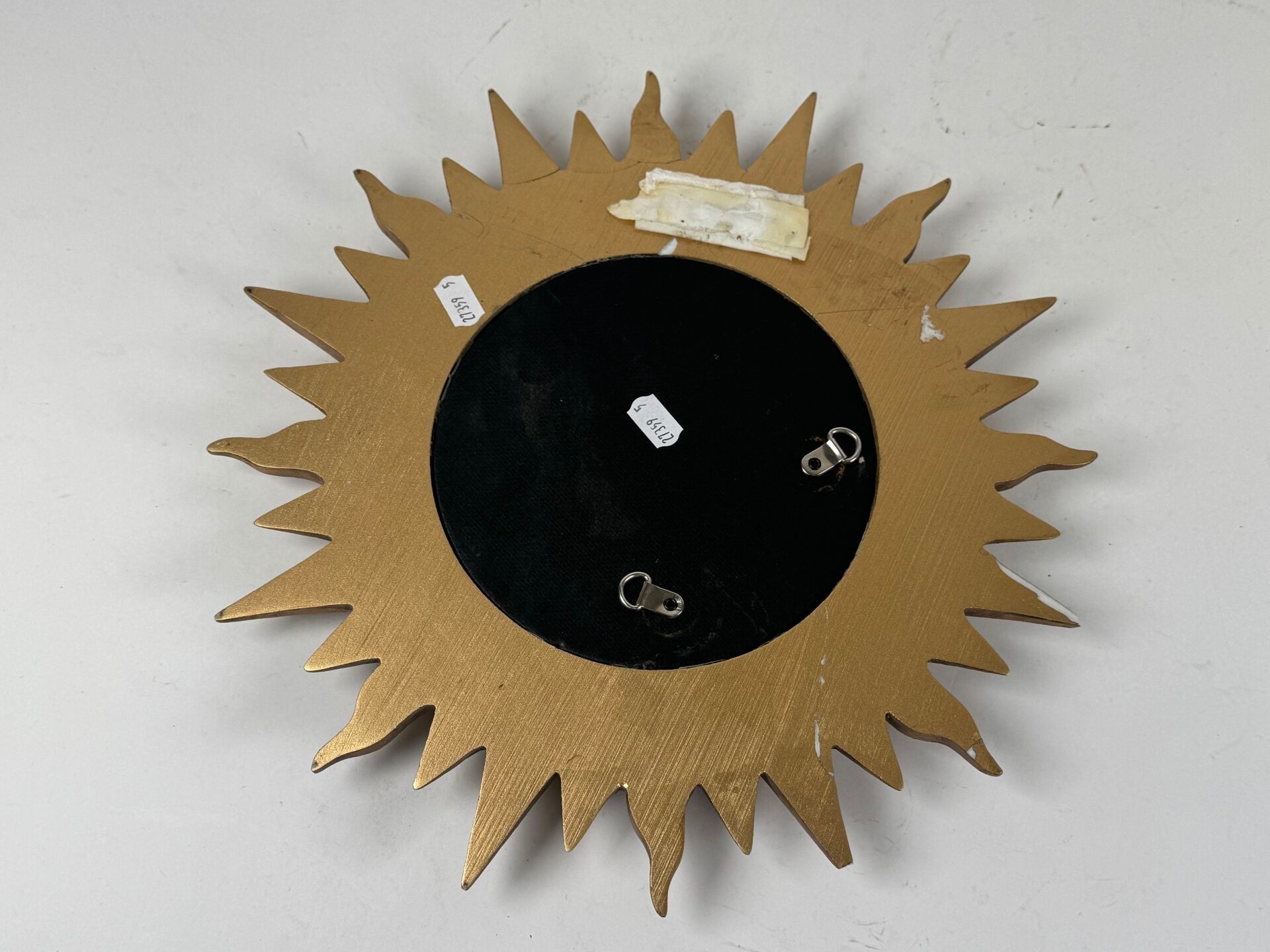 Sun-shaped witch's mirror in resin with gold patina, circular centre.