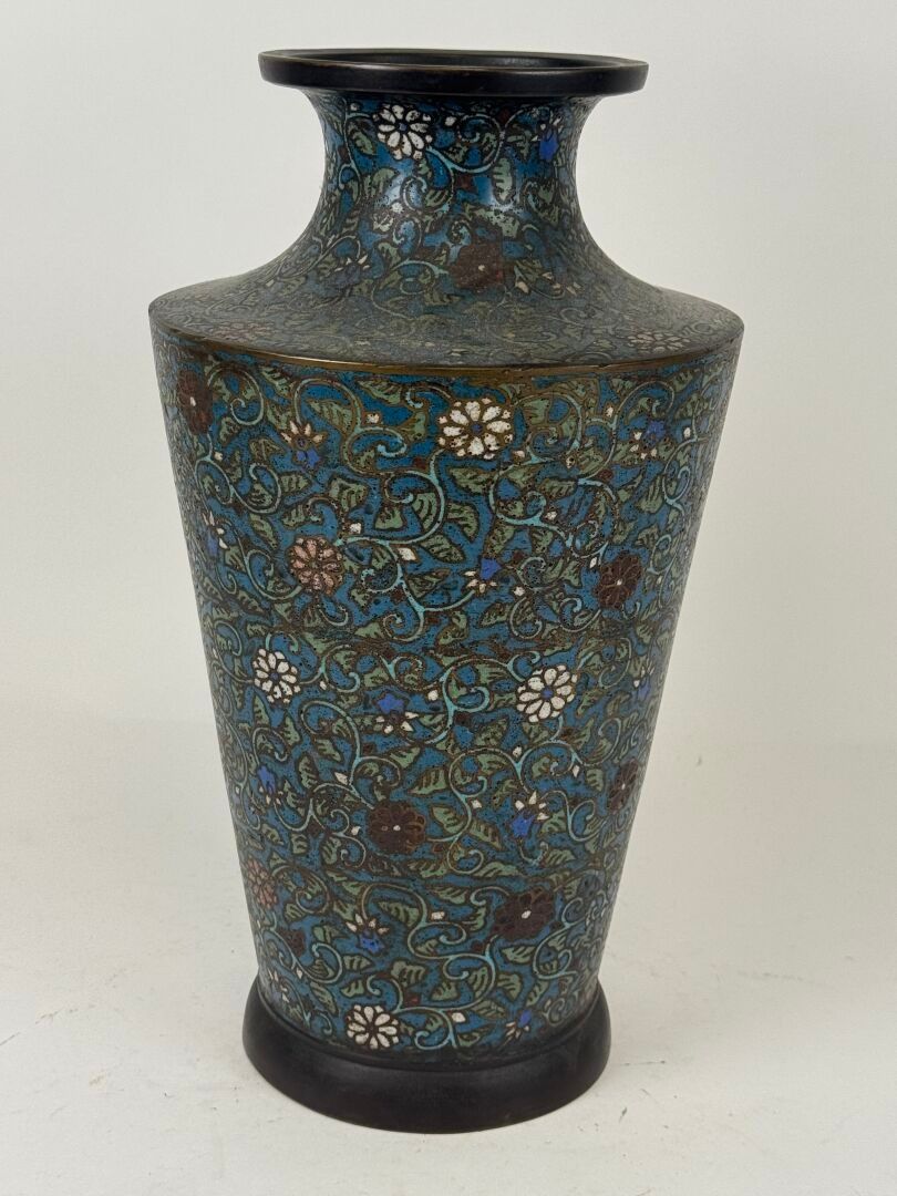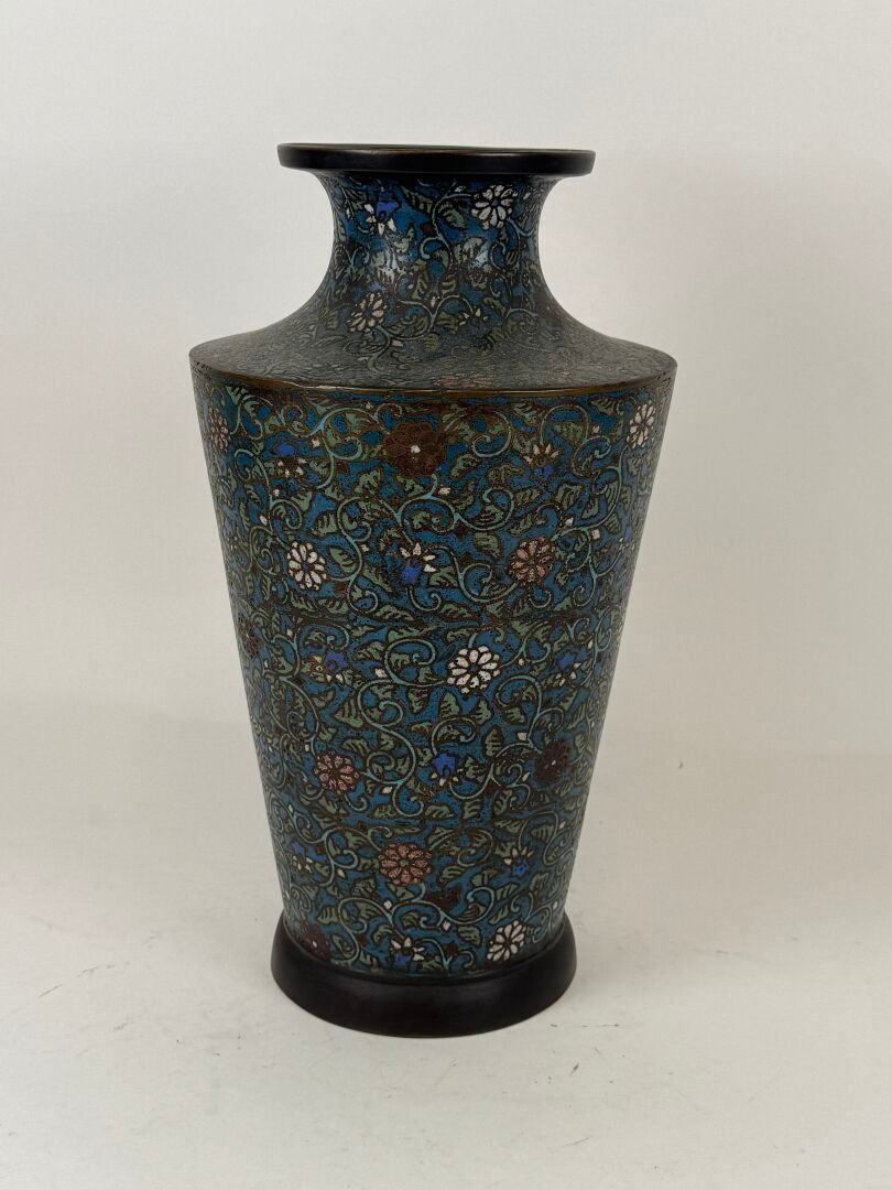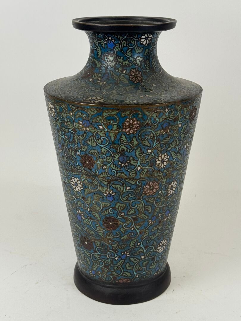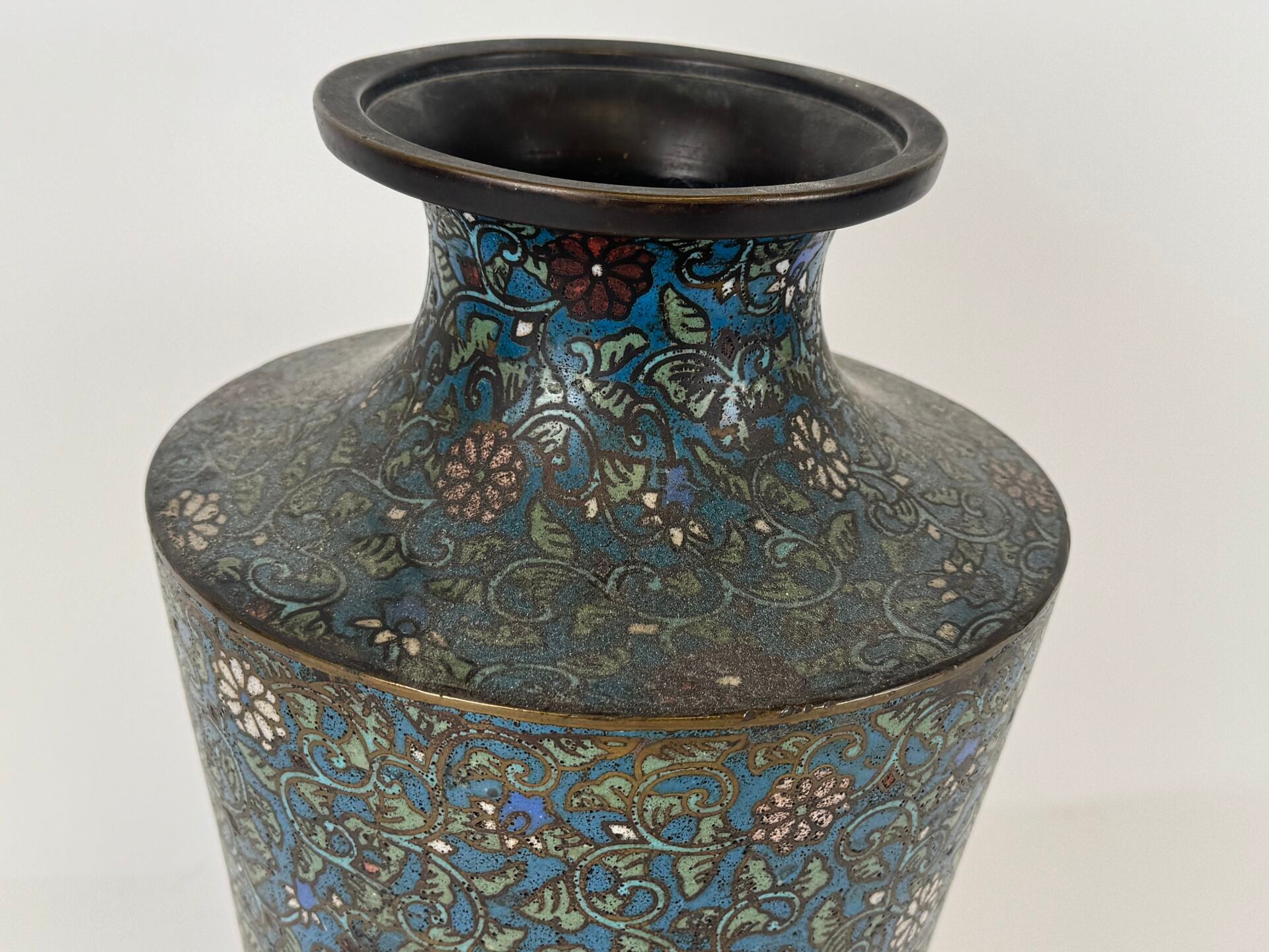 A large cloisonné bronze baluster vase decorated with foliate scrolls.