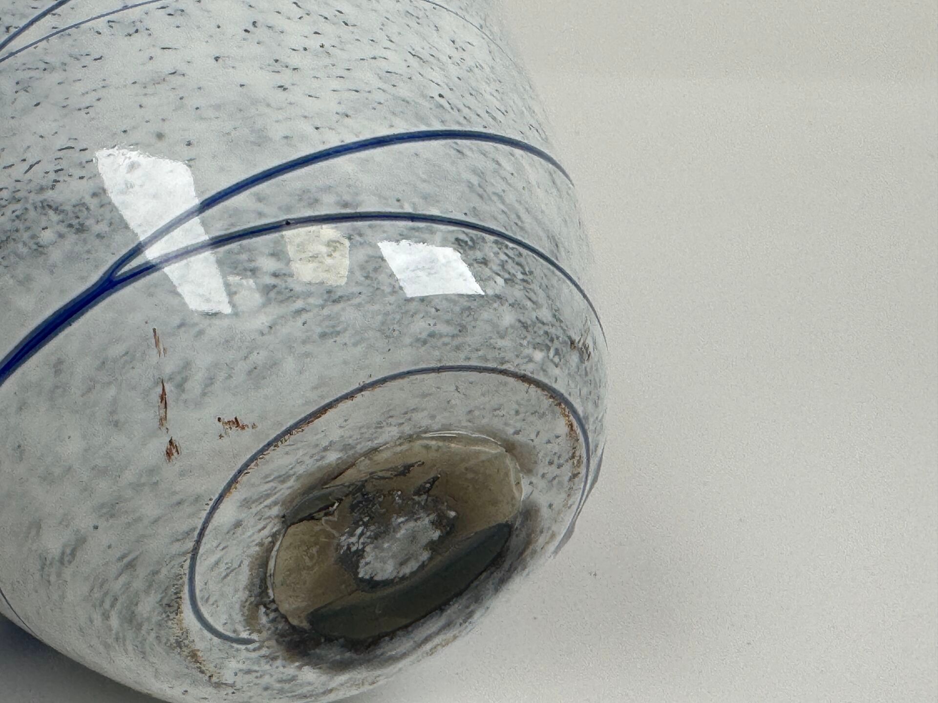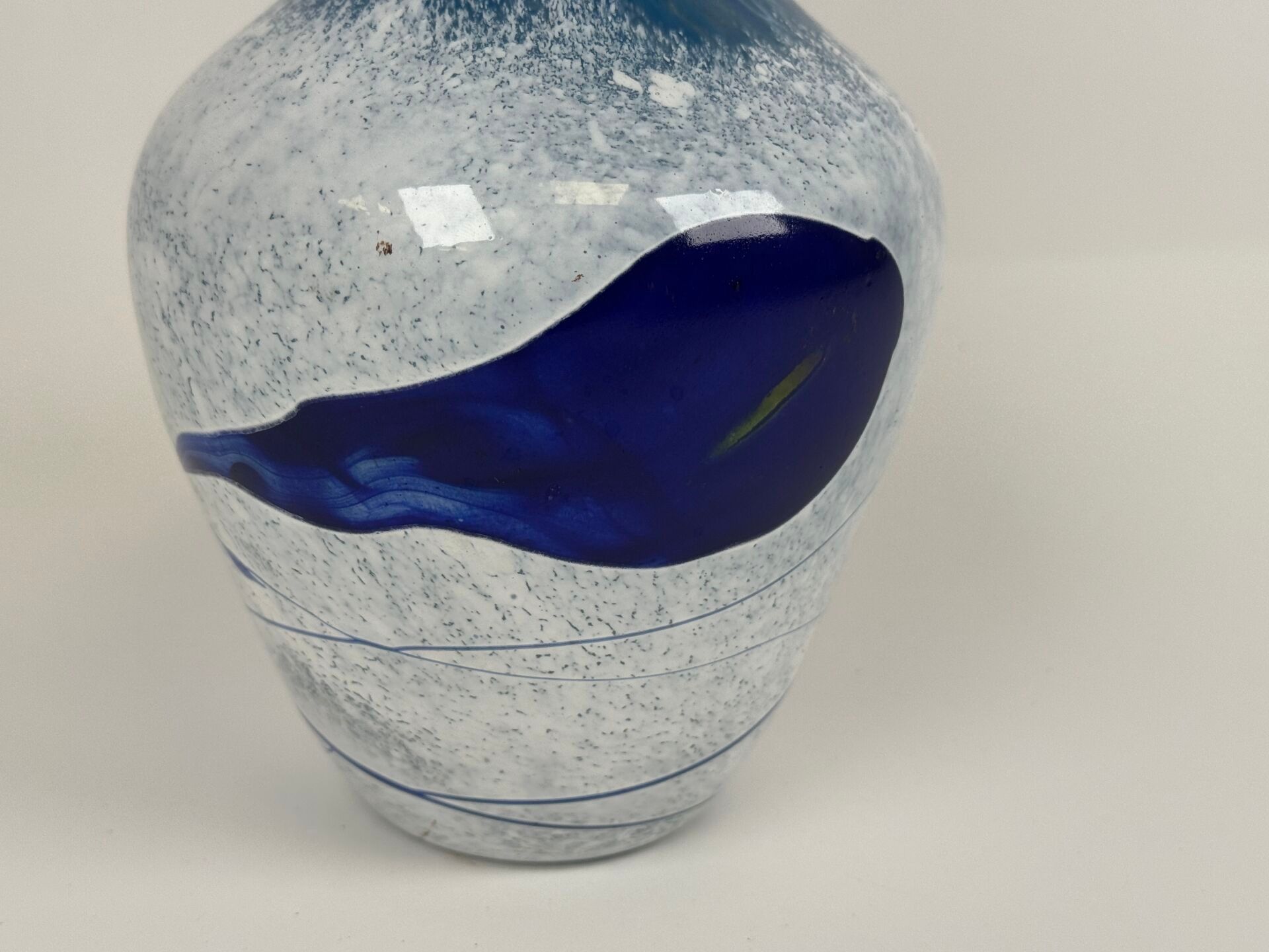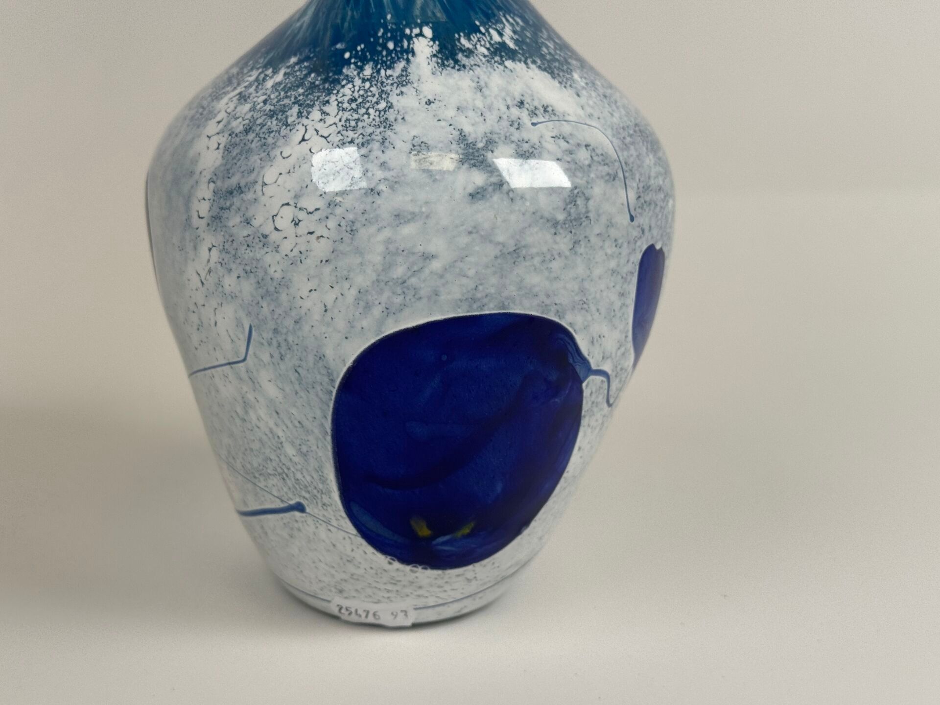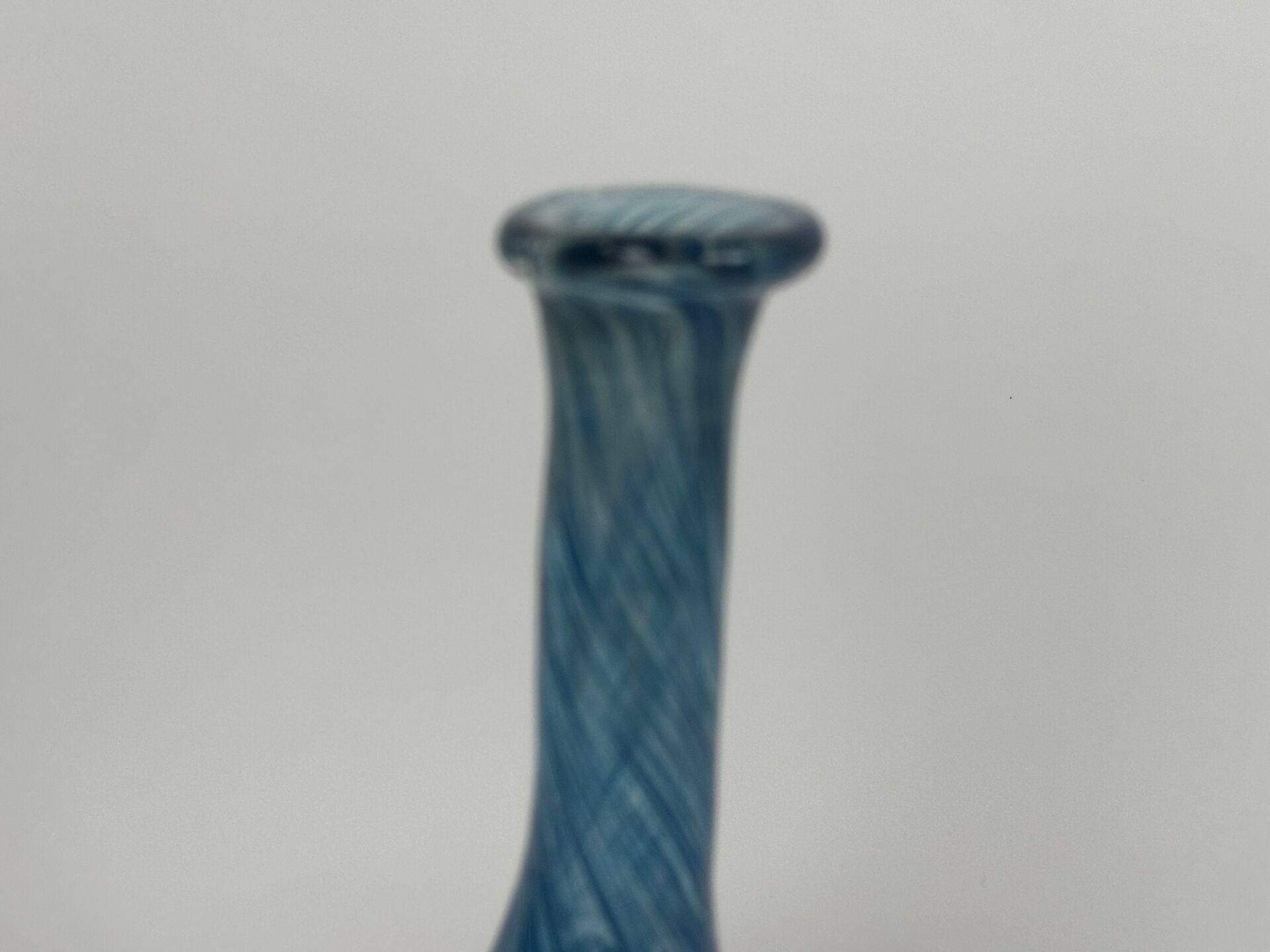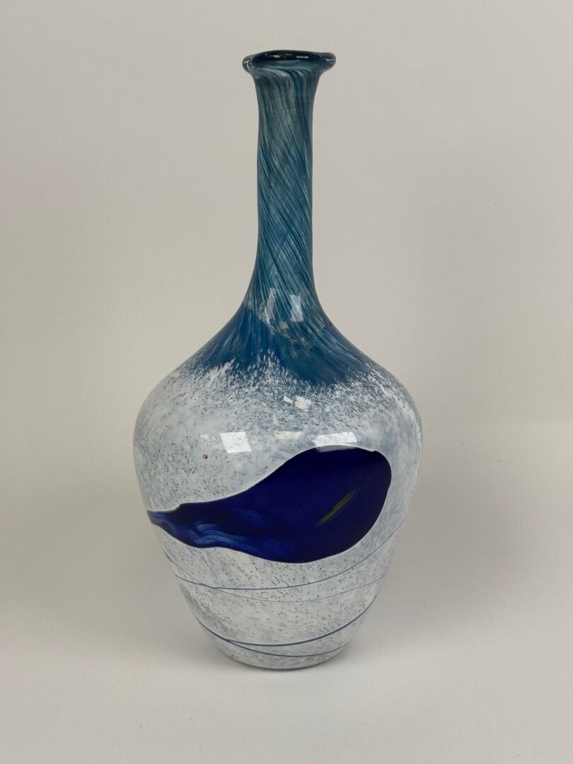 Long-necked vase in blown glass tinted in the mass in shades of blue and white.