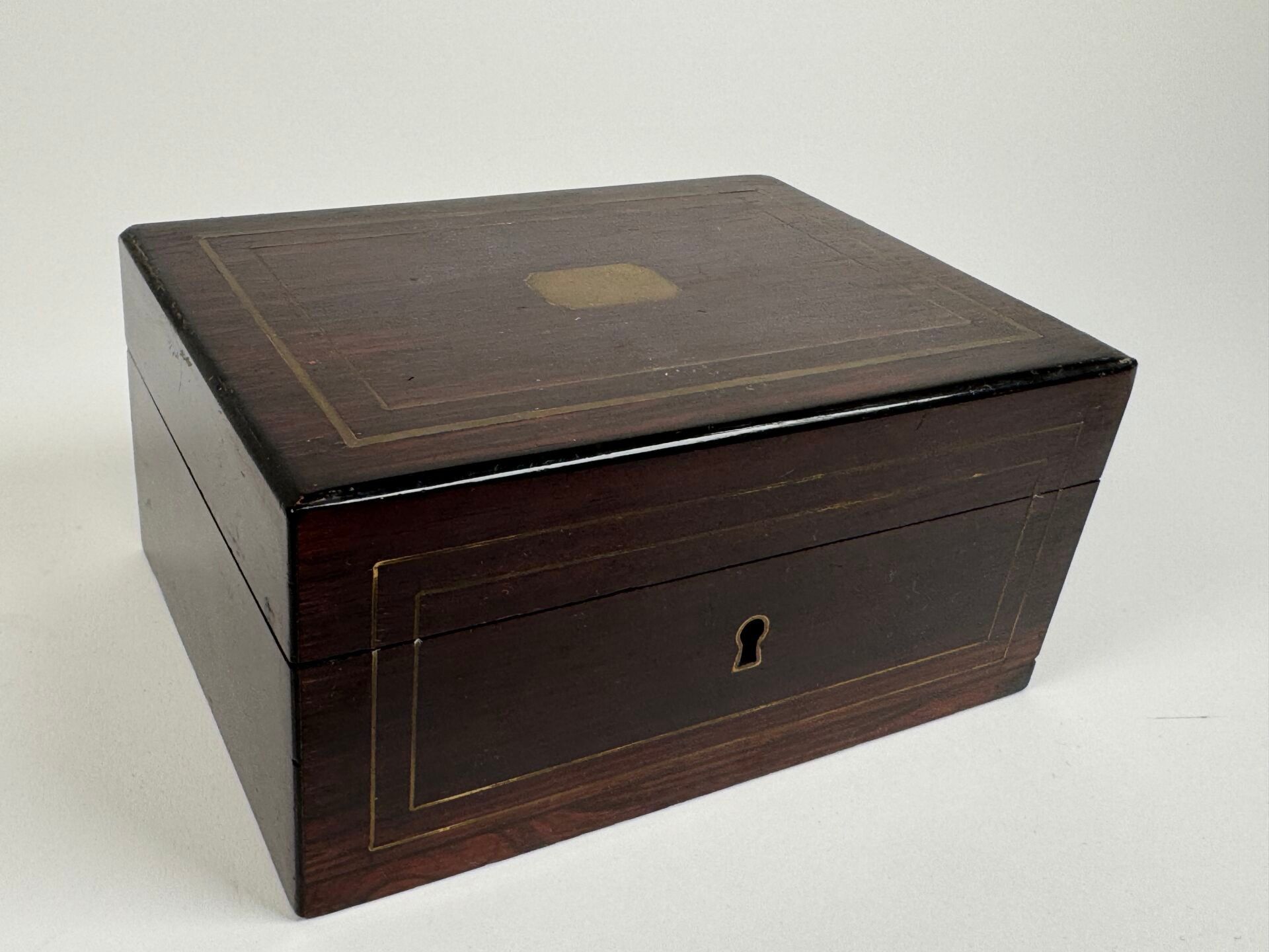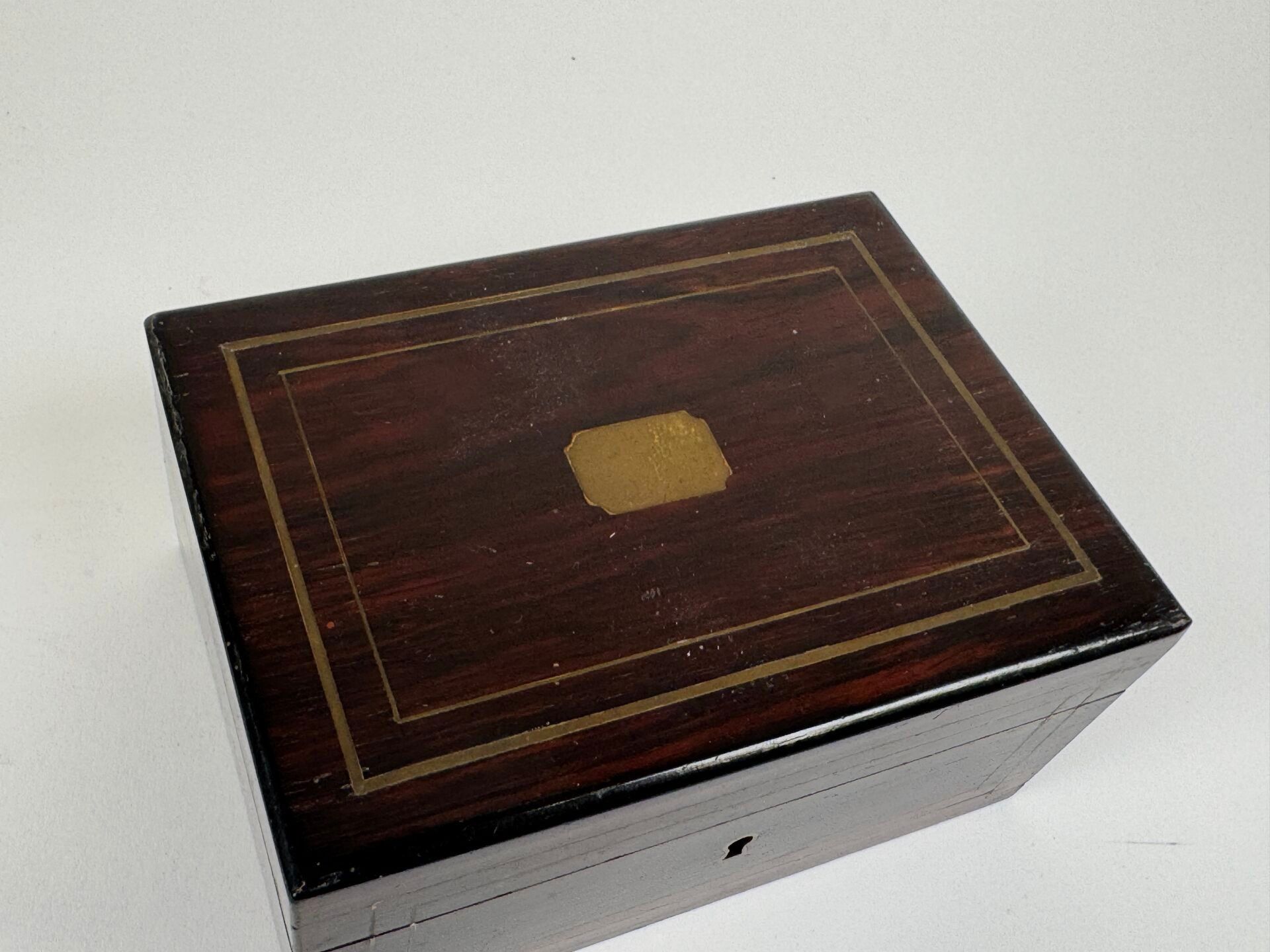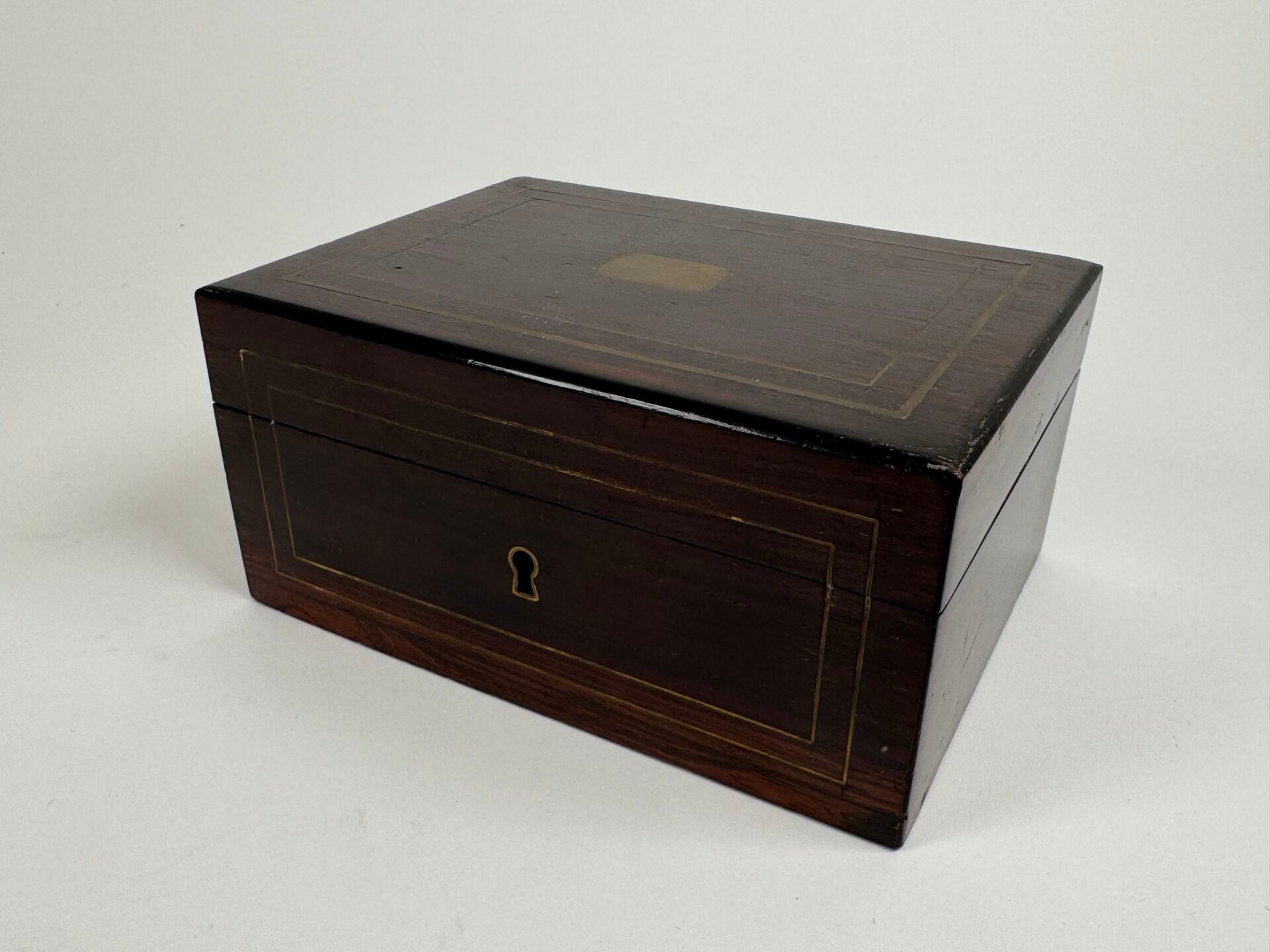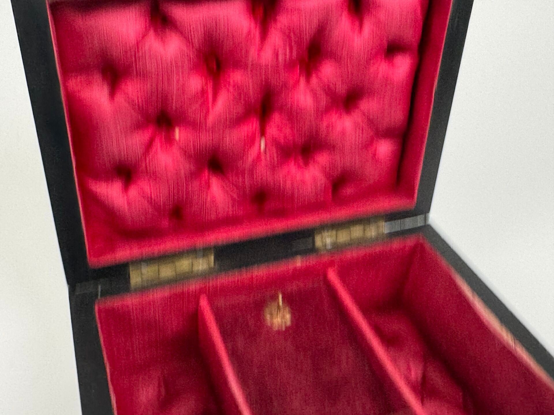 Wooden jewellery box with brass fillets and compartments, lined with burgundy silk and velvet.