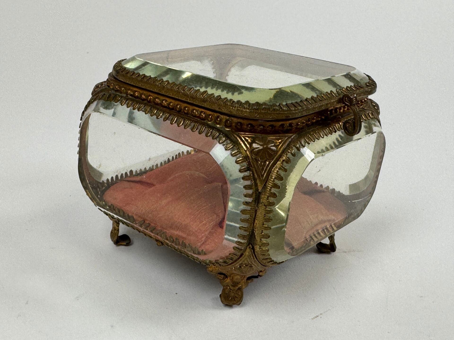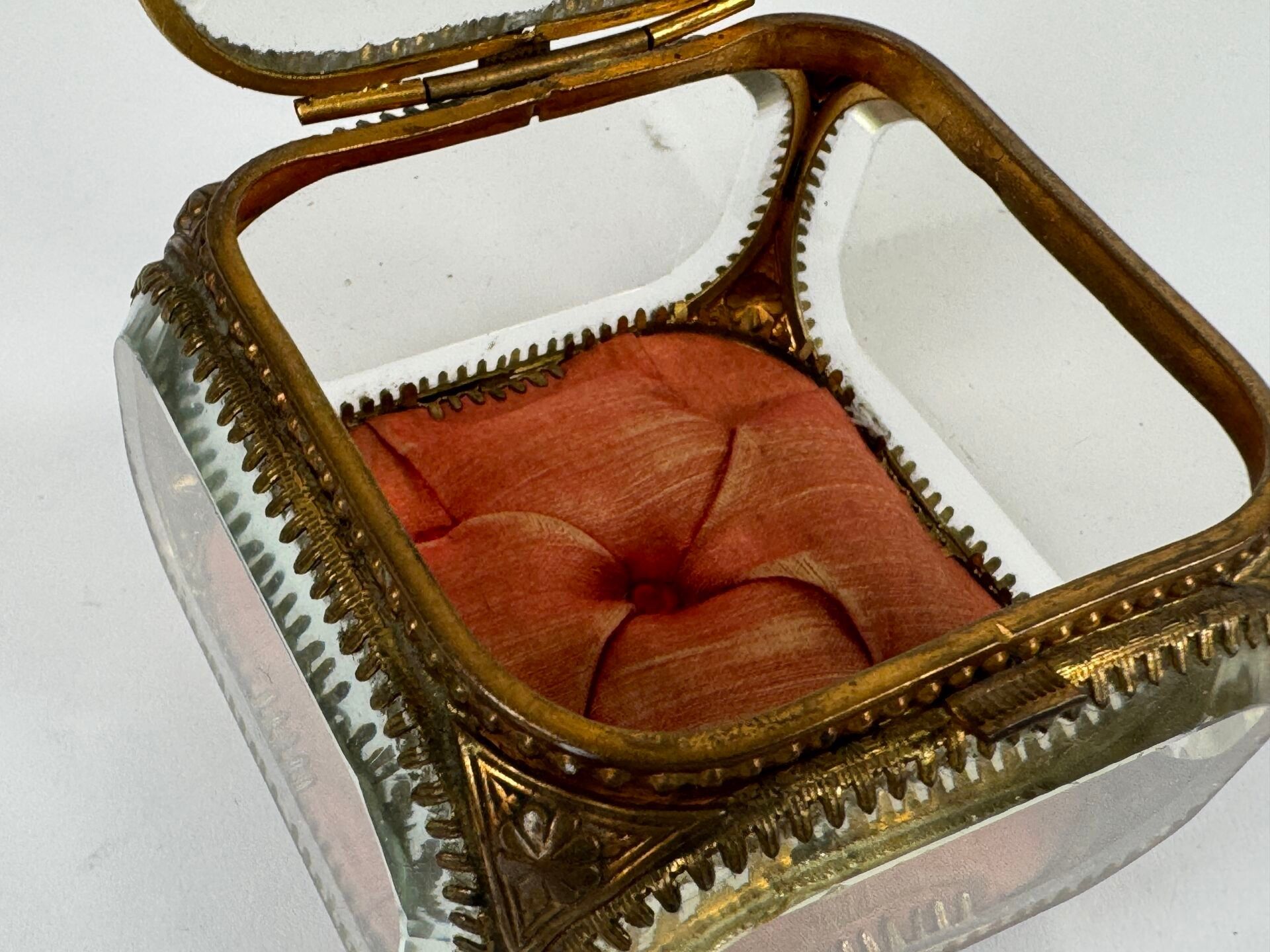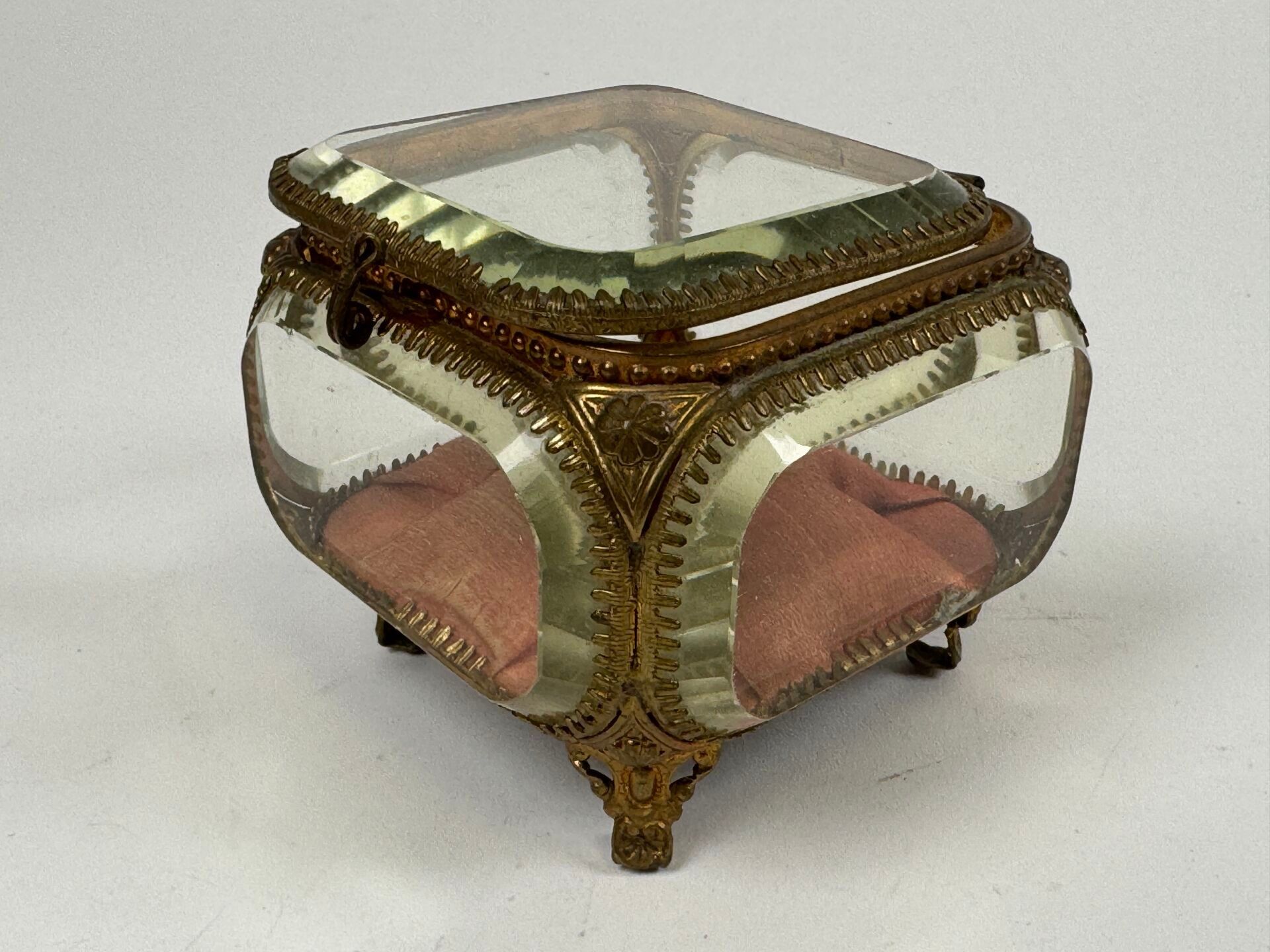 Chased brass jewellery box, the glasses bevelled on all sides, the interior pink silk upholstery.