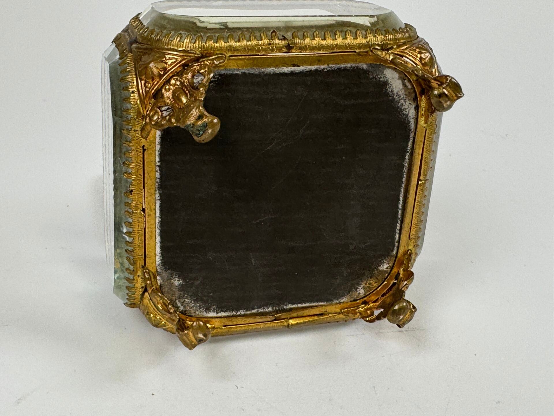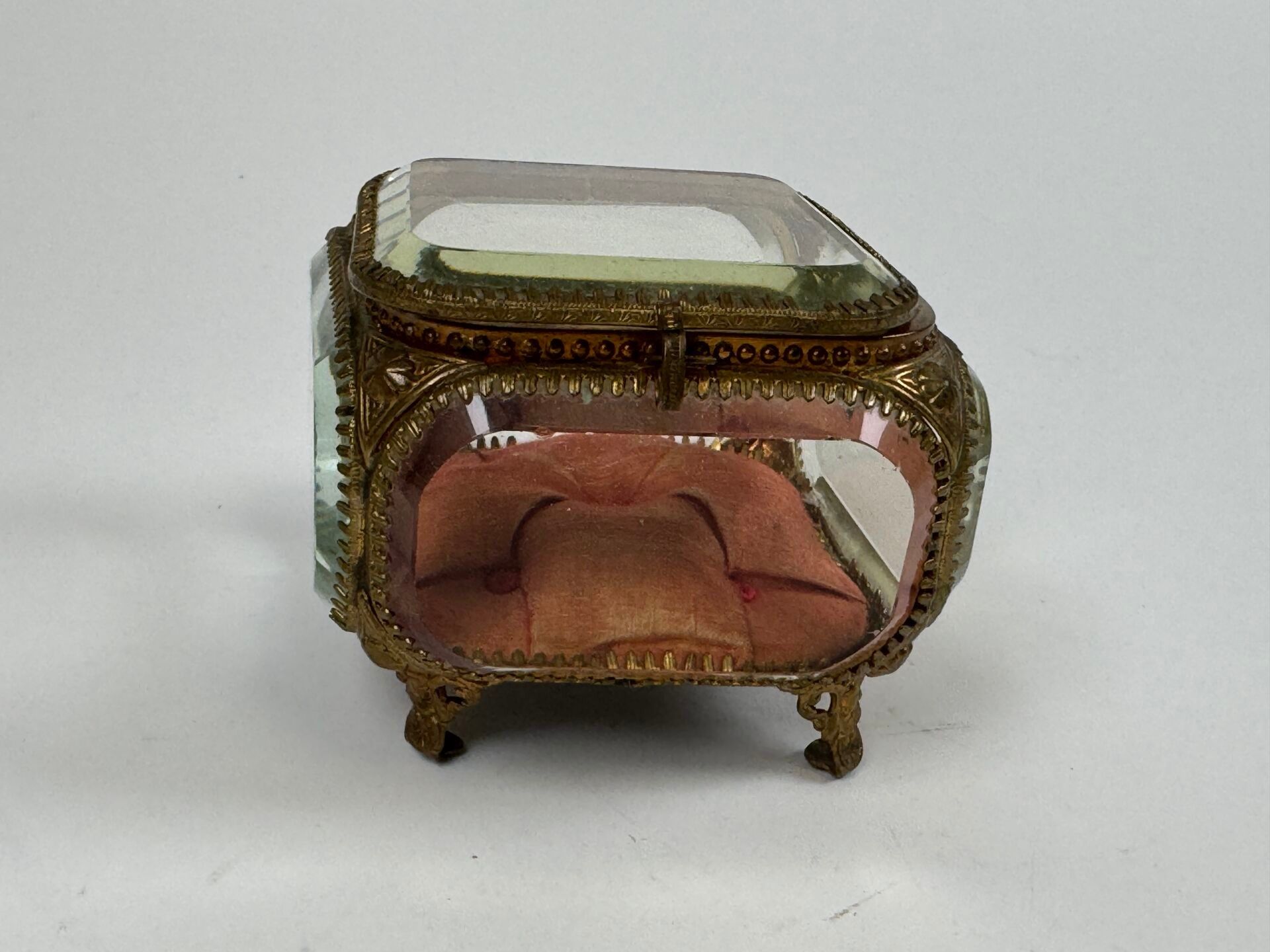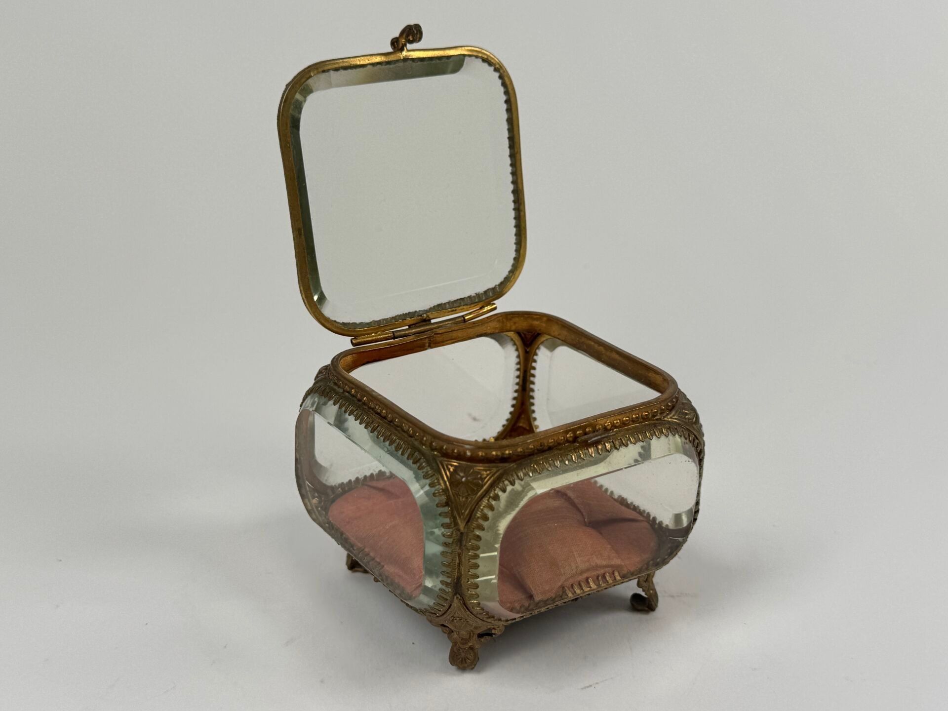 Chased brass jewellery box, the glasses bevelled on all sides, the interior pink silk upholstery.