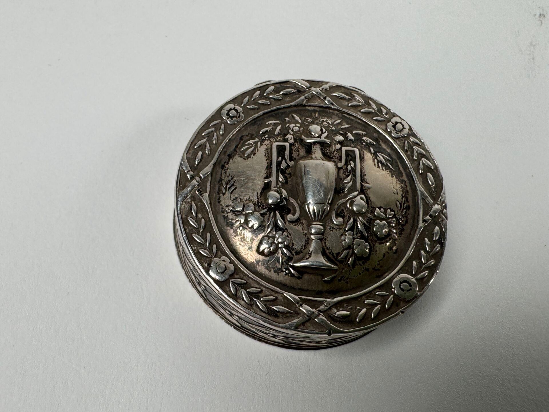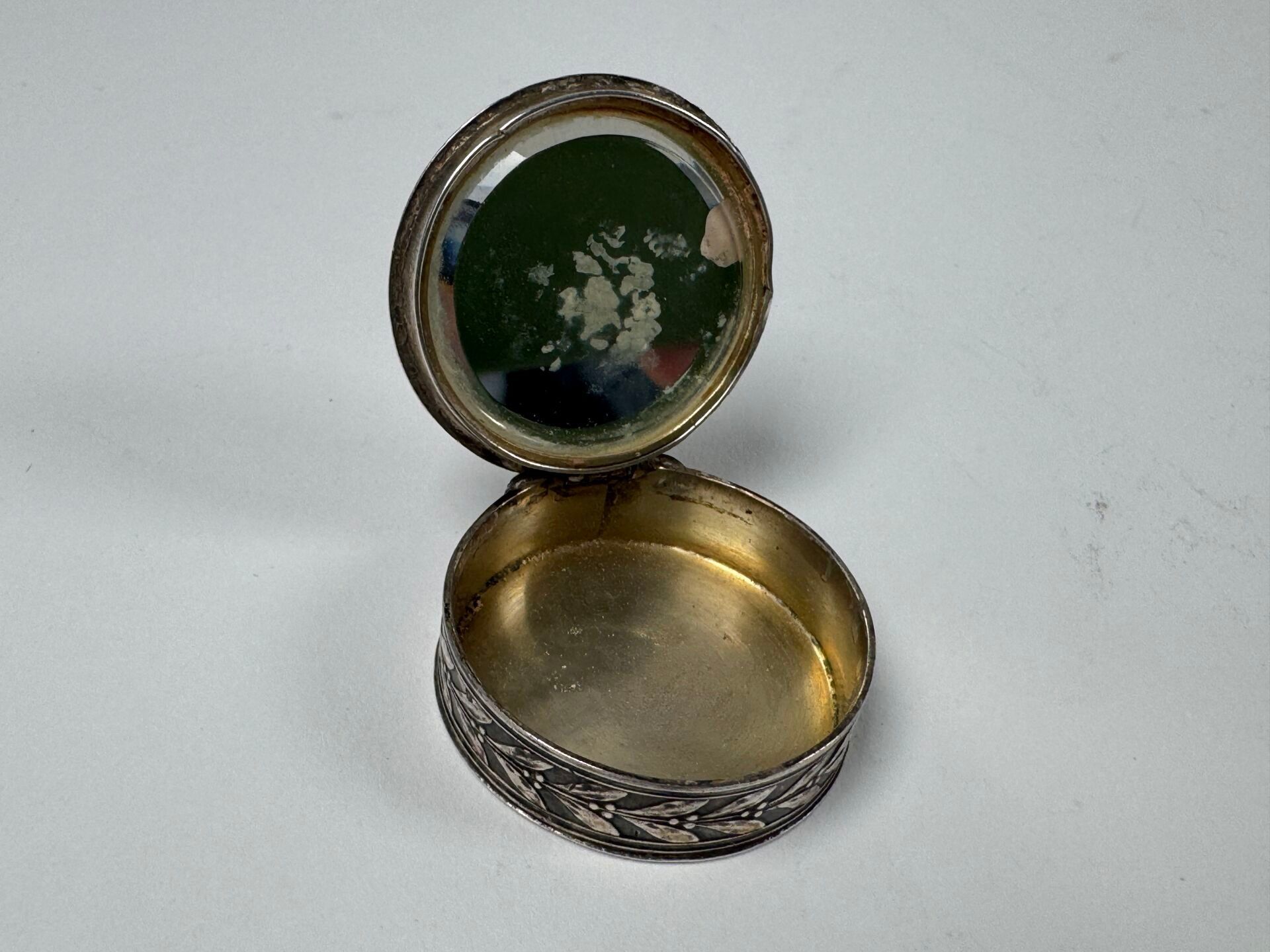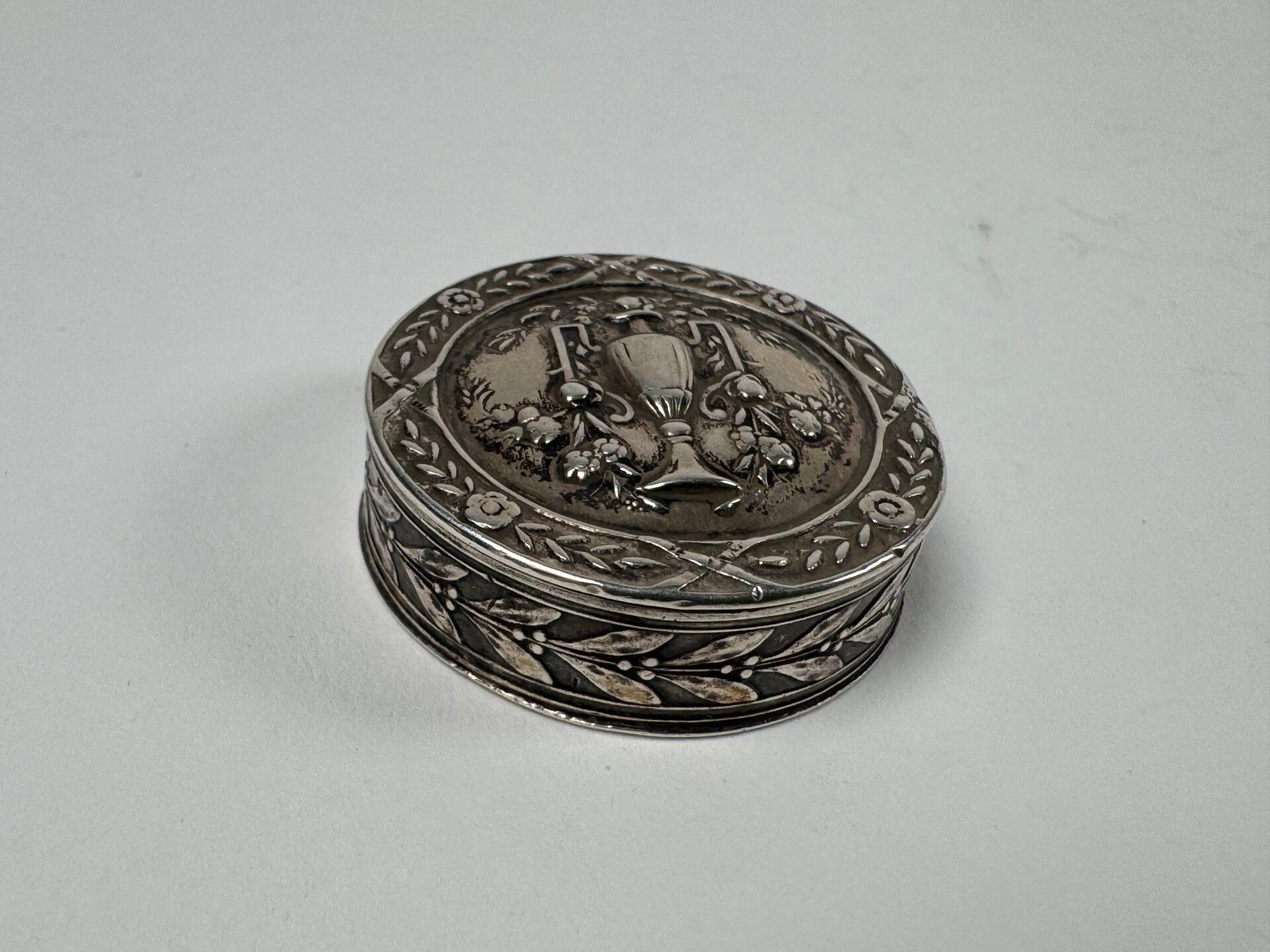 A 950/1000 silver tureen decorated with an amphora and laurels around the rim, the inside revealing a mirror.
