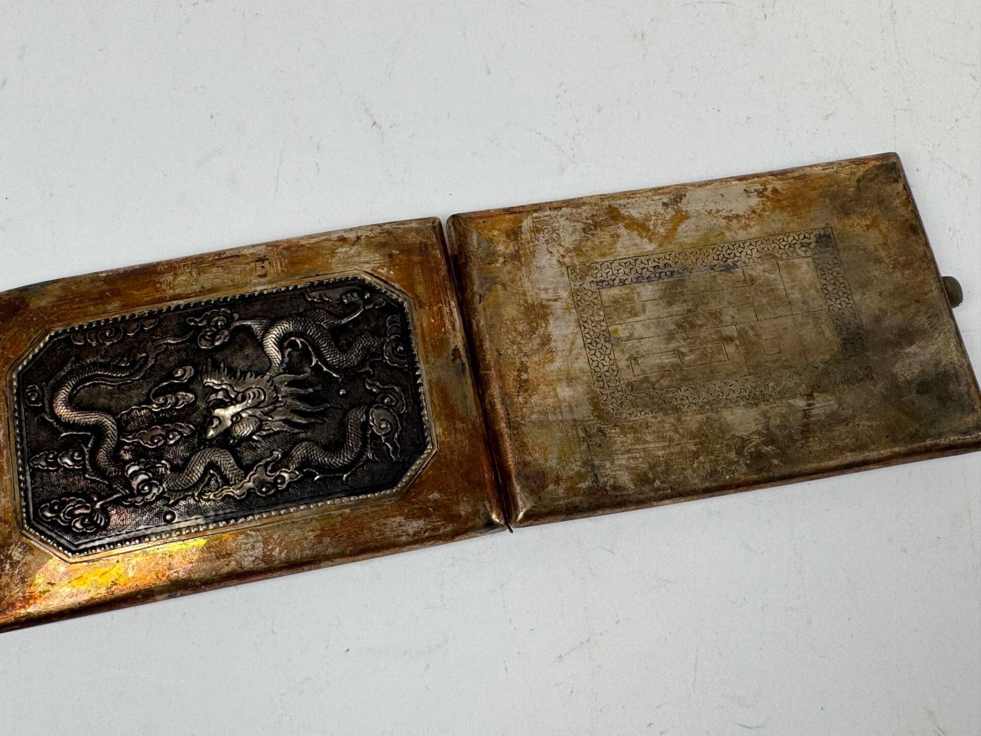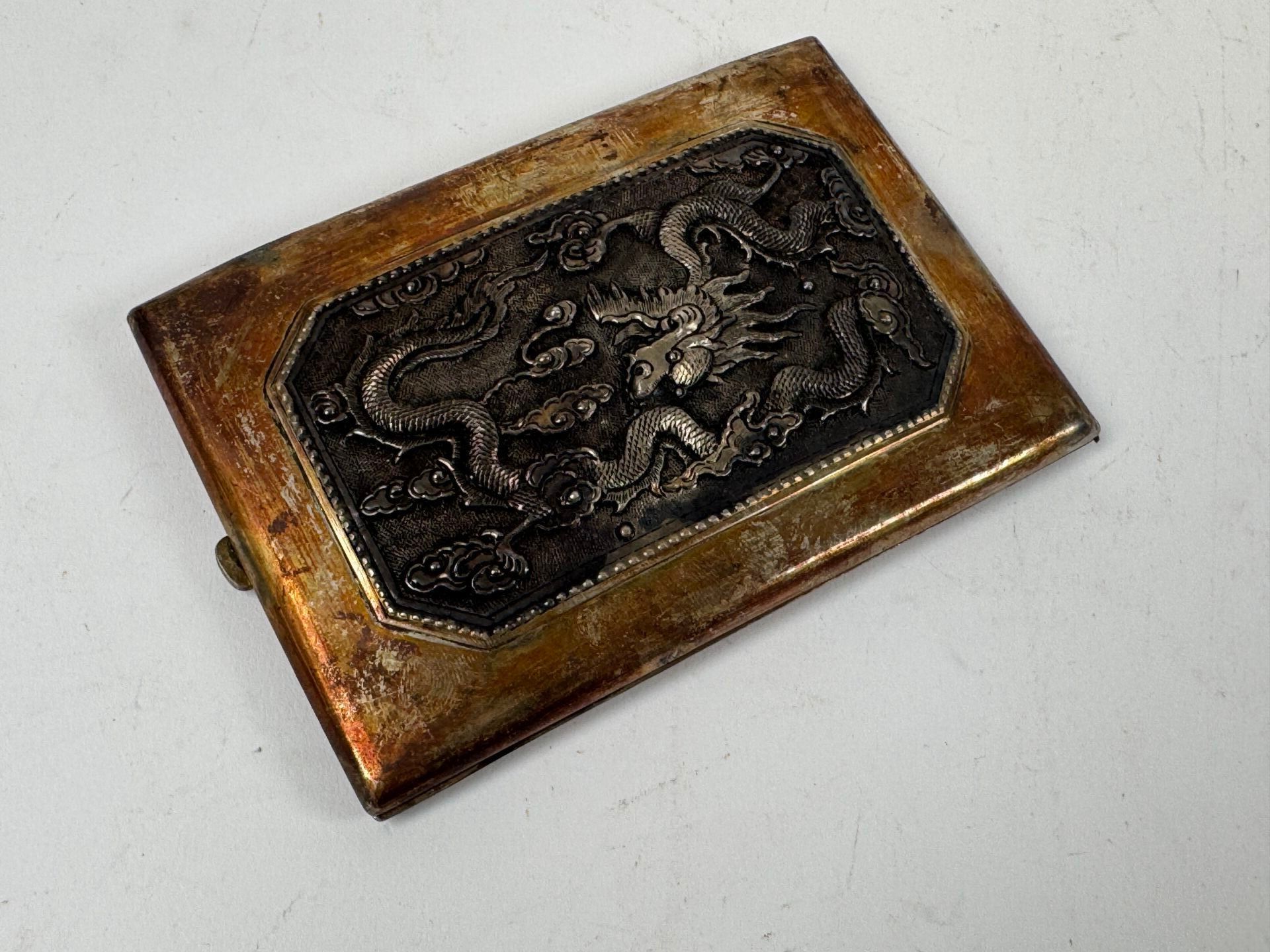 Cigarette case probably in foreign silver decorated with stylised dragons.