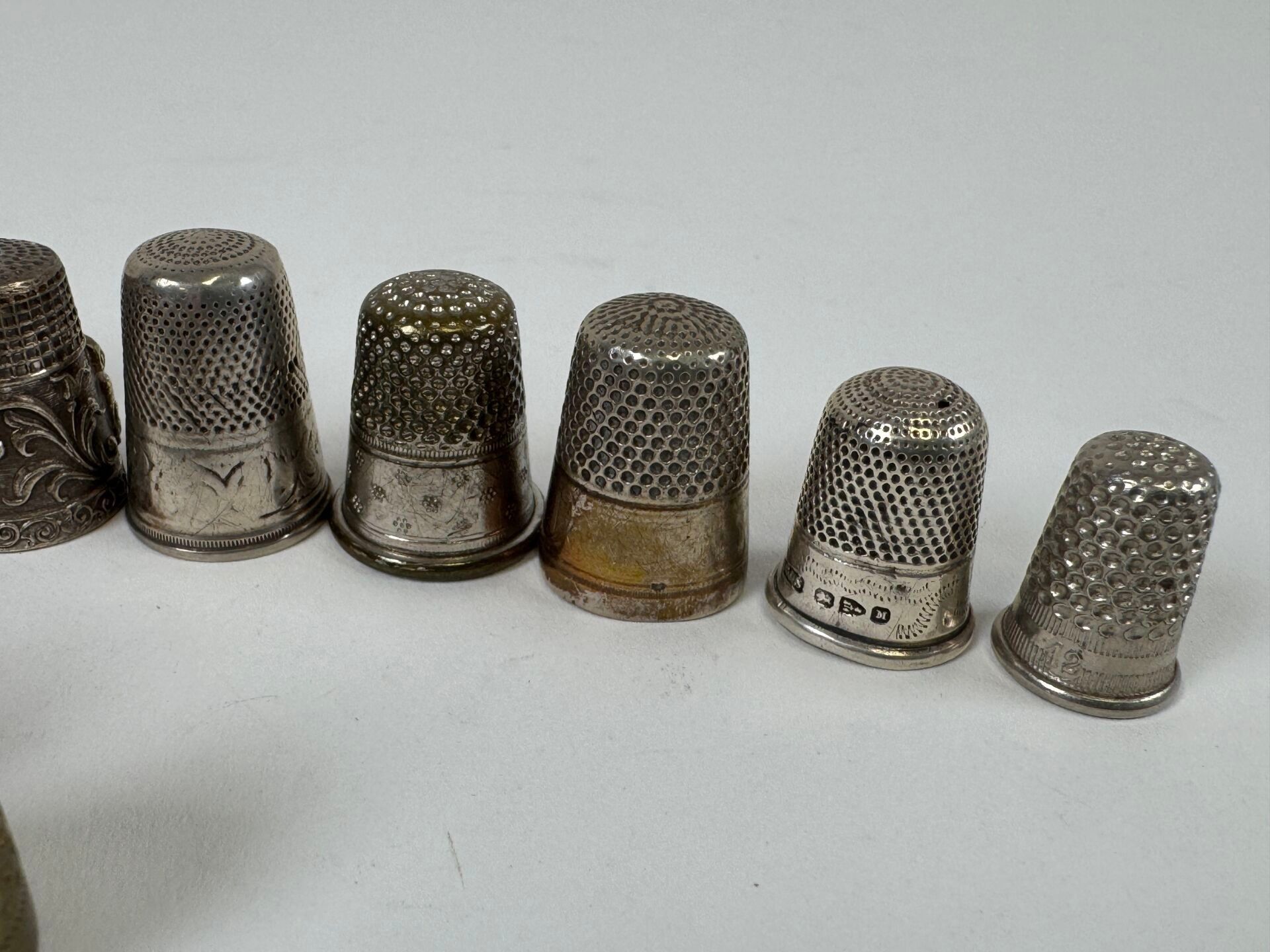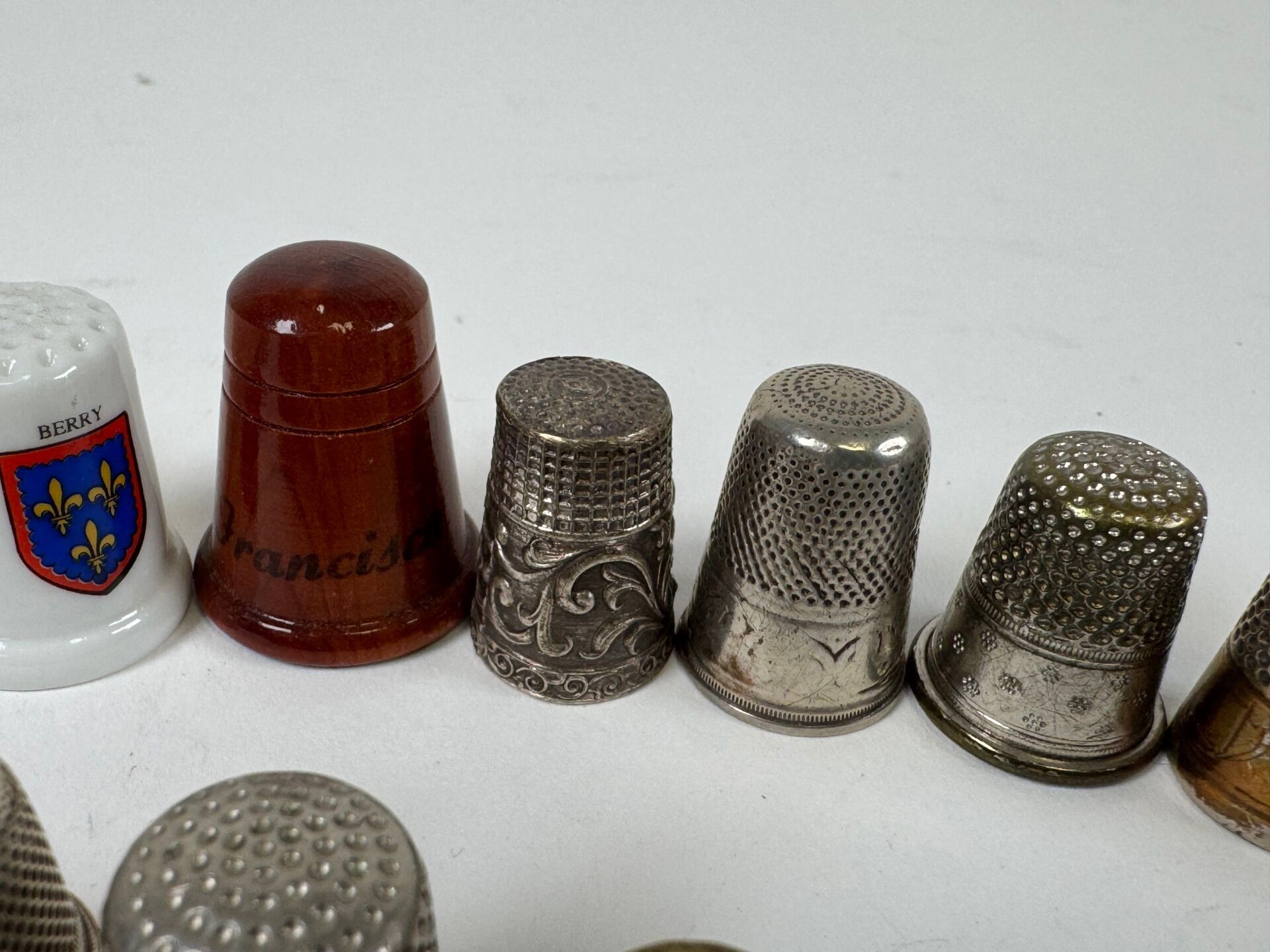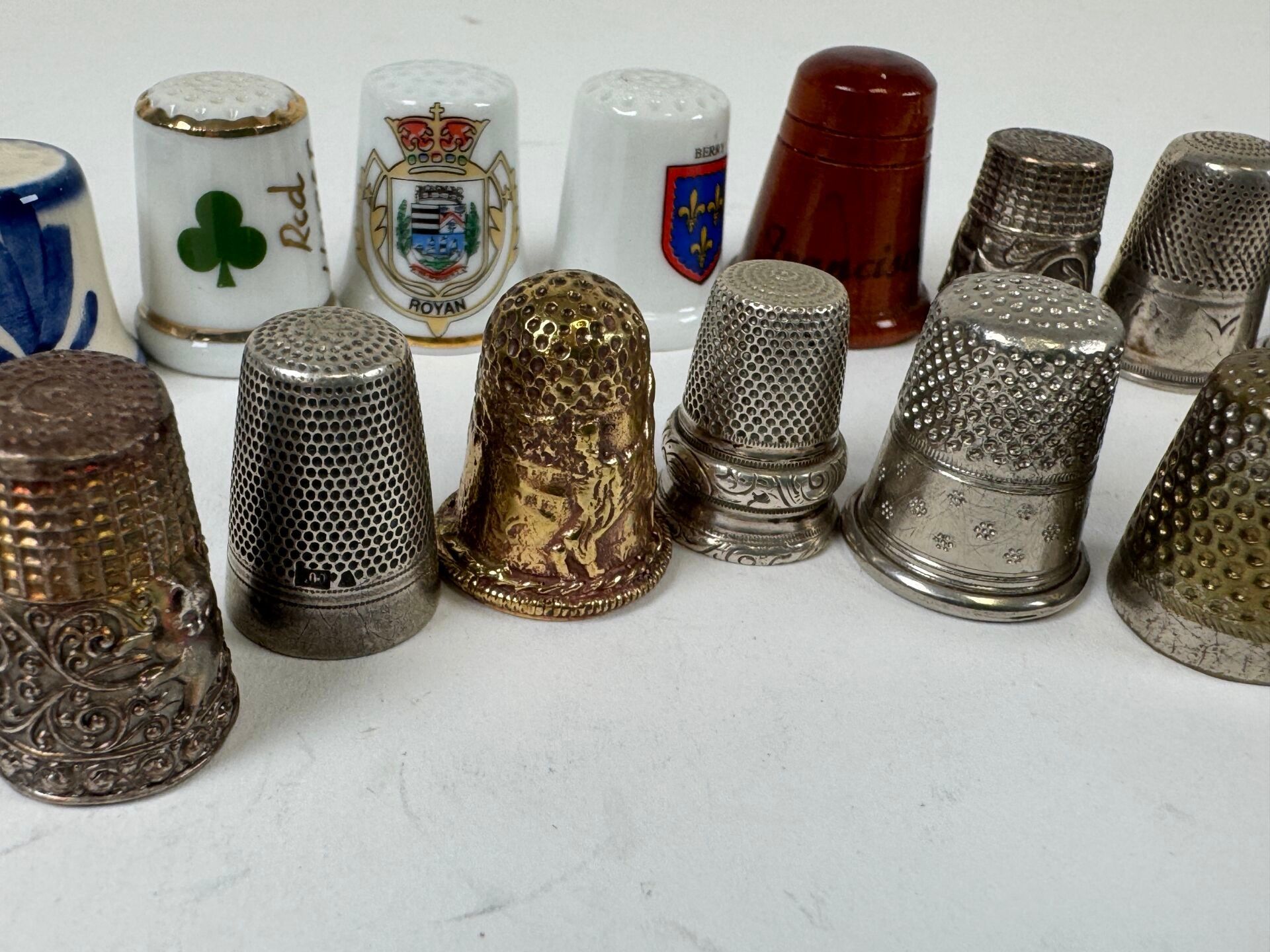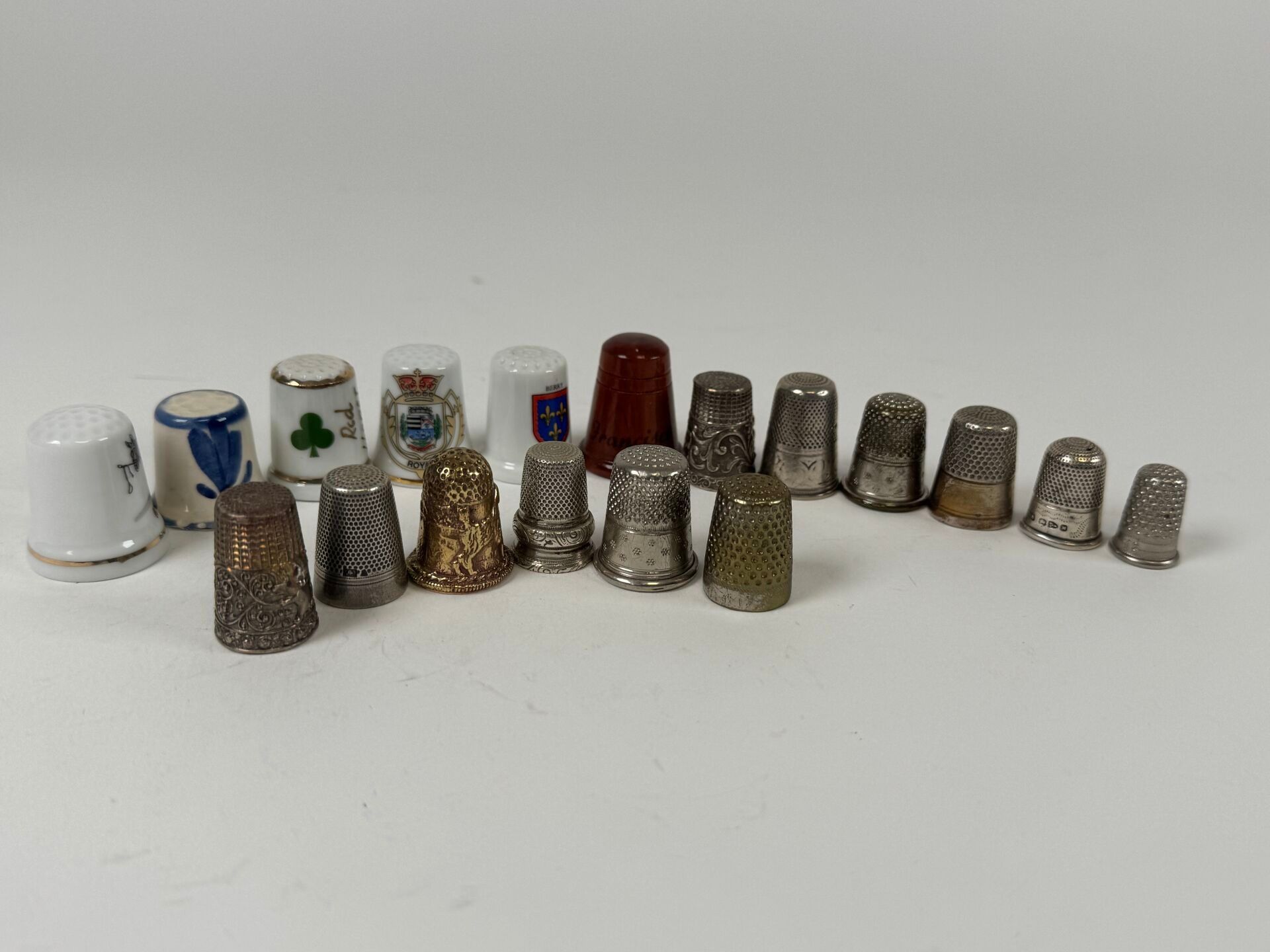 Collection of 18 silver, silver-plated metal, porcelain and wood thimbles.