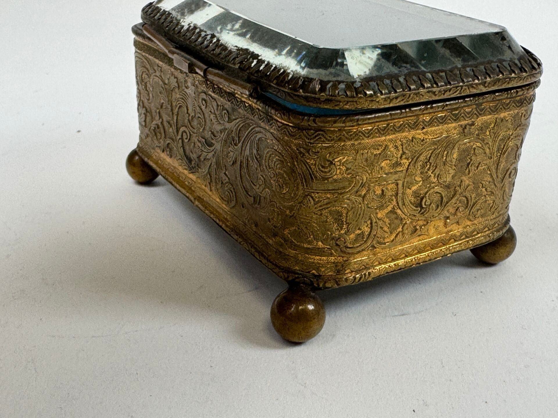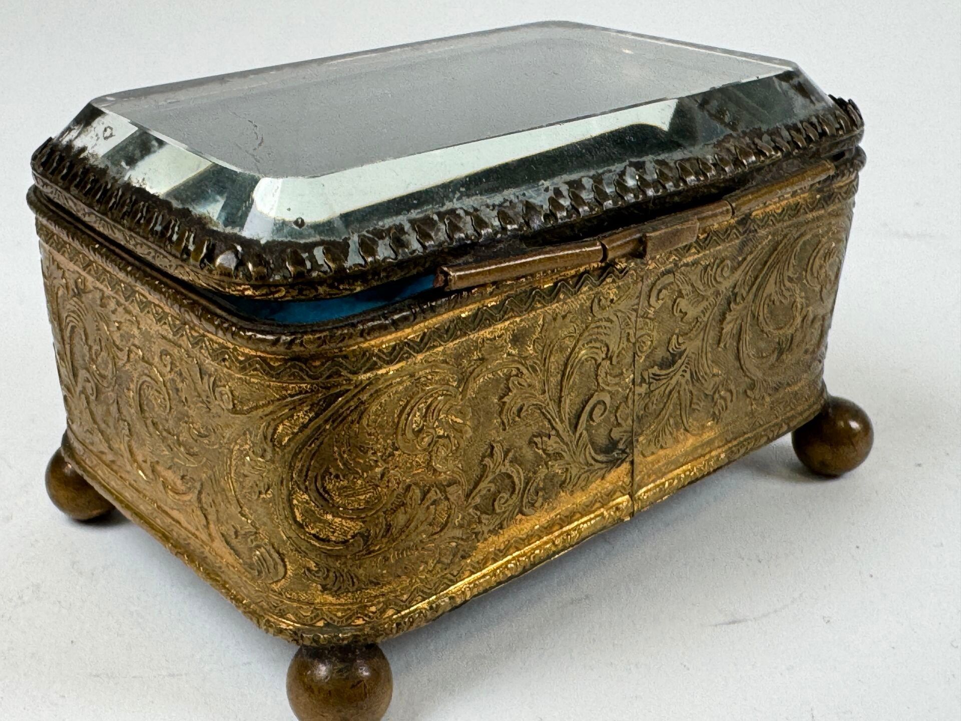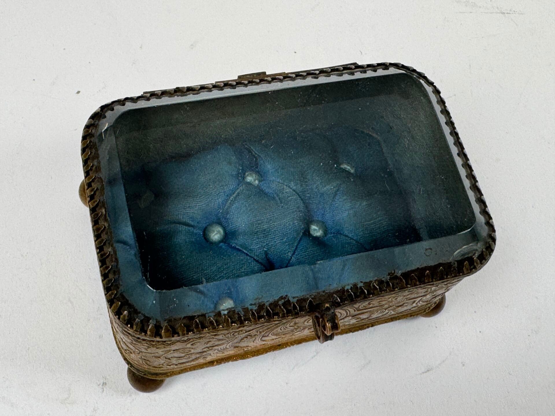 Rectangular chased brass jewellery box, bevelled glass lid, blue padded silk interior.