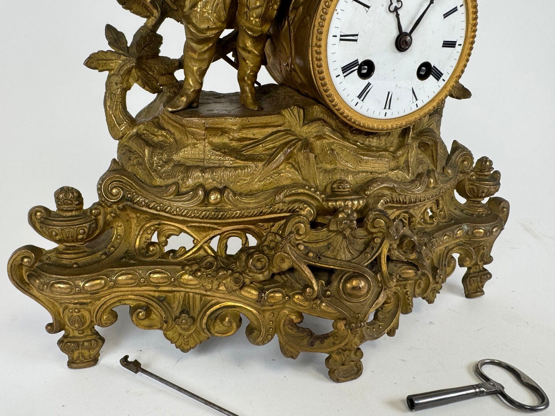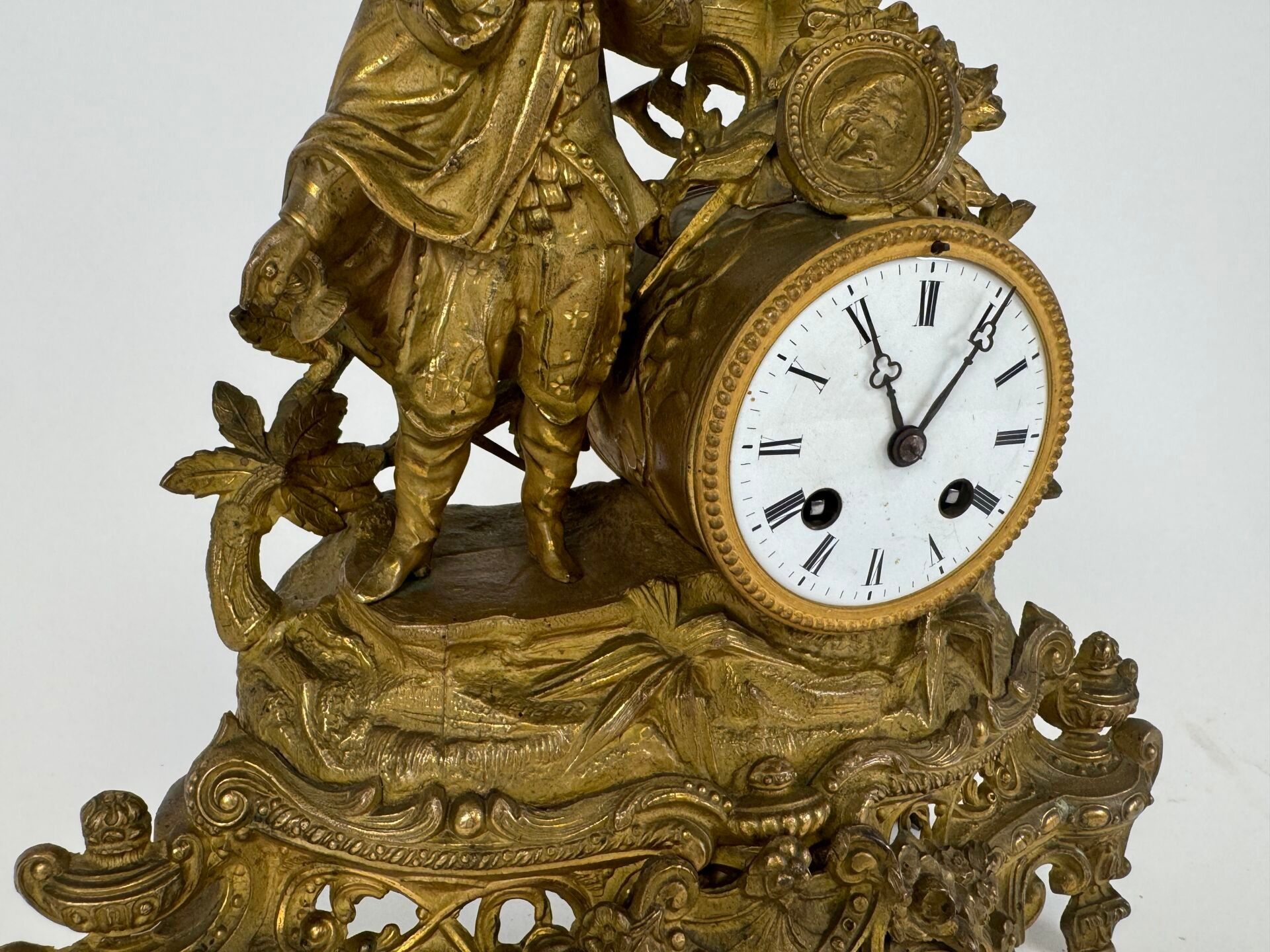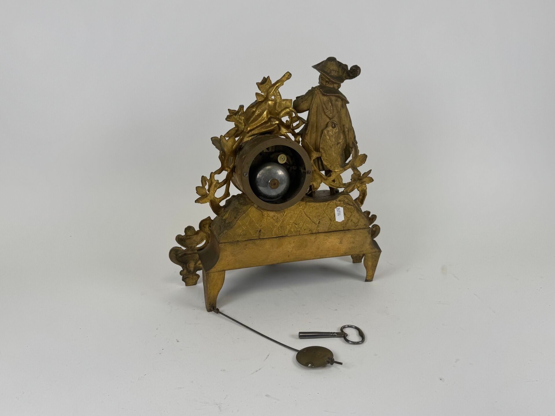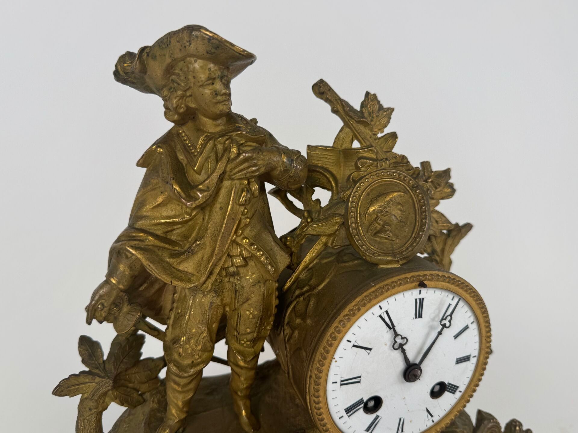 Regule clock with golden patina, the enamelled dial with Roman numerals.