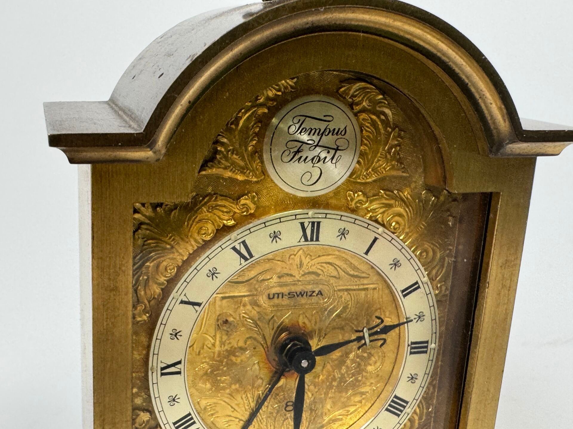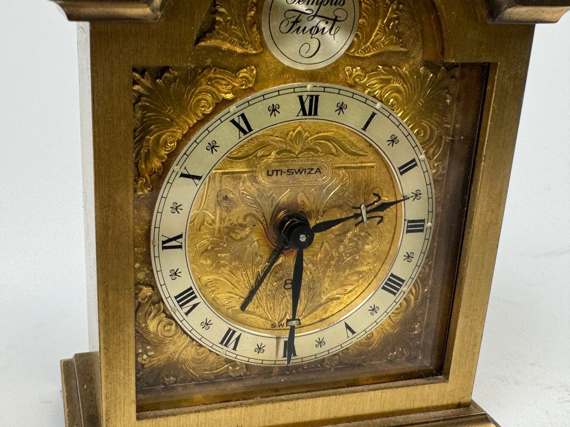 UTI-SWIZA. Bronze clock, circular dial with Roman numerals.