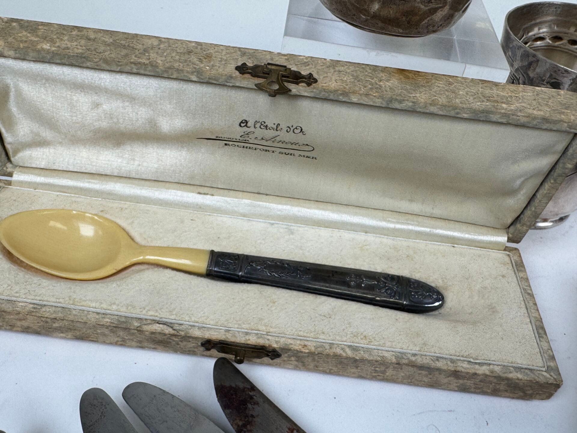 Two kettledrums, a boiling spoon, an egg cup and its teaspoon, a forged silver, gilt metal and ivory shovel.