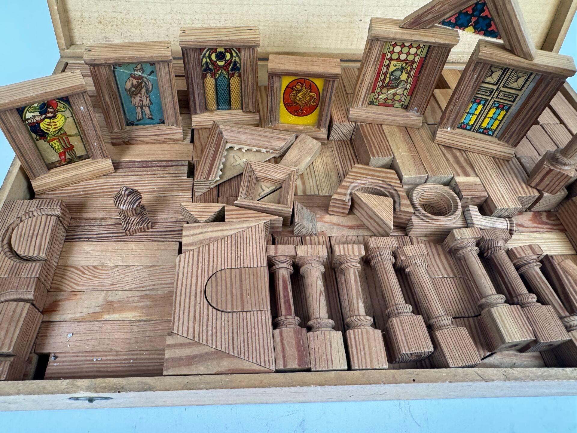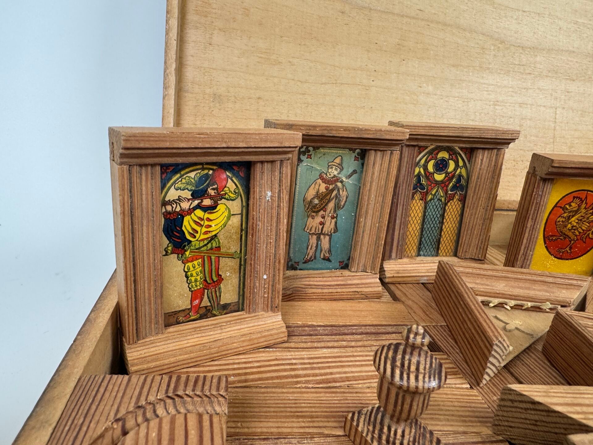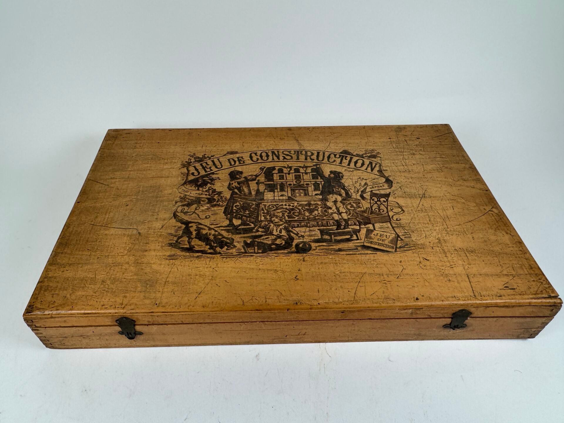 Wooden construction set with numerous elements, some with glass plates decorated in the manner of stained glass. The lid stamped by FOUCAULT, Engraver in Paris.