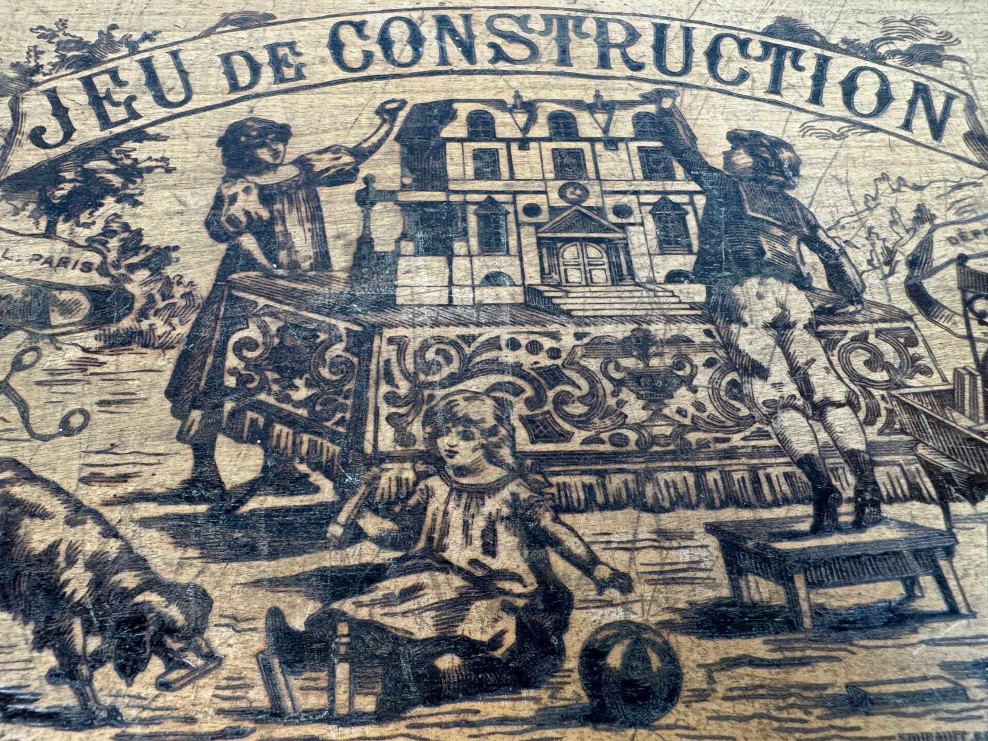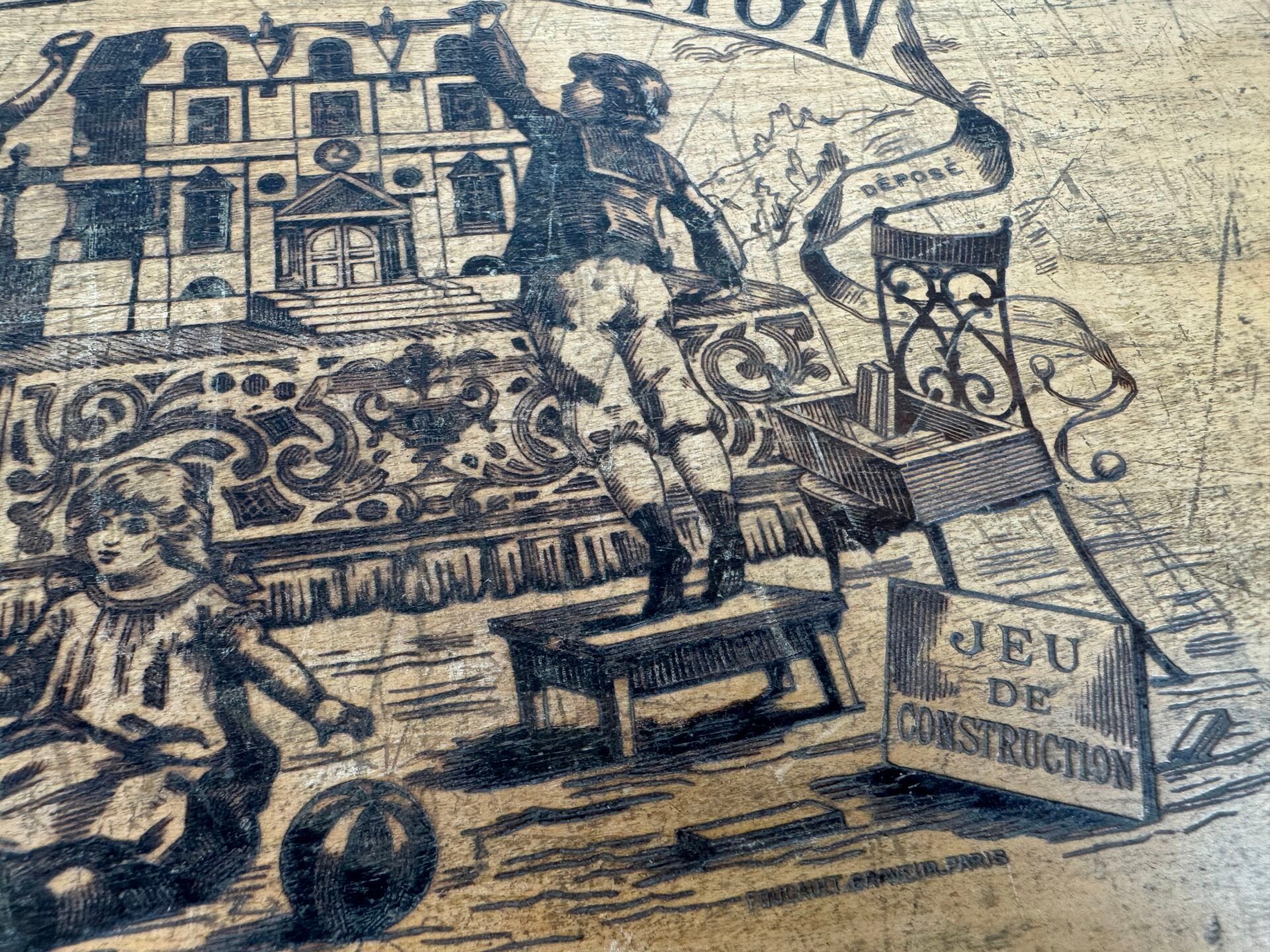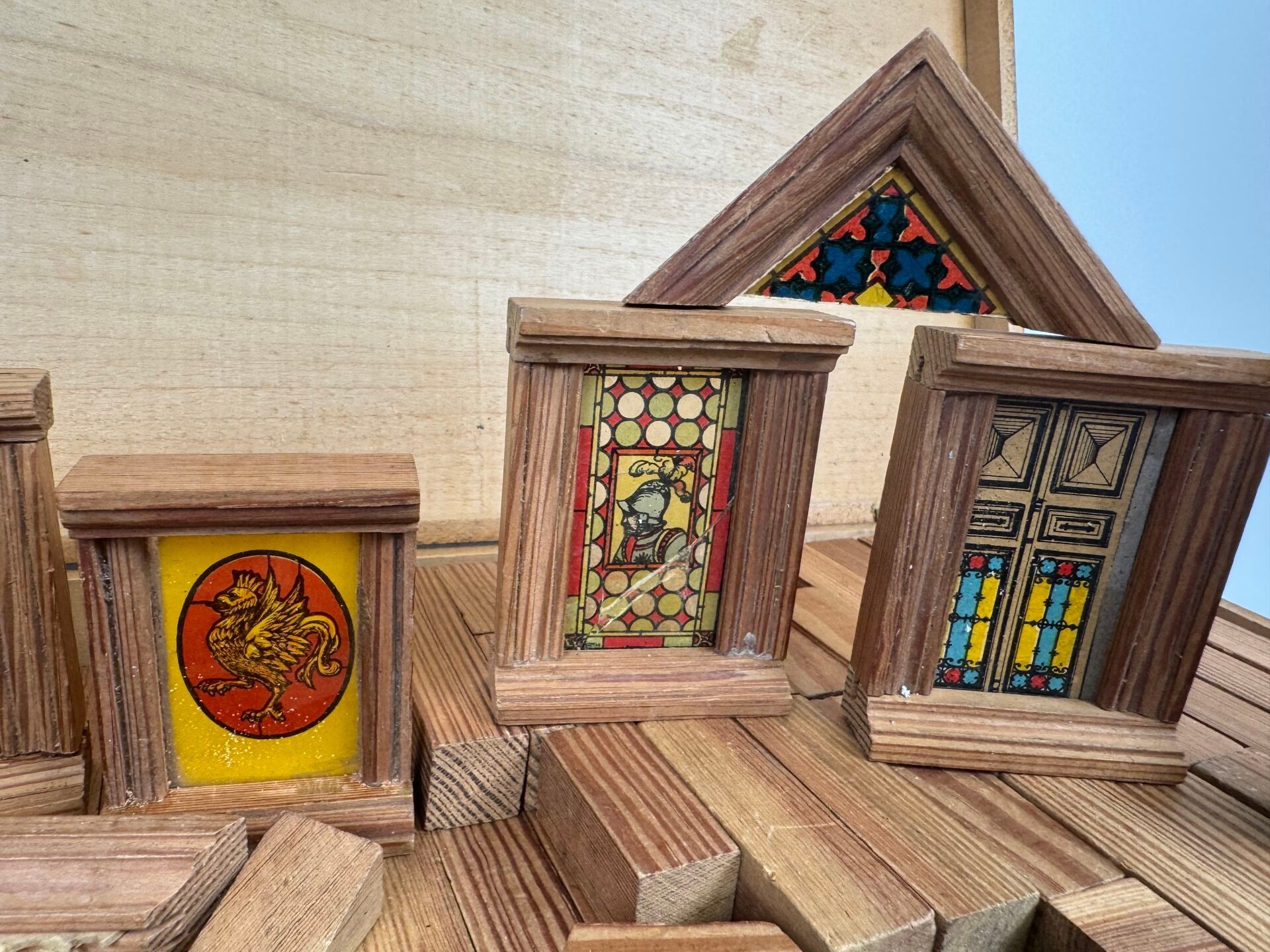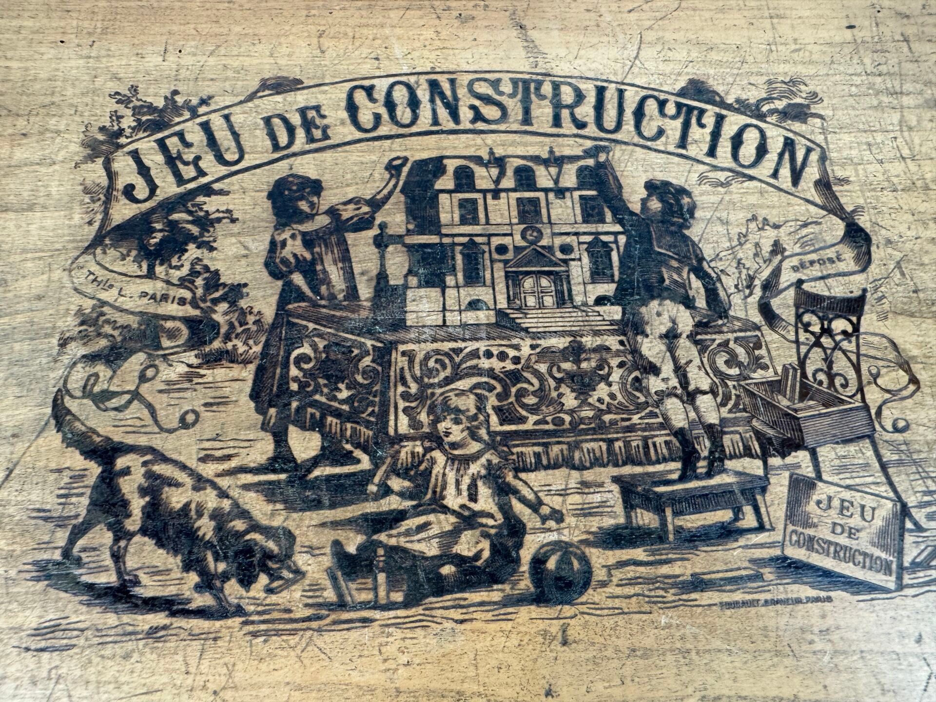 Wooden construction set with numerous elements, some with glass plates decorated in the manner of stained glass. The lid stamped by FOUCAULT, Engraver in Paris.