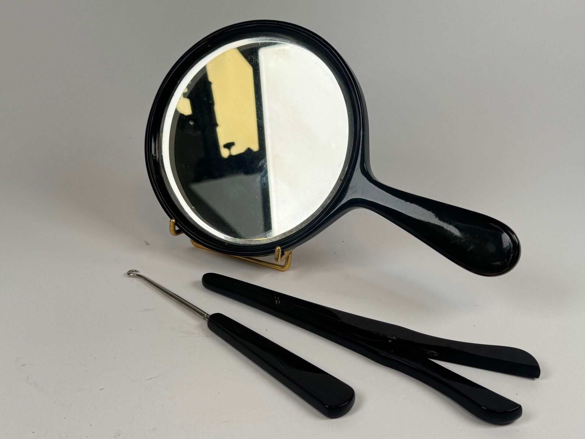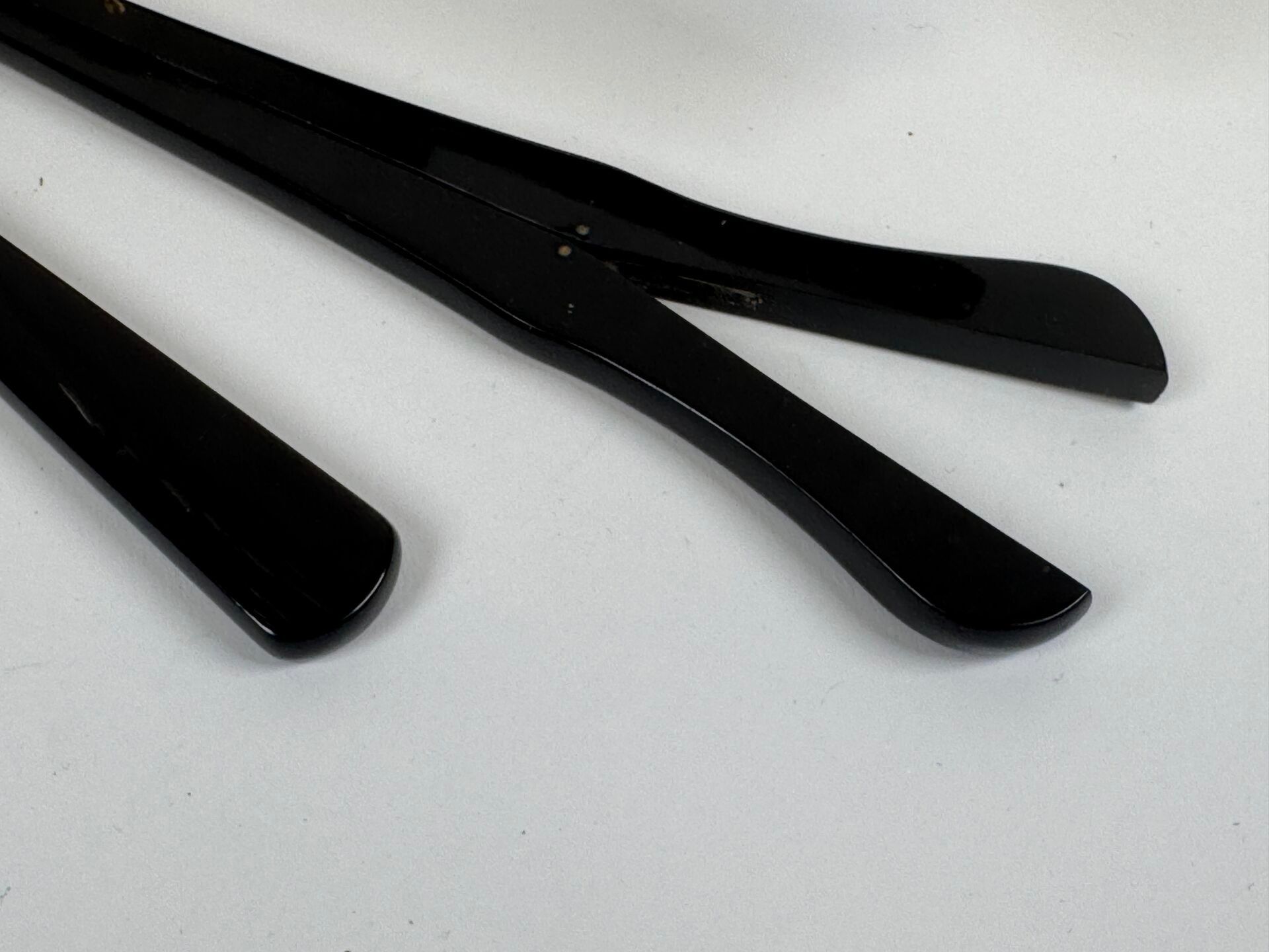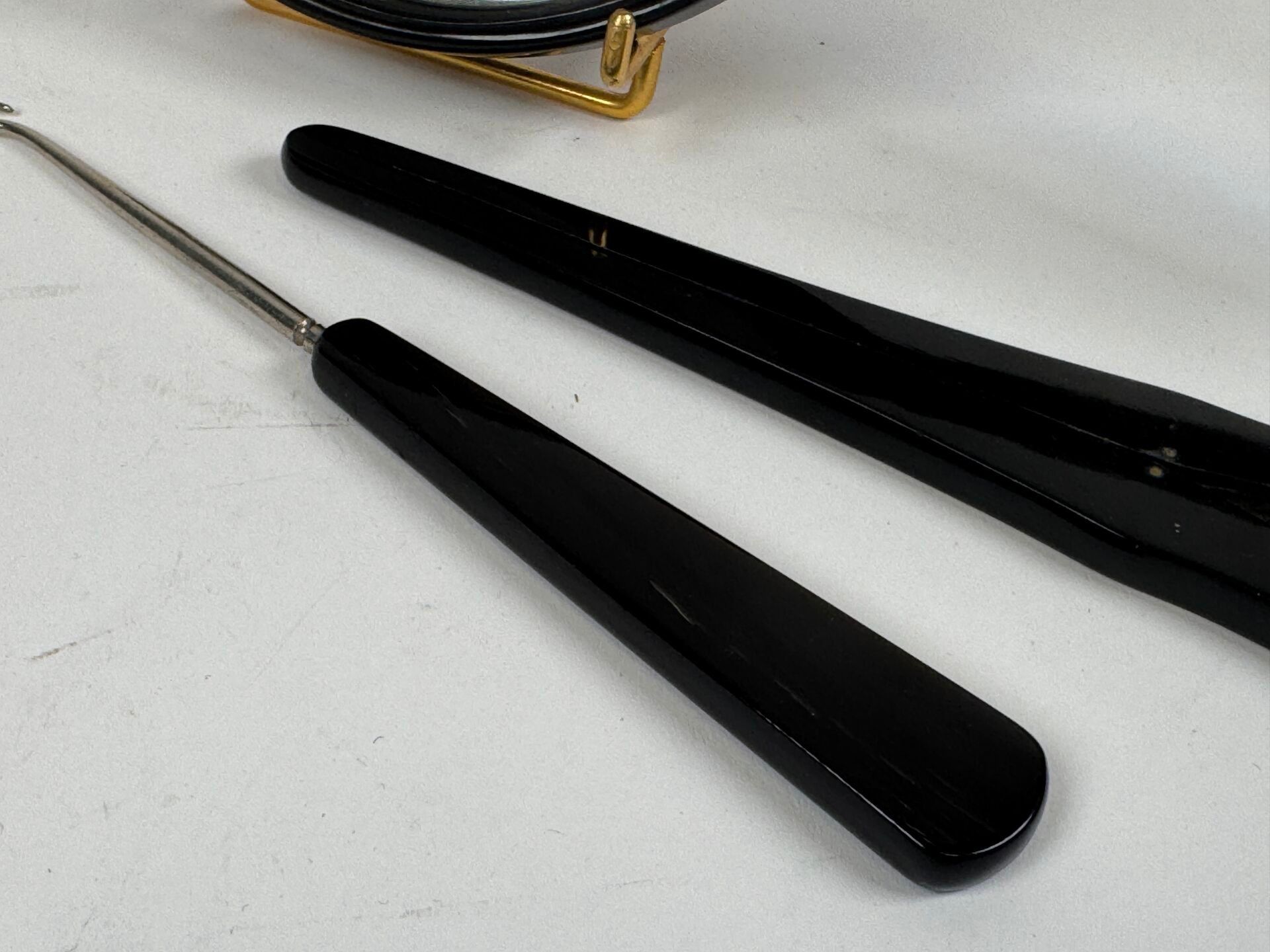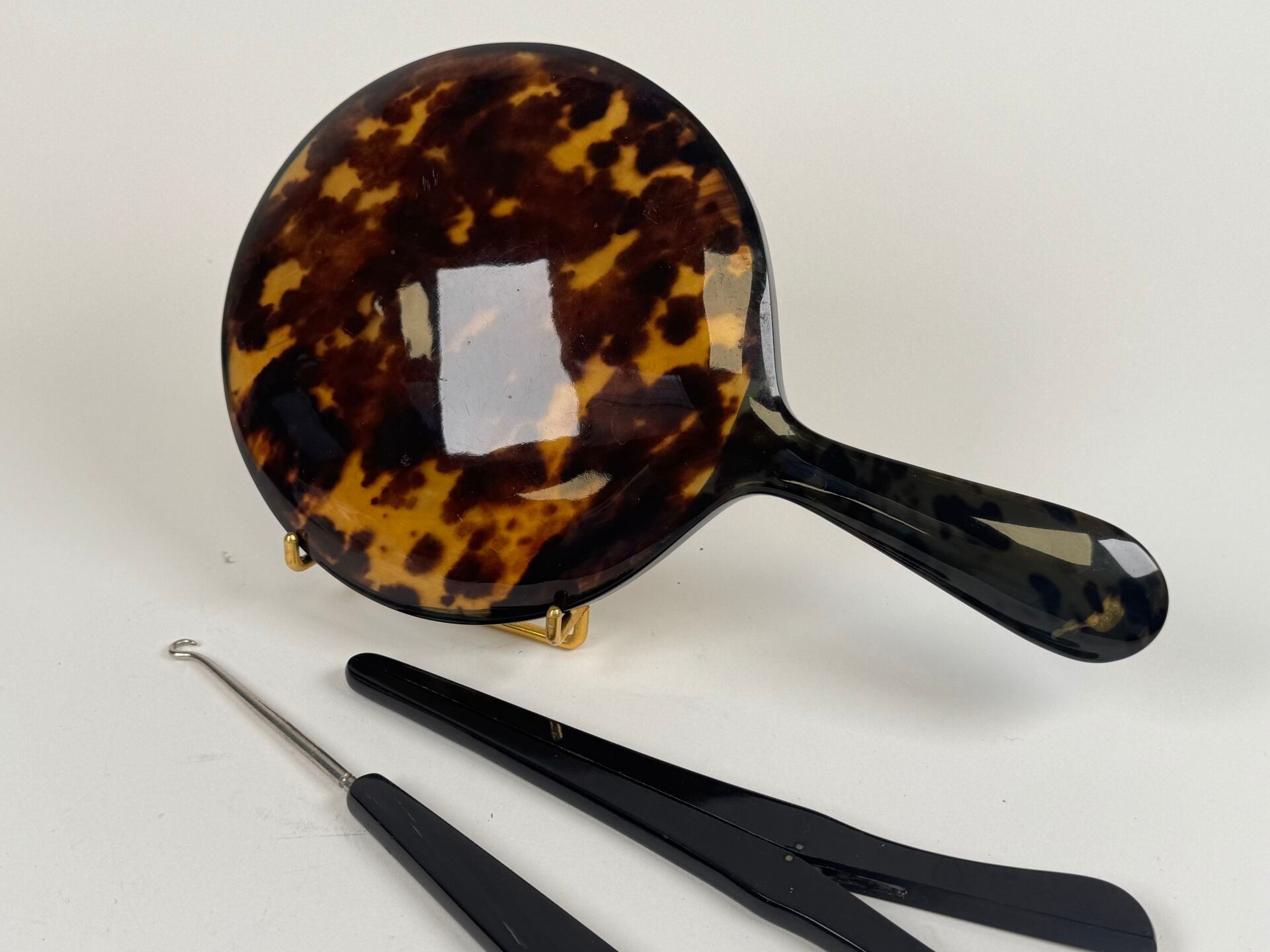 Glove clip and boot hook in tortoiseshell or horn.