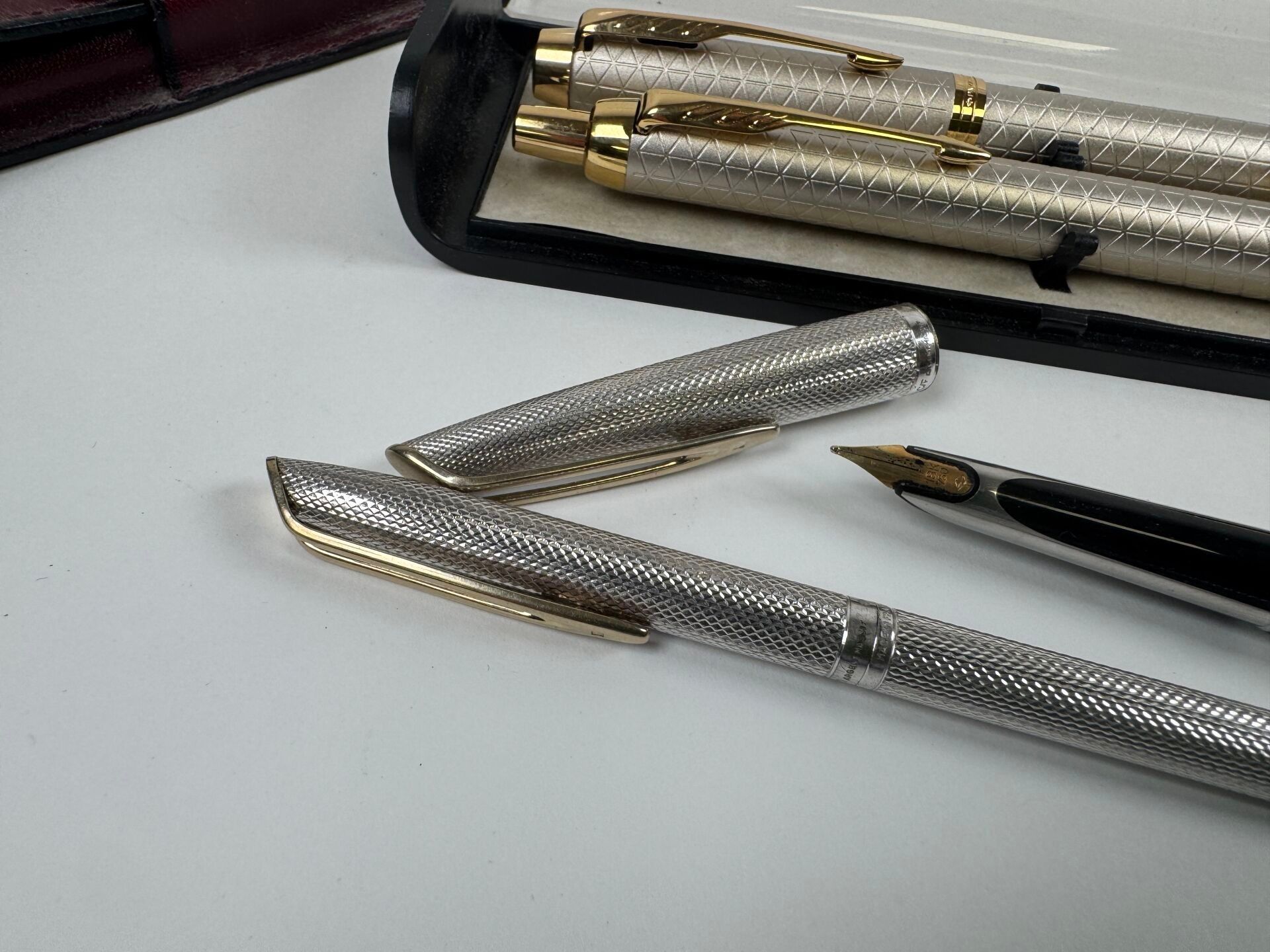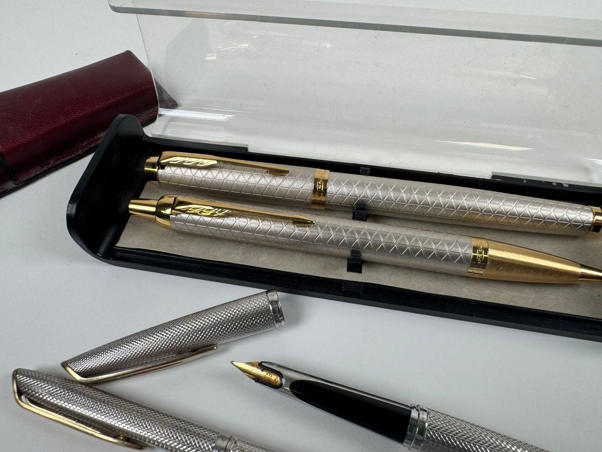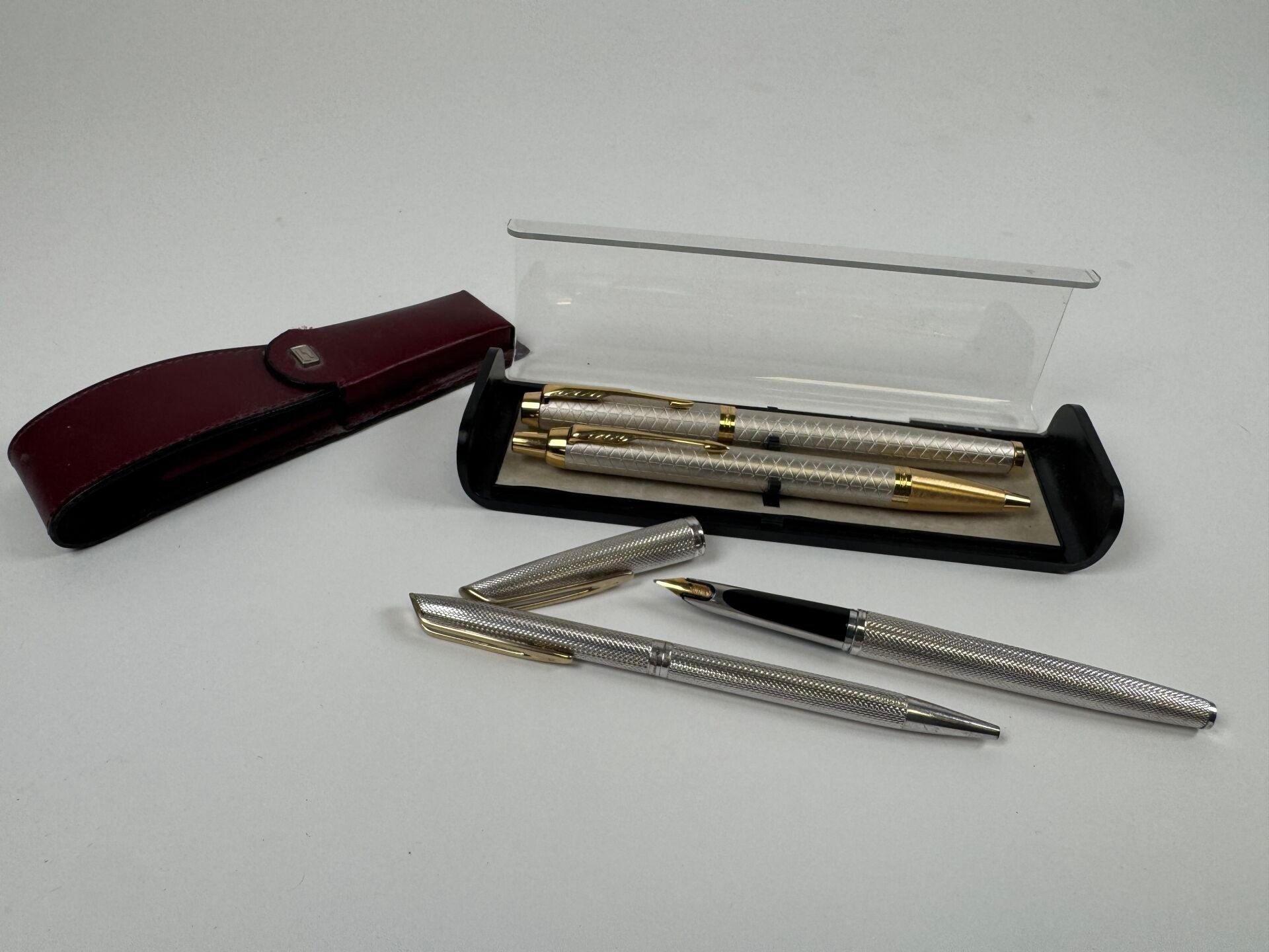 Fountain pen and biros set.