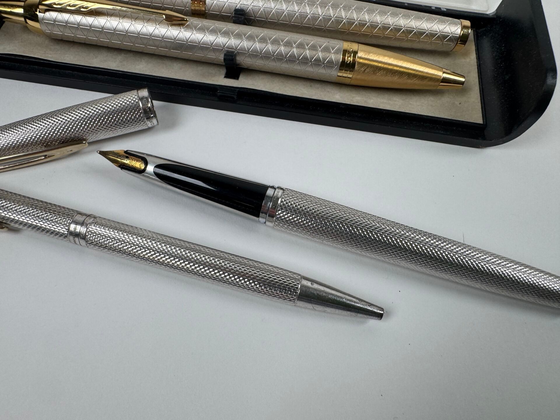 Engine-turned silver set comprising a fountain pen, 18K gold nib and biros.