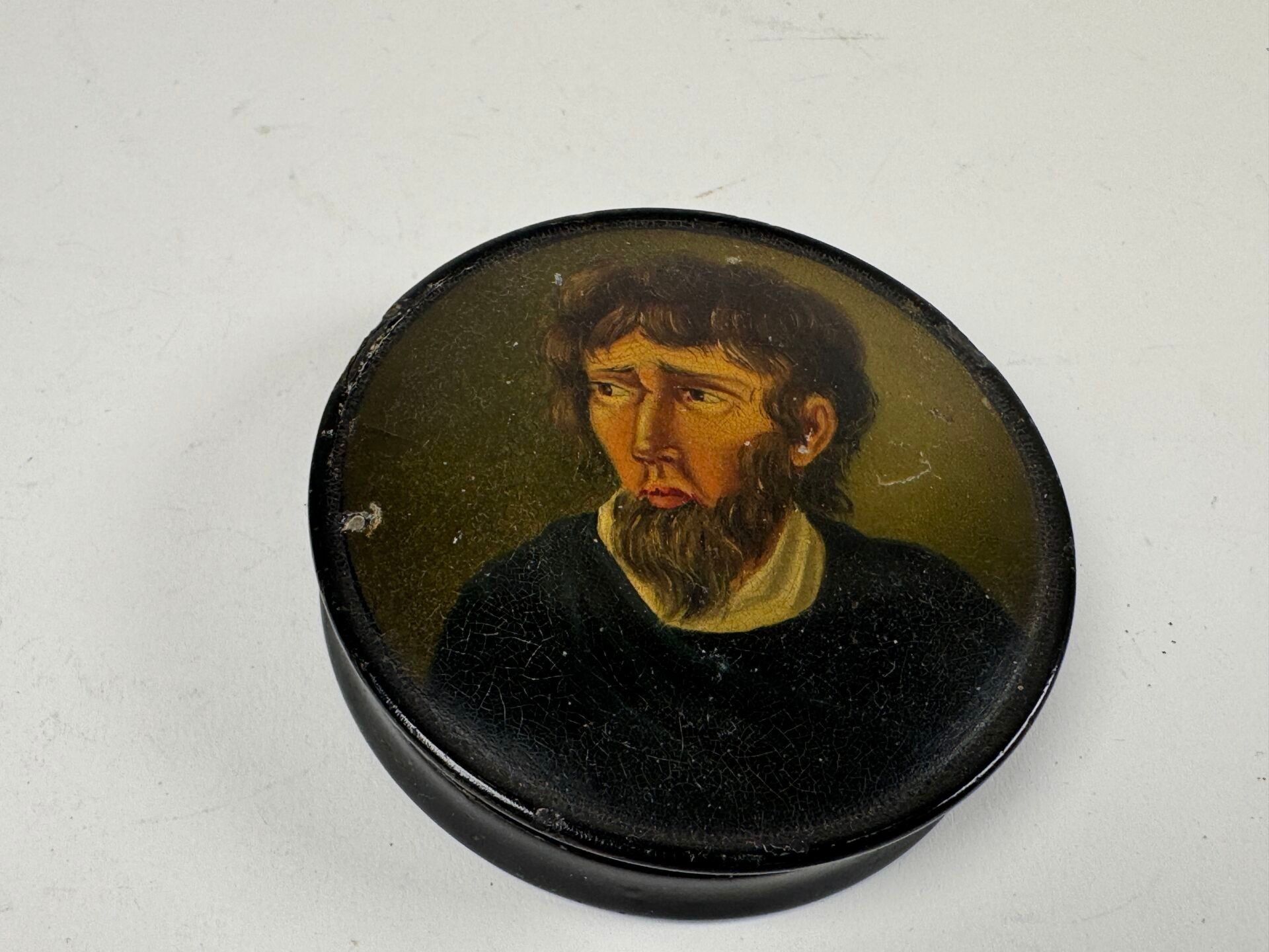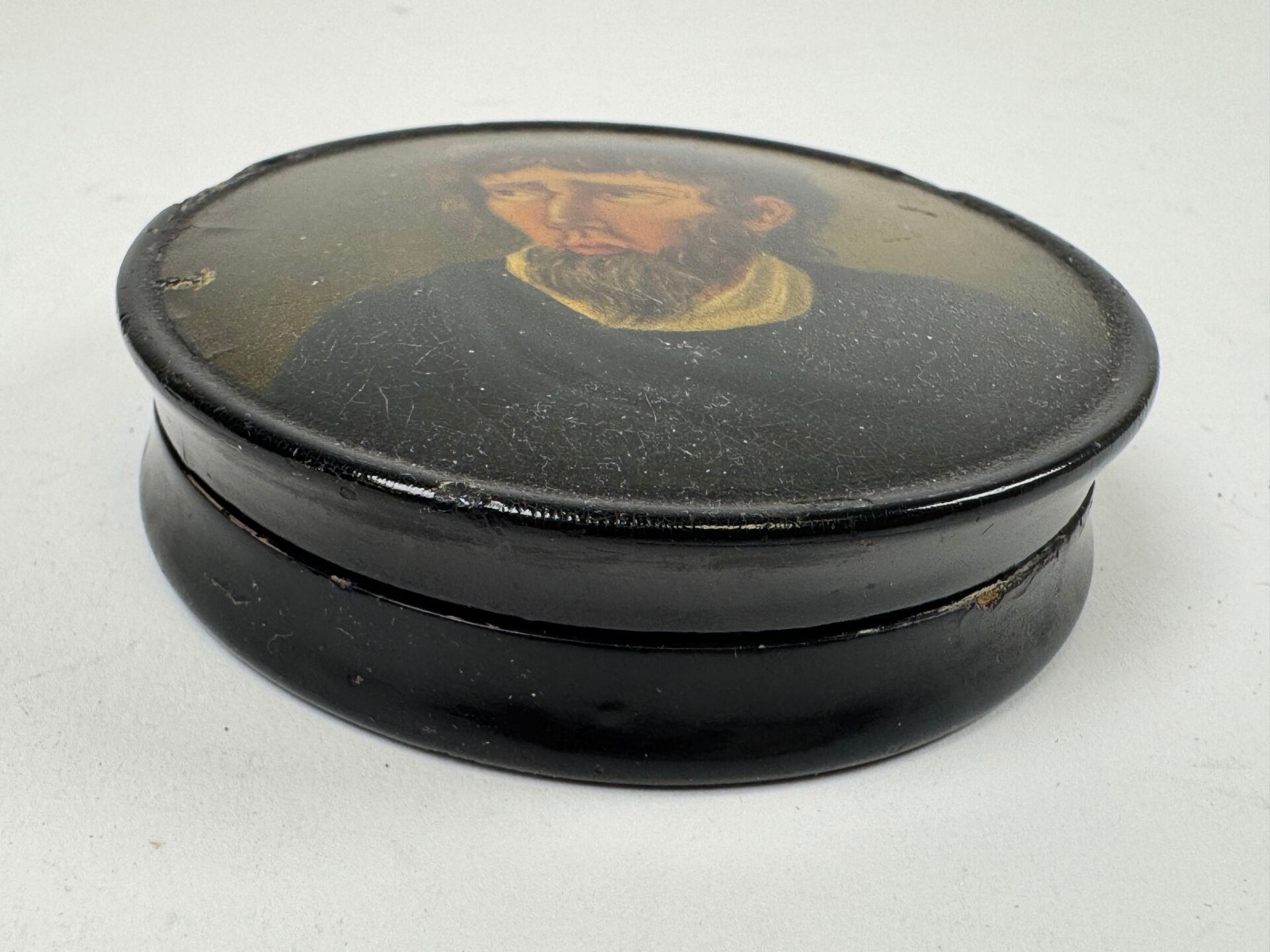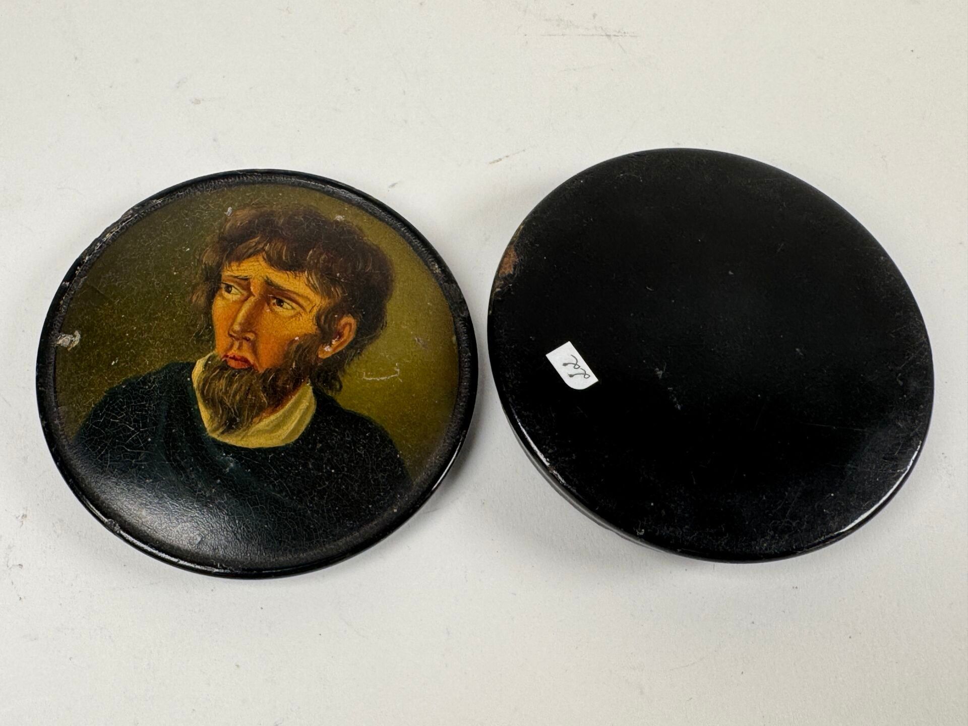 Circular snuffbox in lacquered wood painted with a portrait of a man.