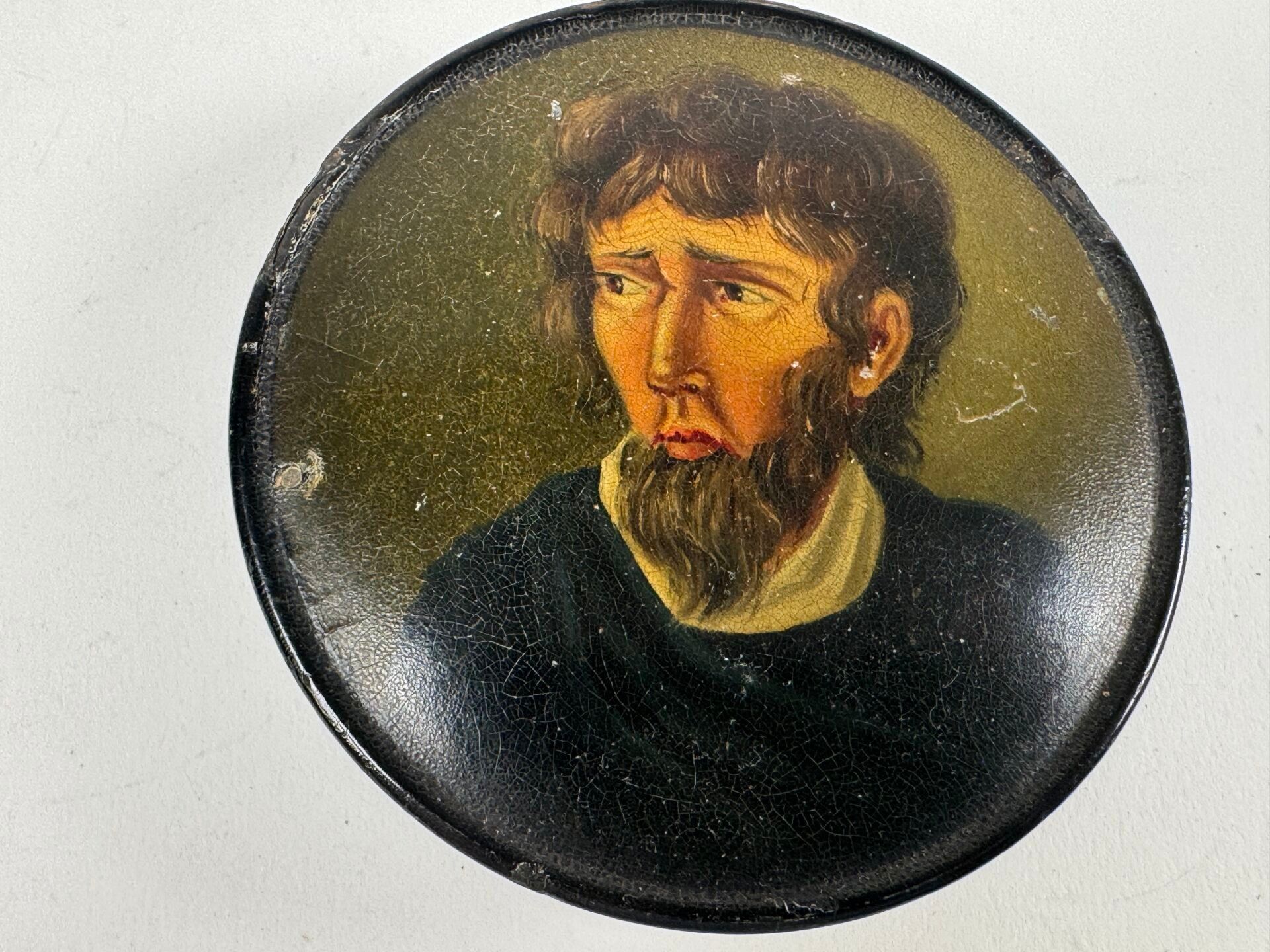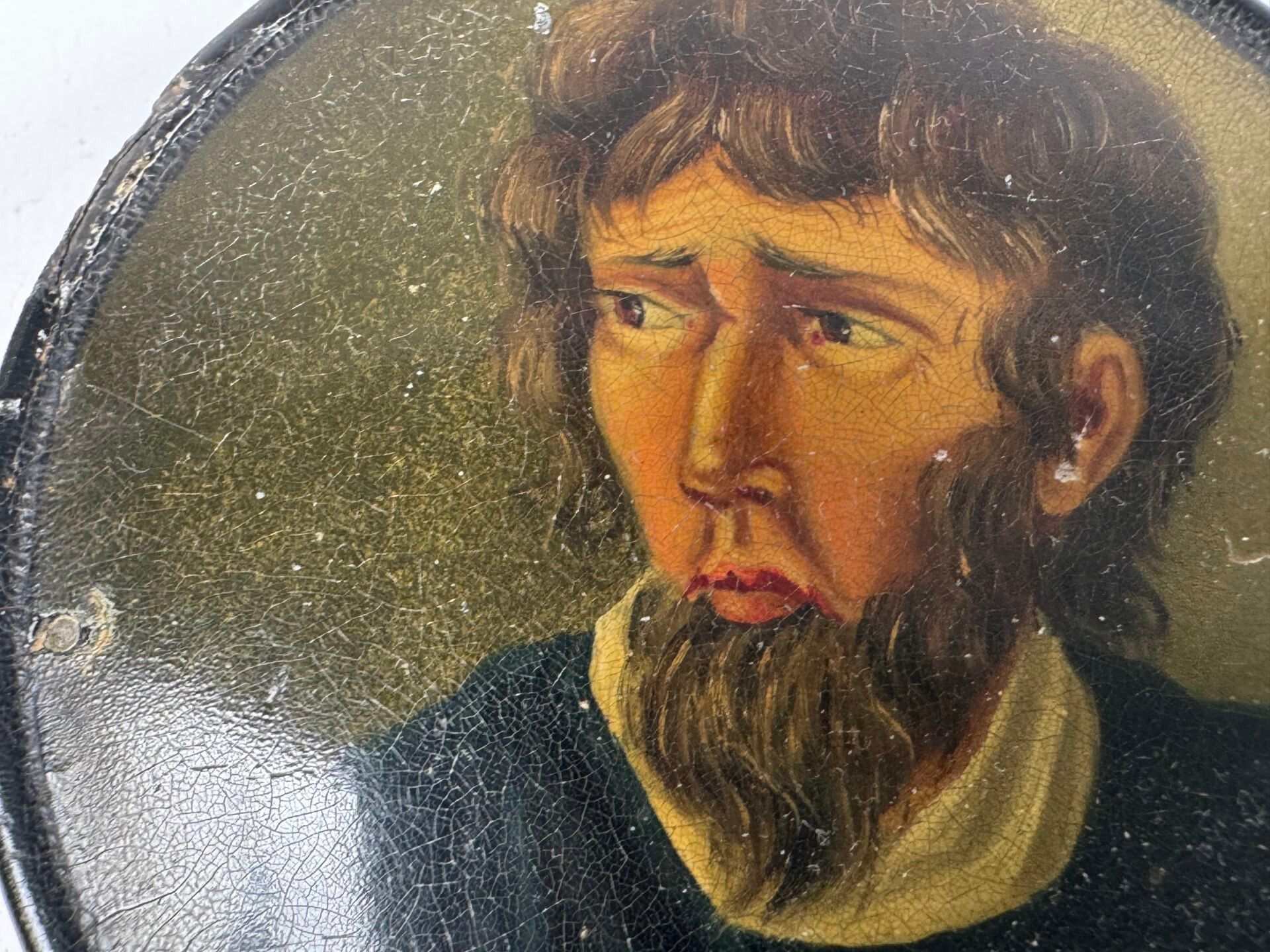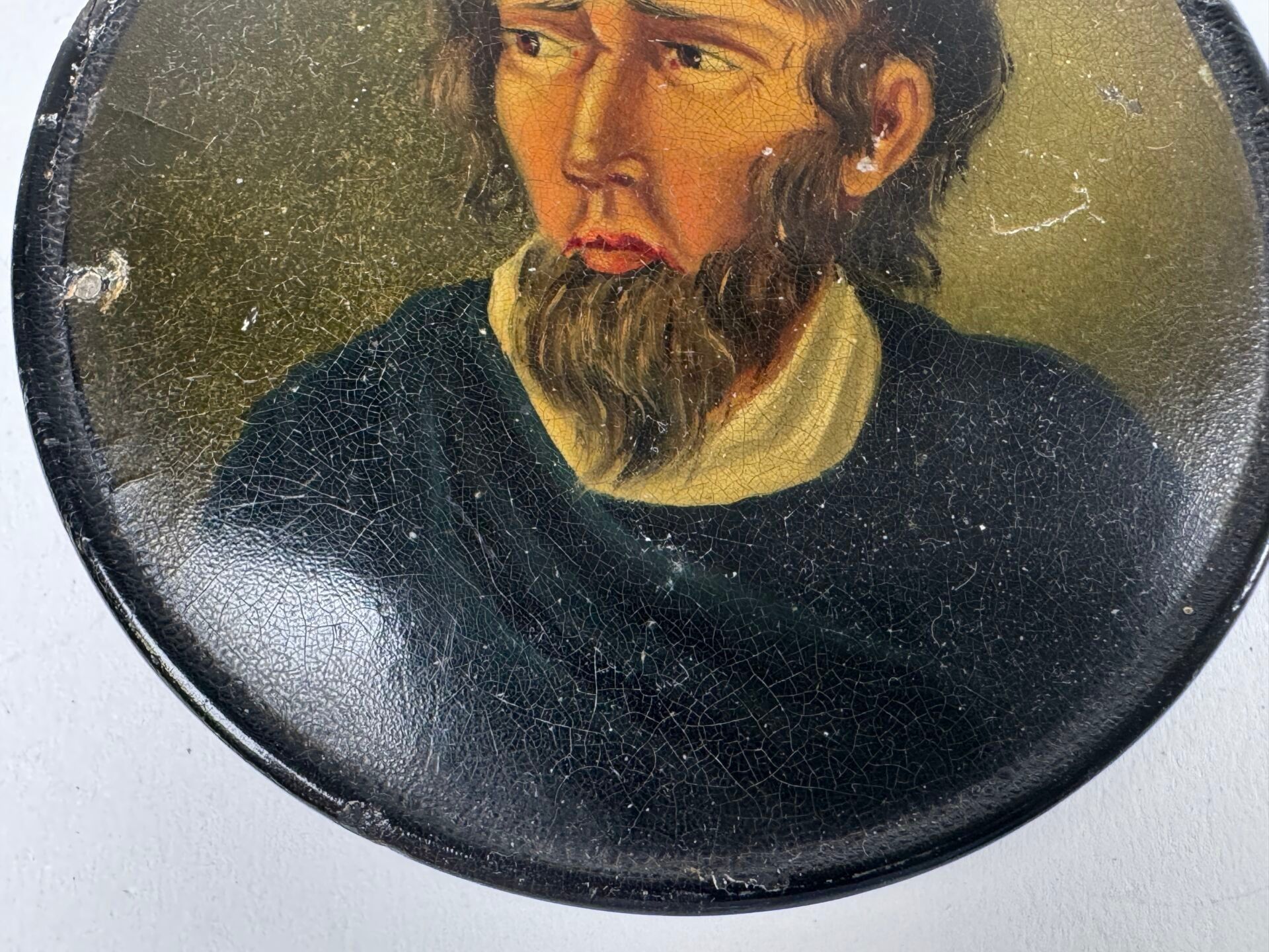 Circular snuffbox in lacquered wood painted with a portrait of a man.
