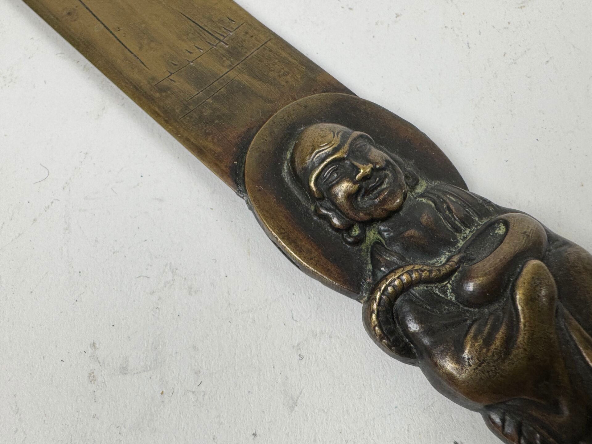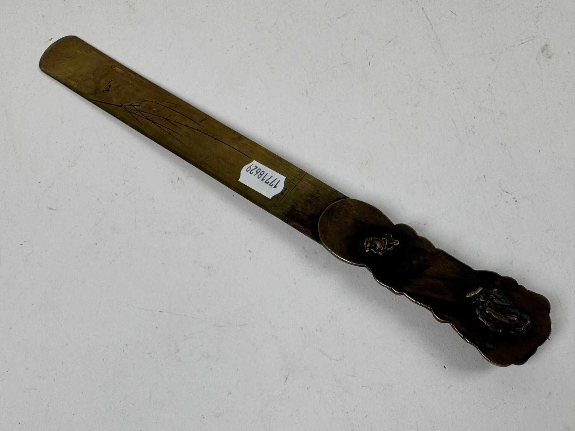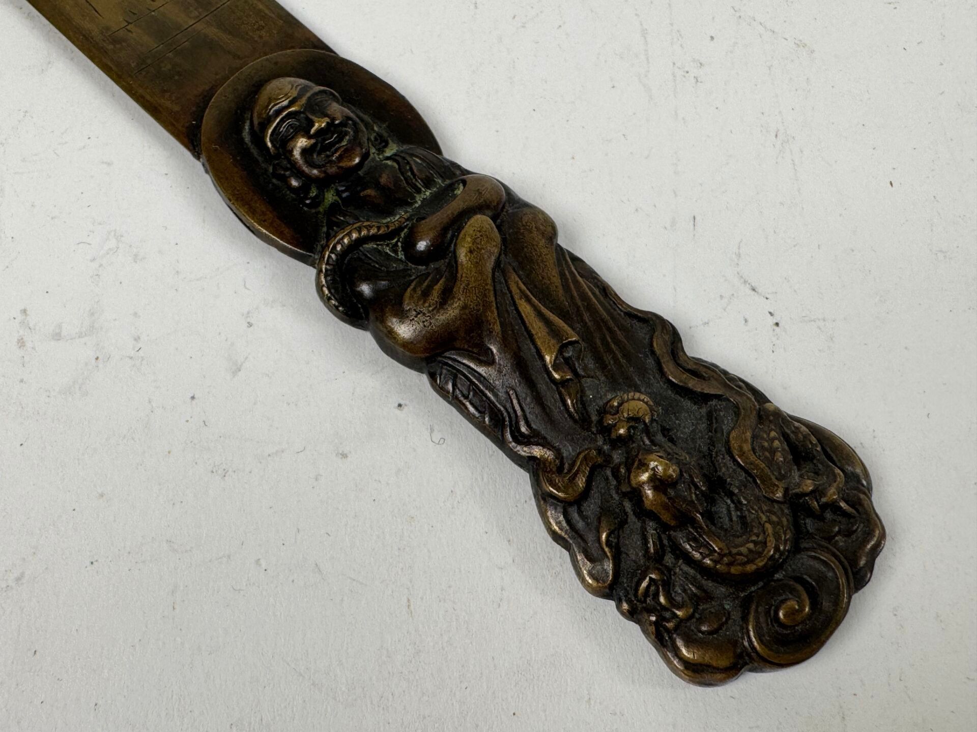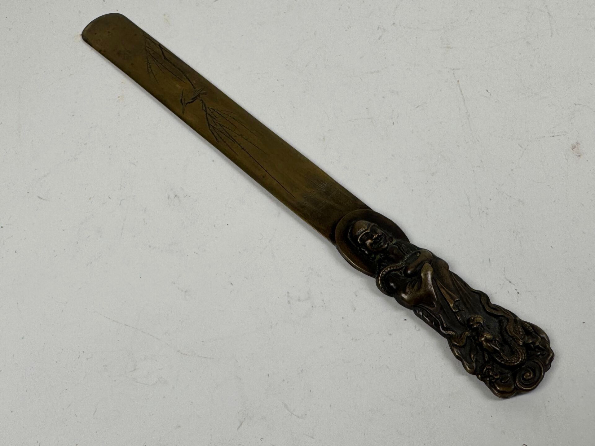 A patinated bronze page-turner, the handle decorated in relief with an Asian figure, the upper part chased with birds on both sides.