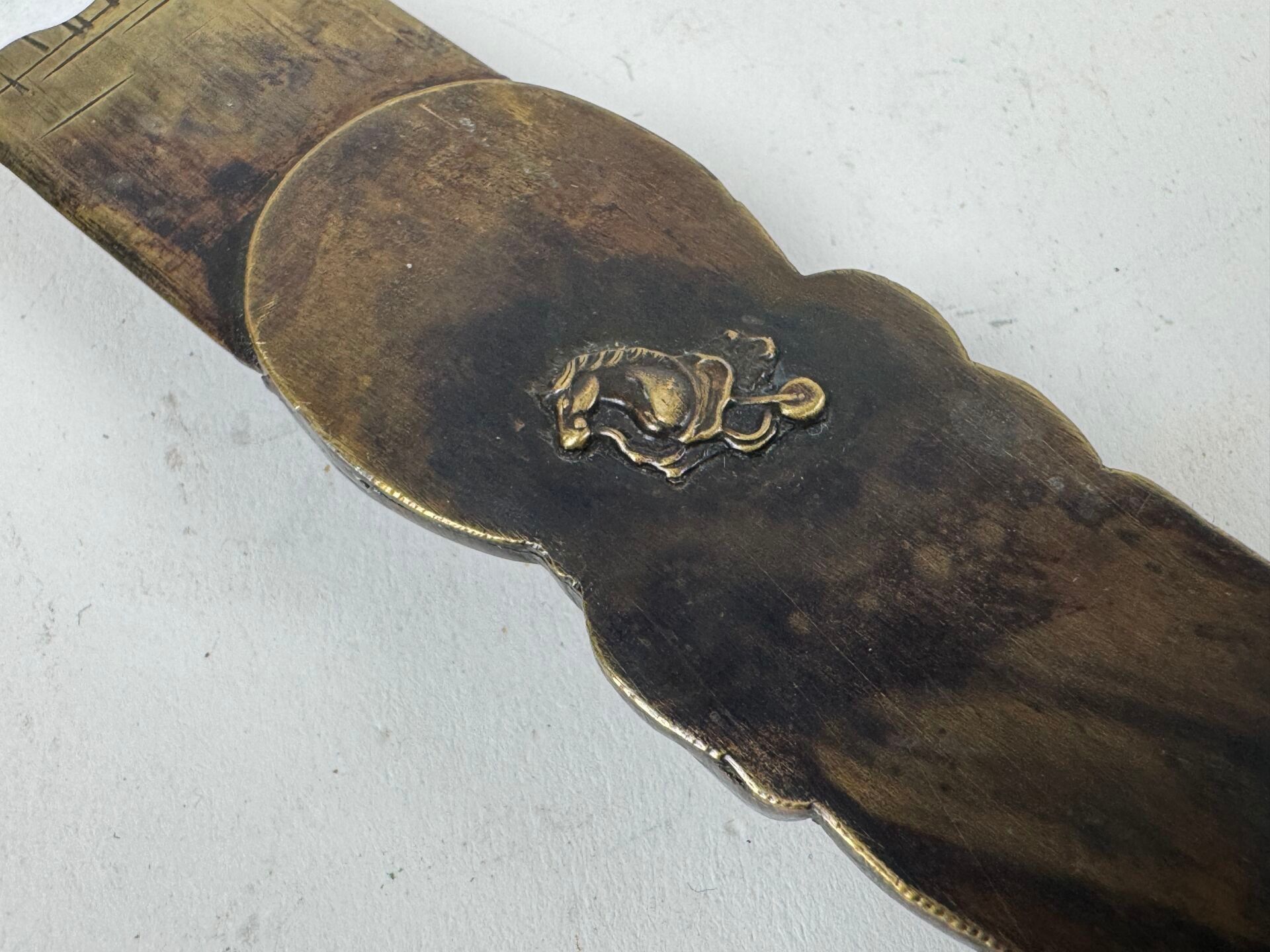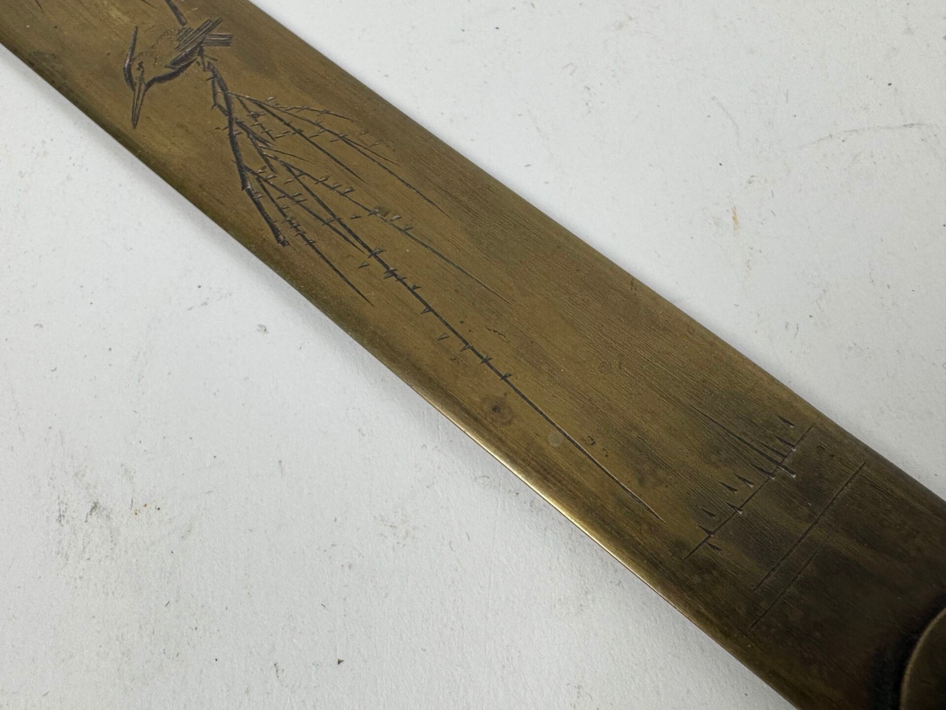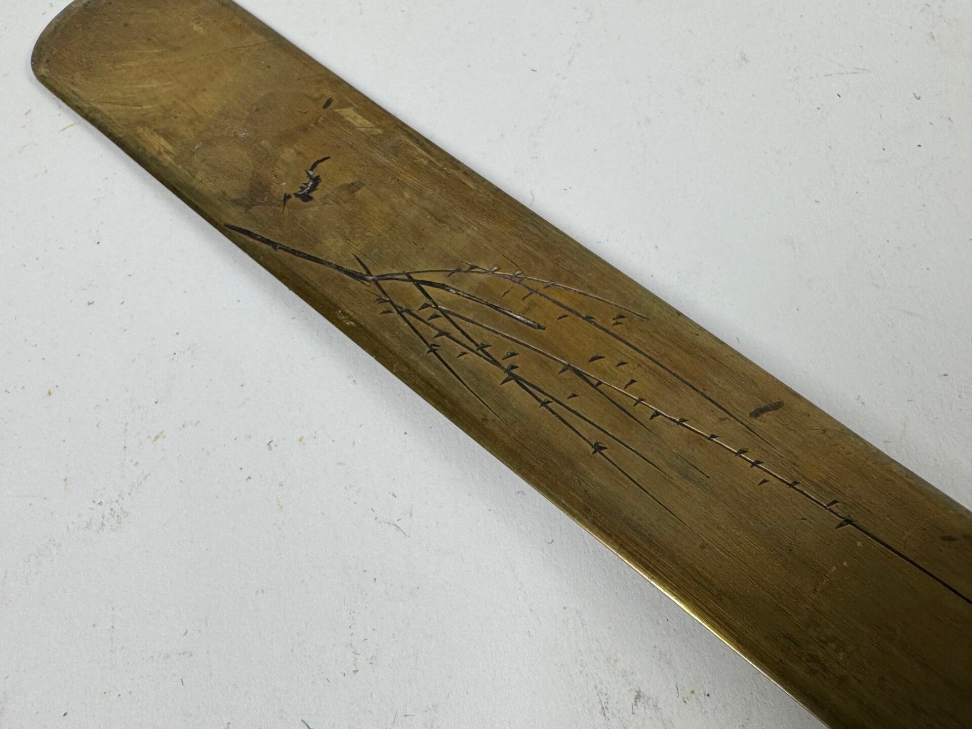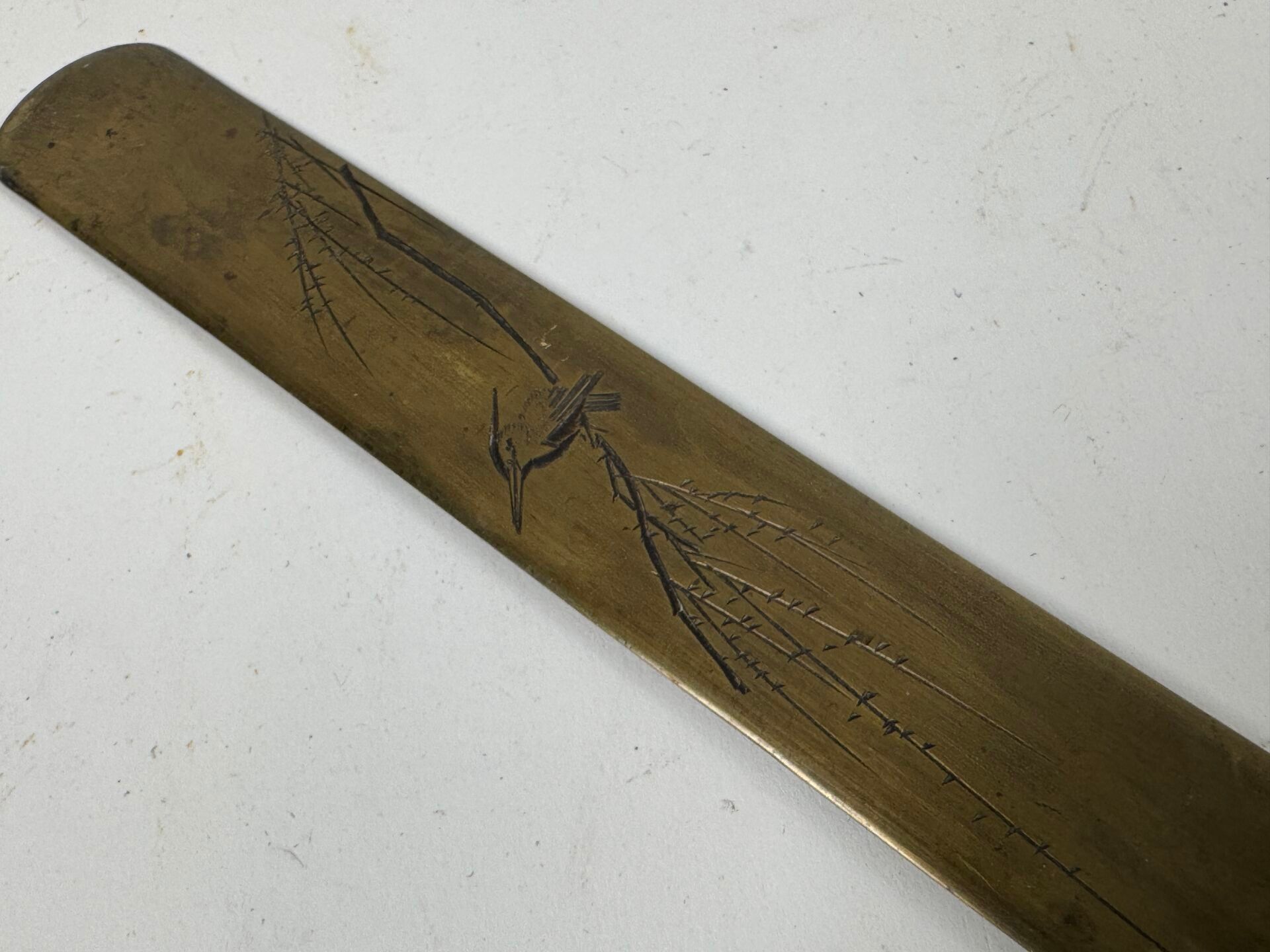 A patinated bronze page-turner, the handle decorated in relief with an Asian figure, the upper part chased with birds on both sides.