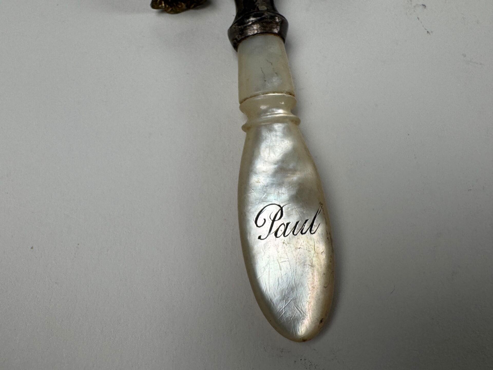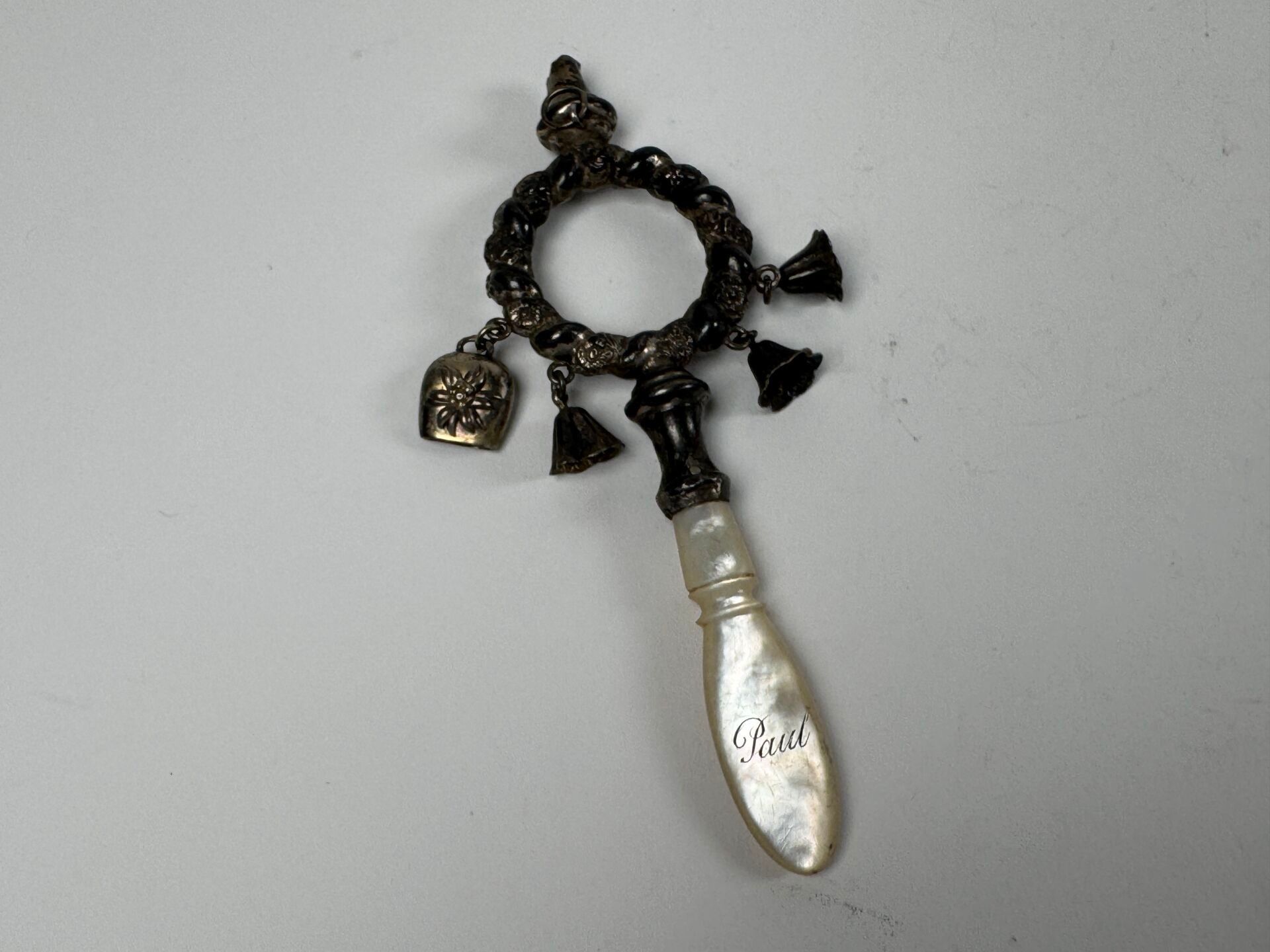 Silver whistle rattle with mother-of-pearl handle engraved with "Paul".