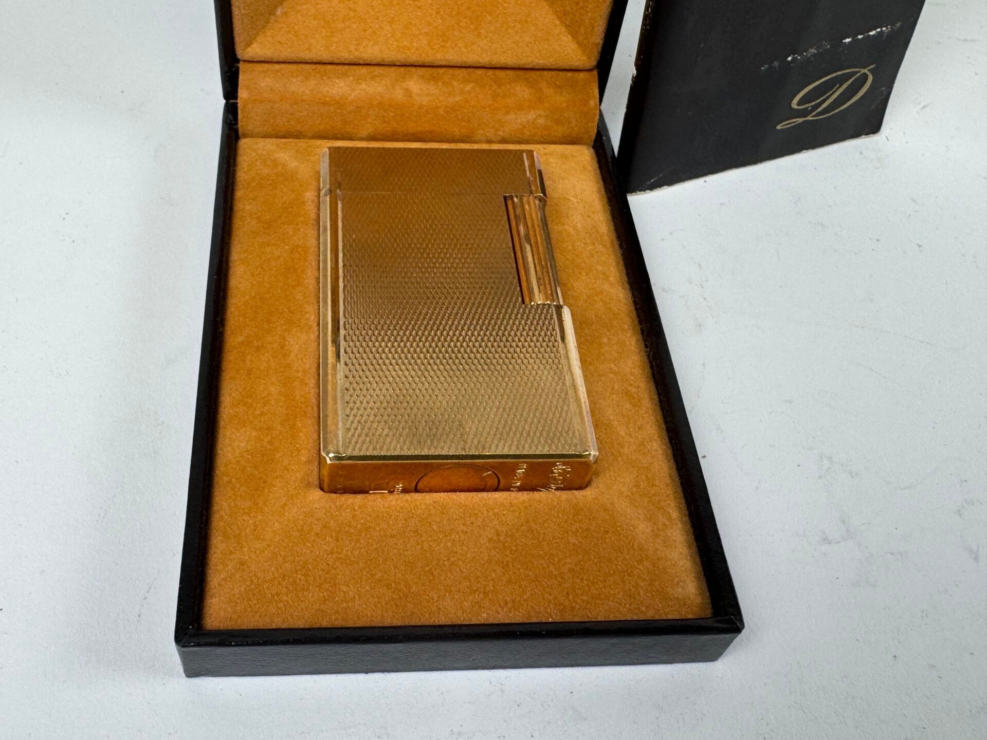 Gold-plated metal lighter with guilloche decoration.