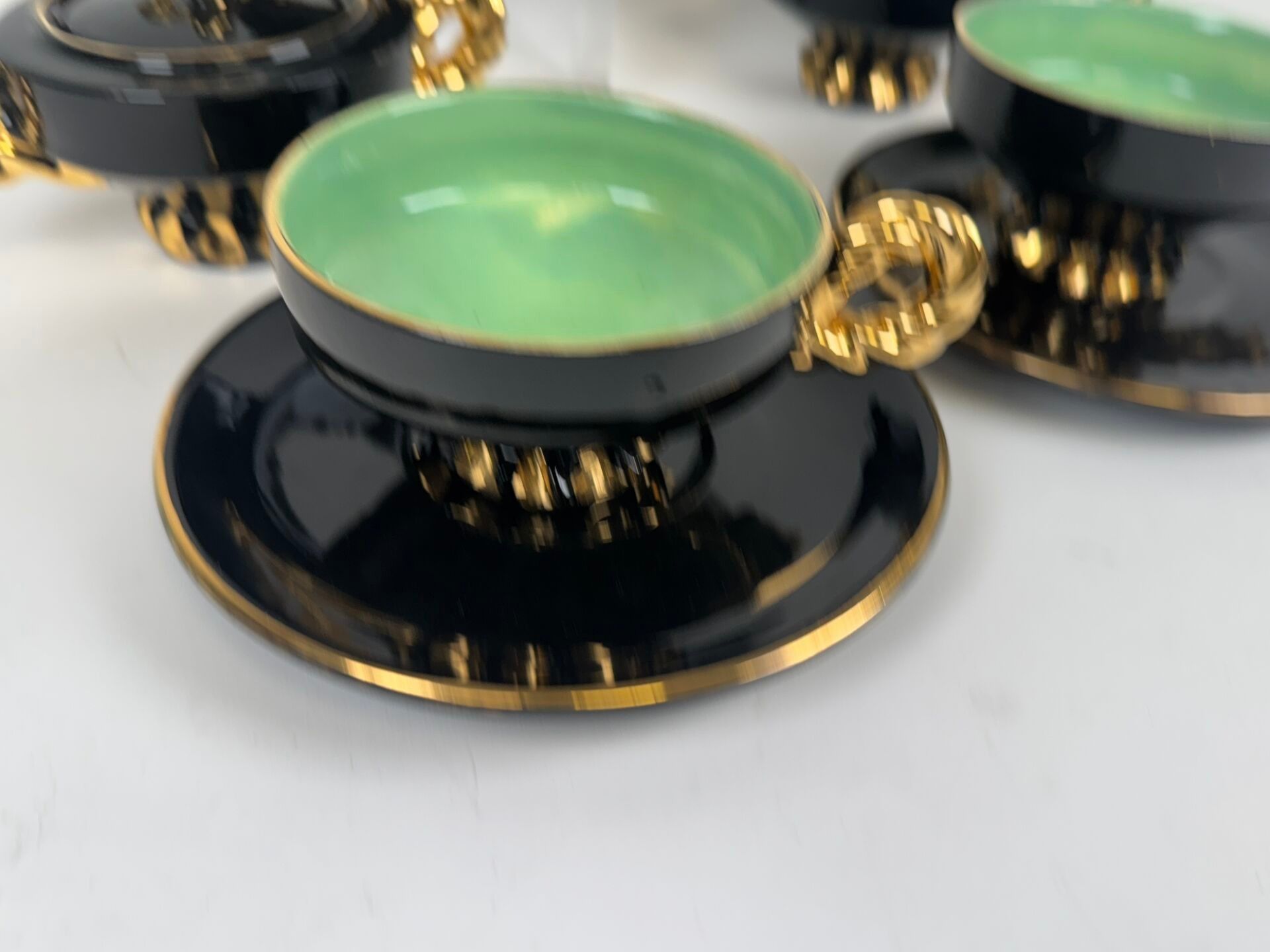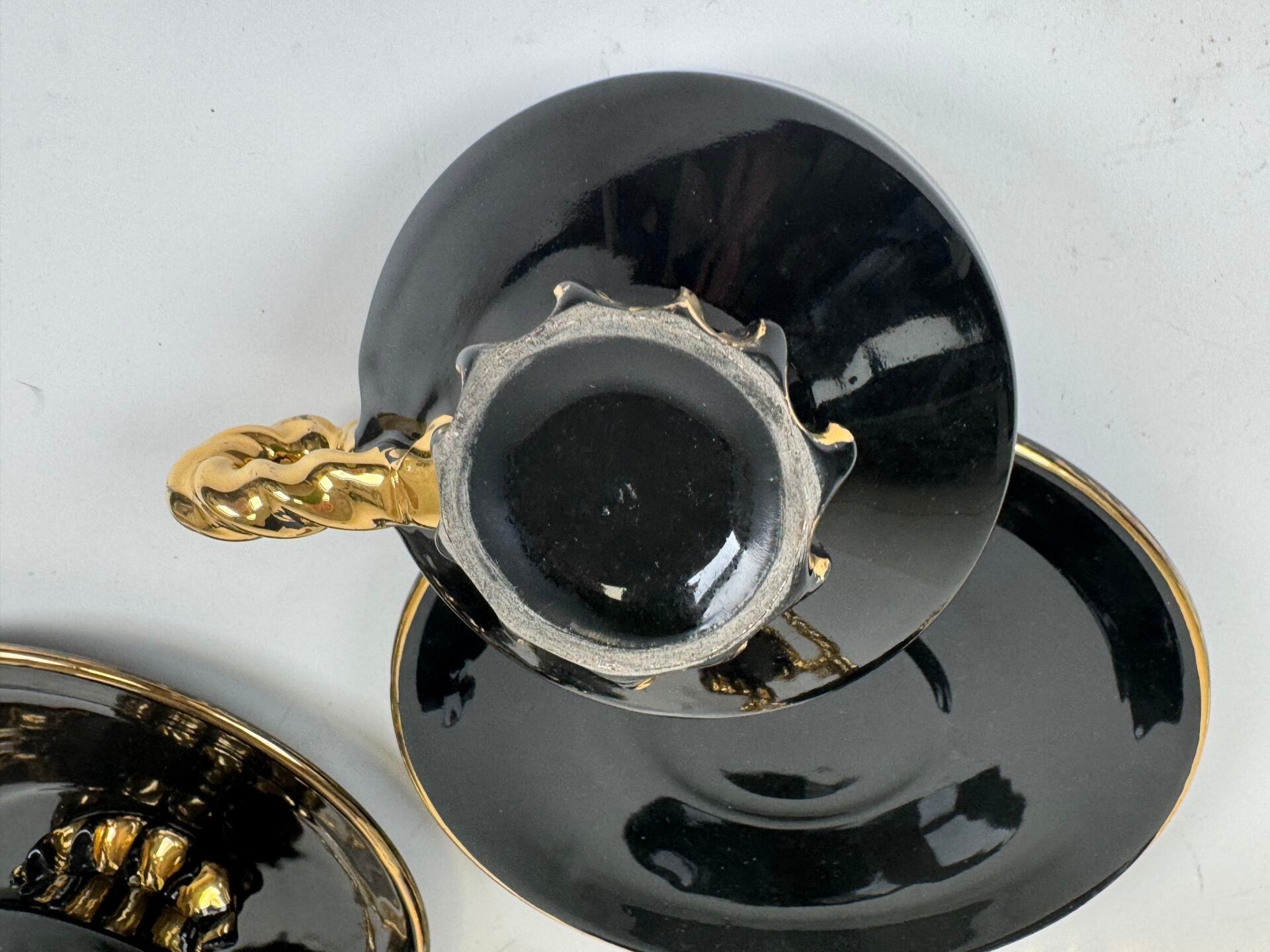 Polychrome ceramic head to head set comprising a coffee pot, a cream jug, a sugar bowl, two breakfast cups and two saucers.