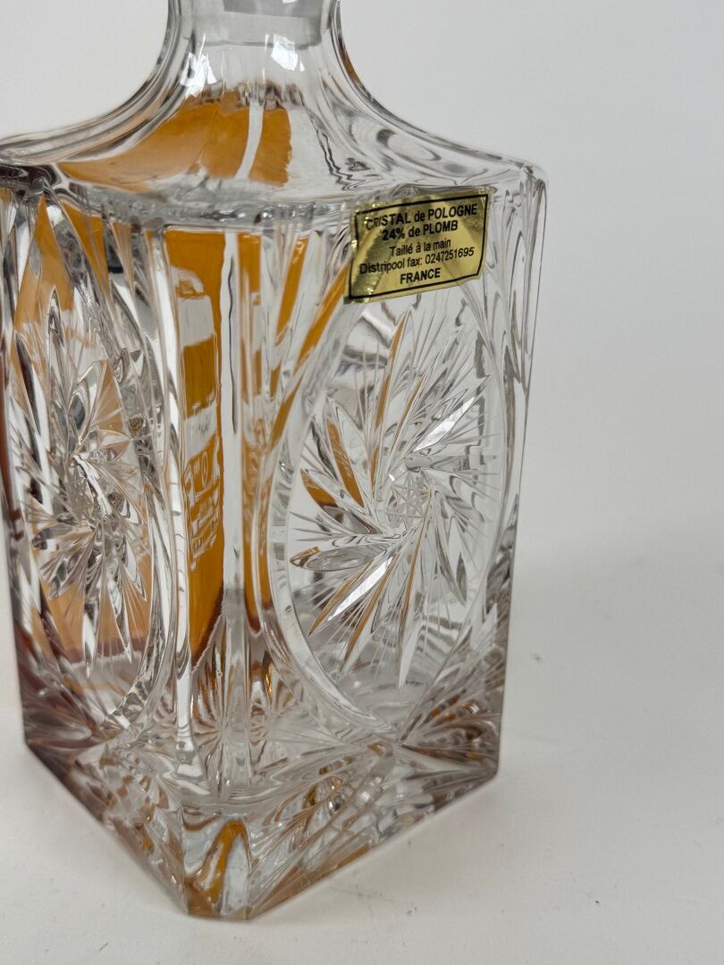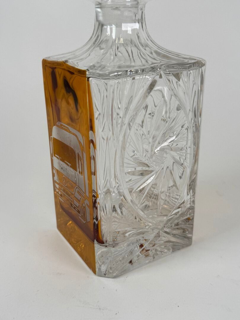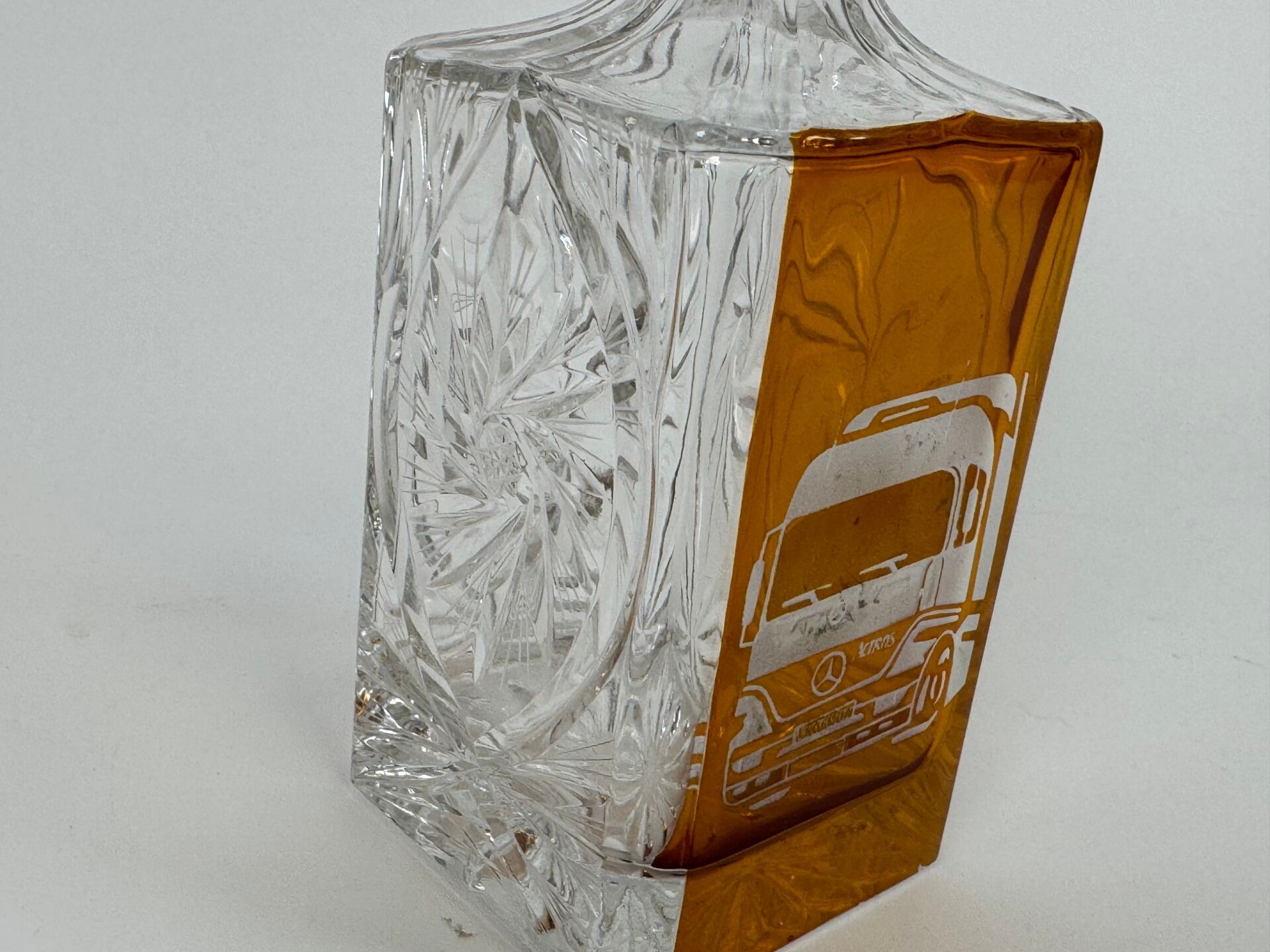 Advertising carafe in cut glass, one side with coloured decoration of a "Mercedes Benz" truck.