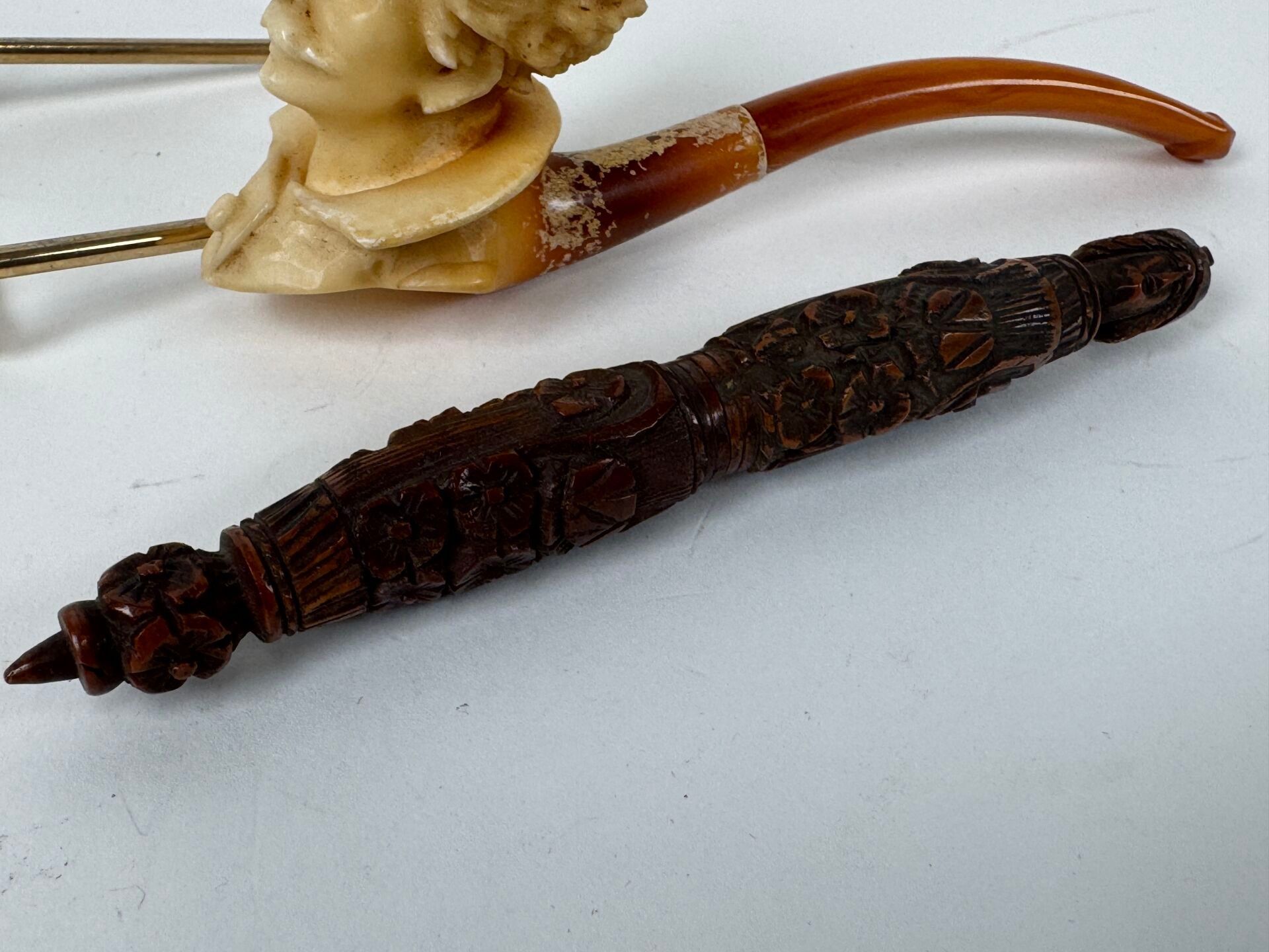 - A carved boxwood needle case decorated with a flower, one end depicting the bust of a character.