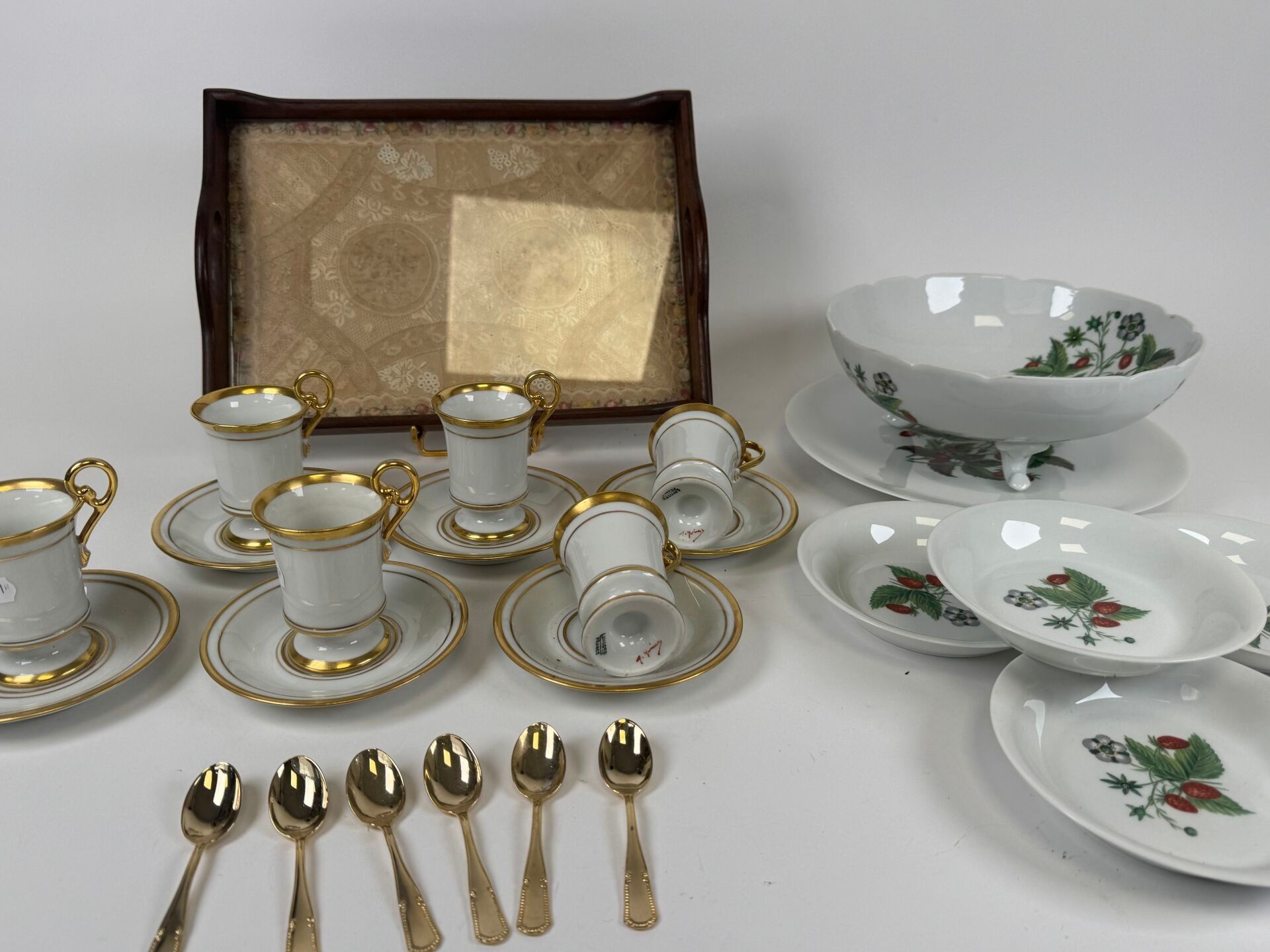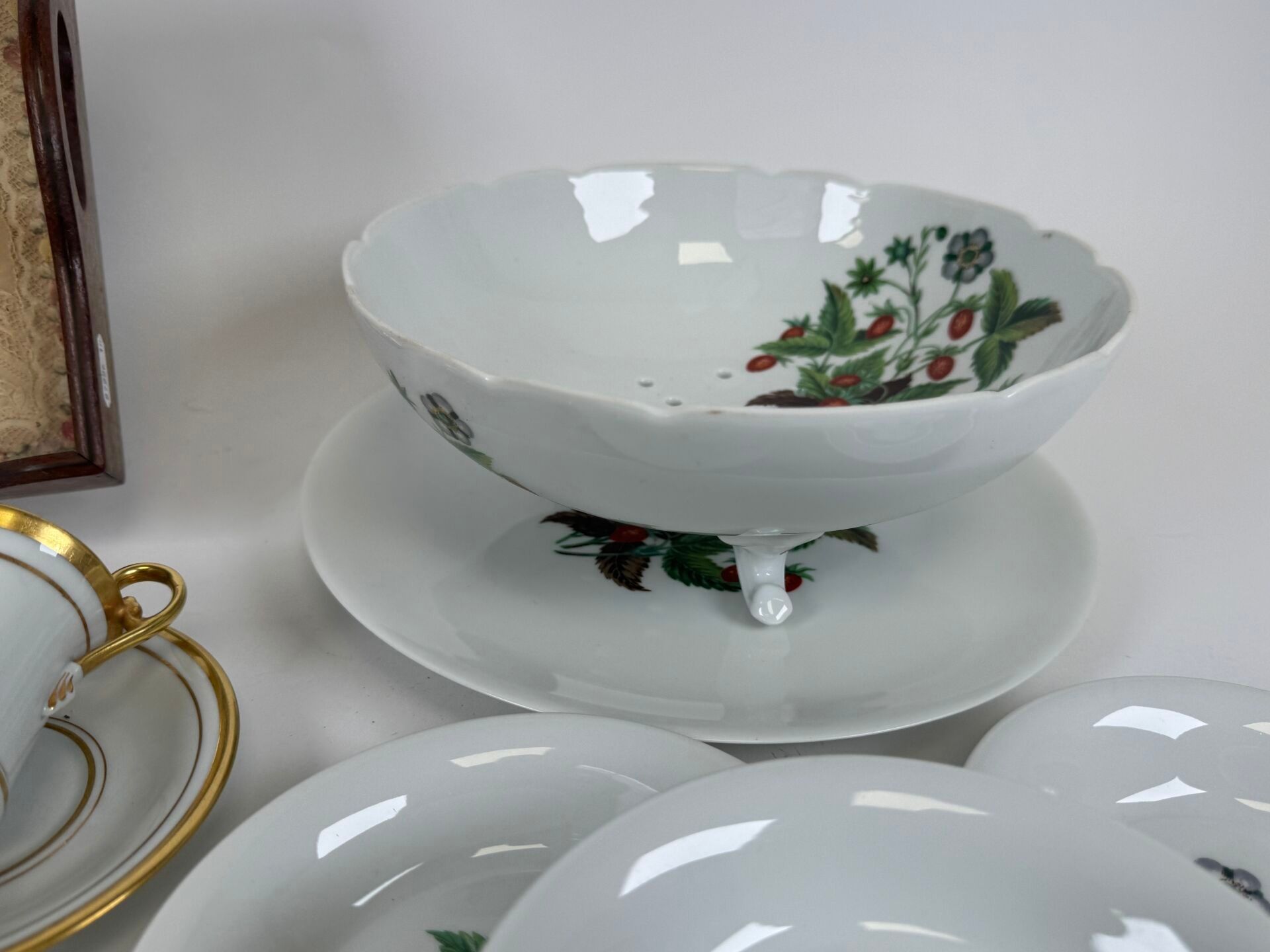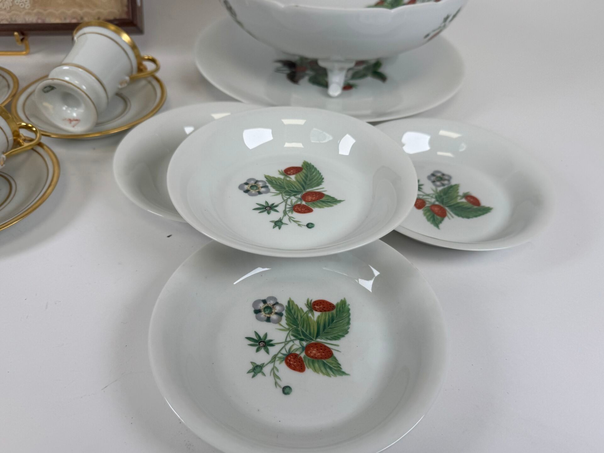 Polychrome porcelain strawberry set comprising four bowls, a salad bowl and its display dish.