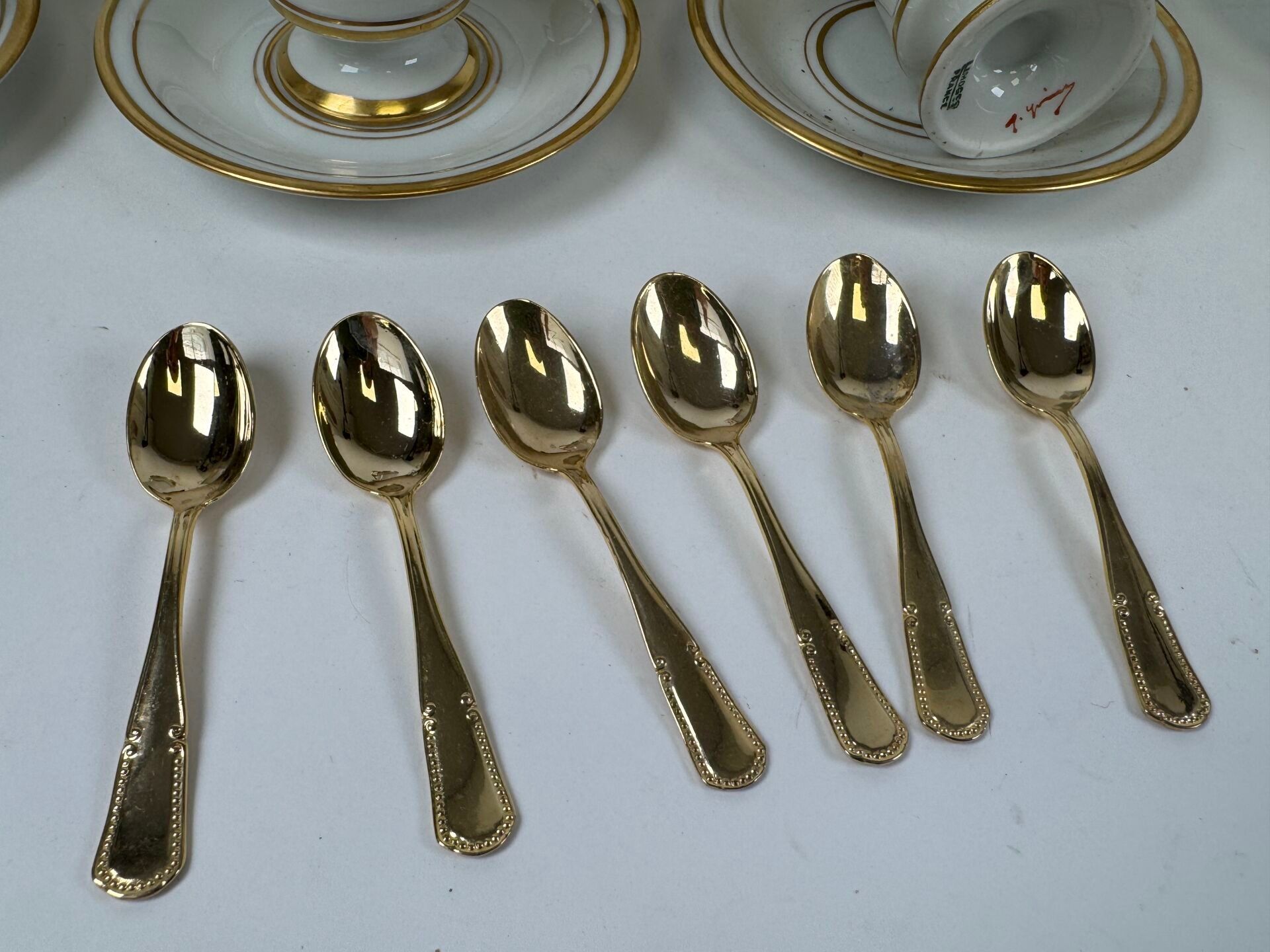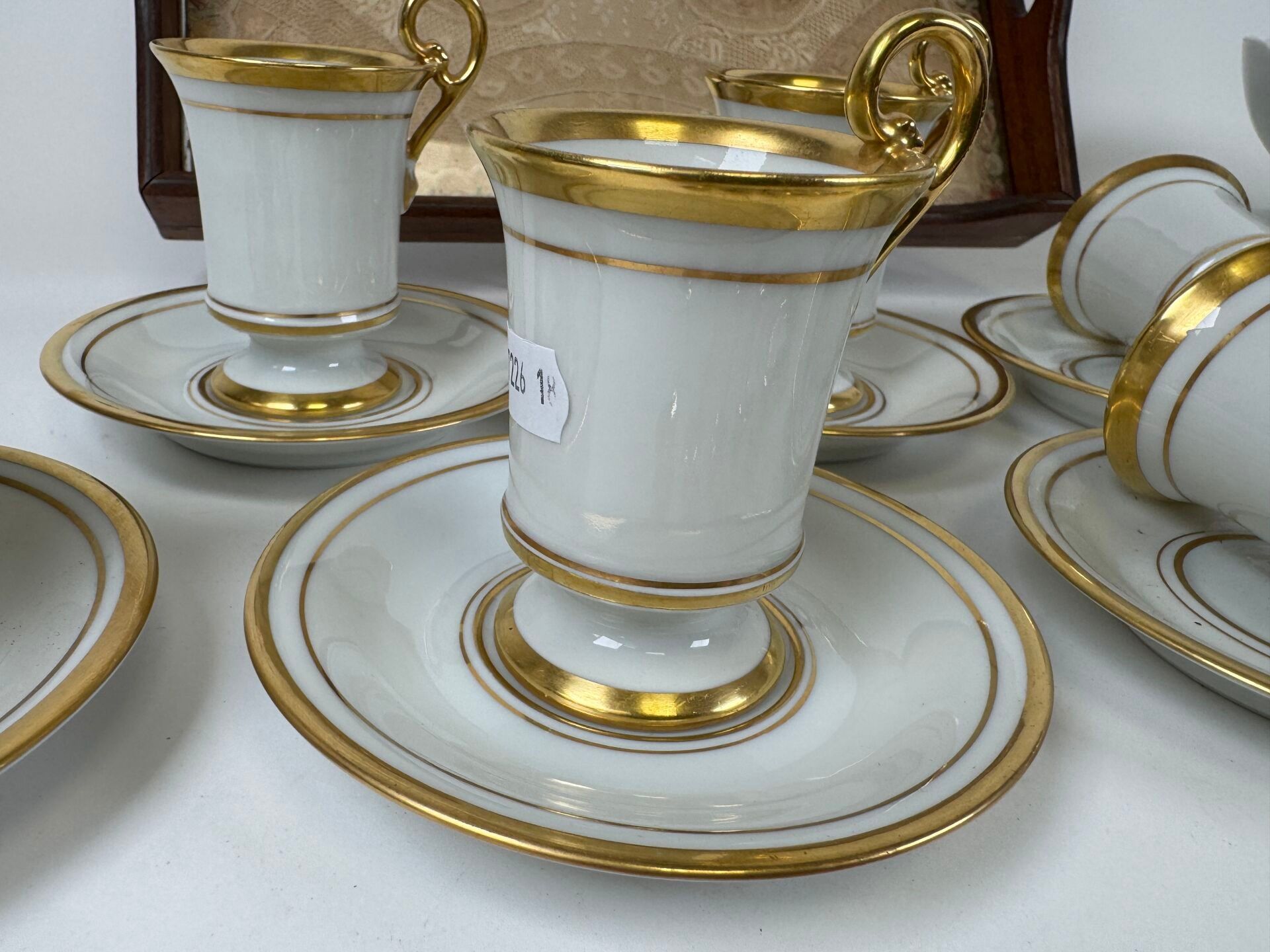 - 6 cups and 6 saucers in white and gold porcelain.