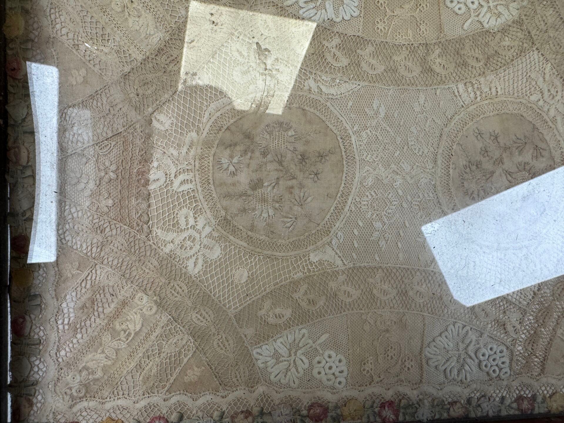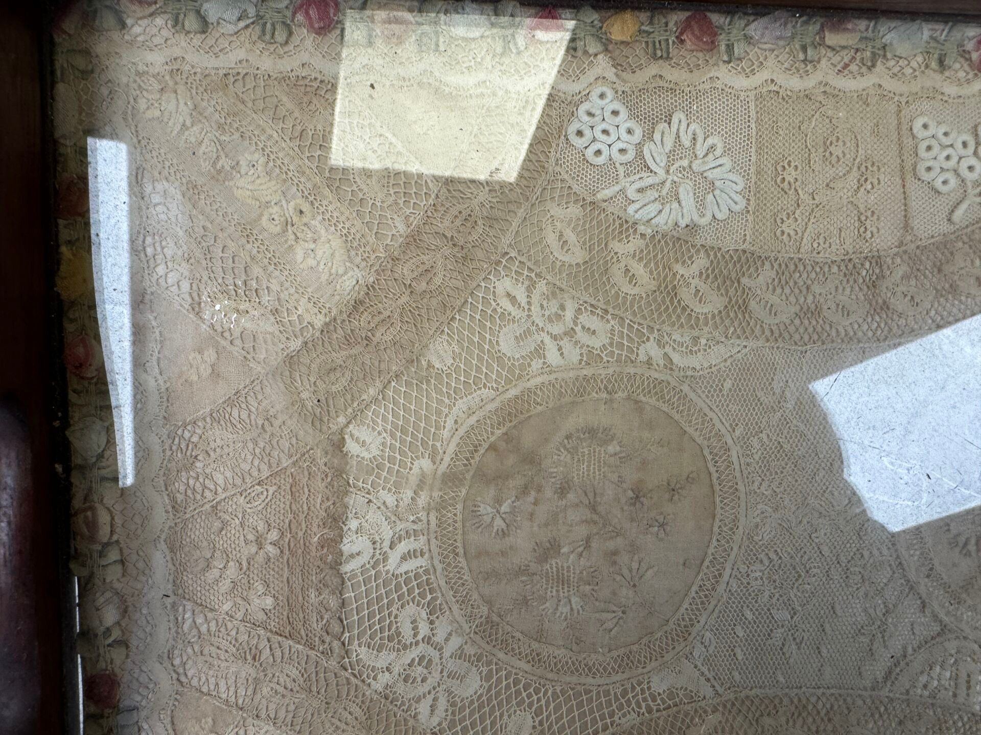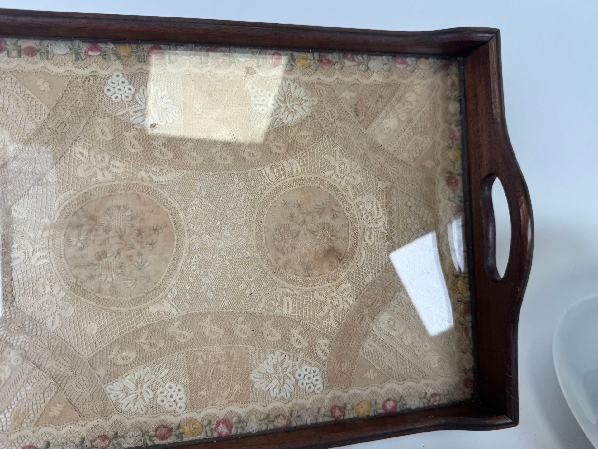 - a rectangular wooden tray with two handles, the central part embroidered under glass.