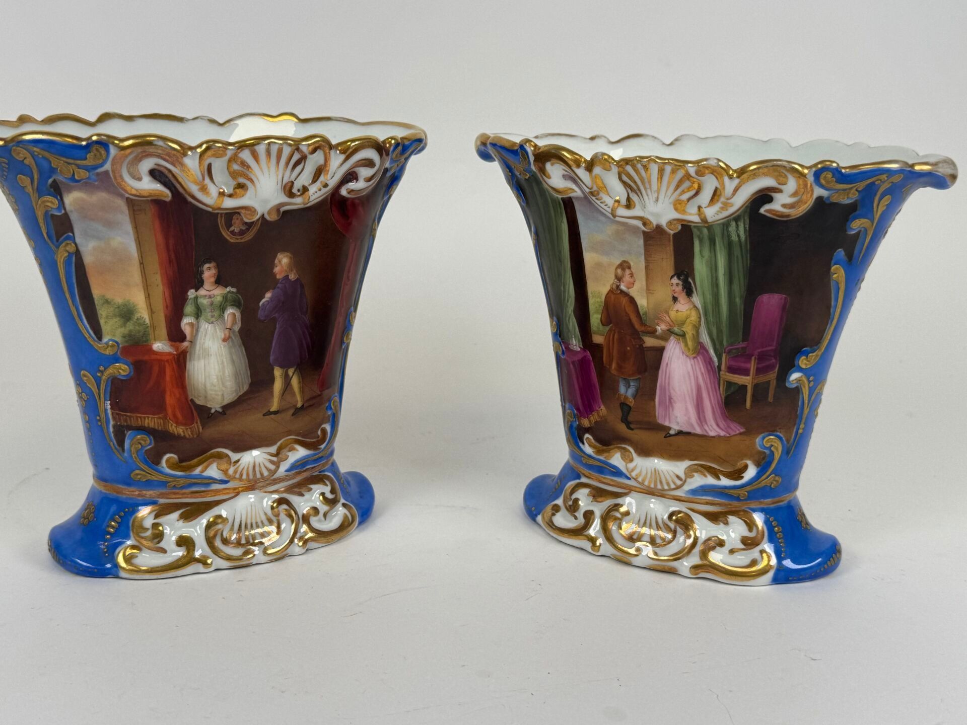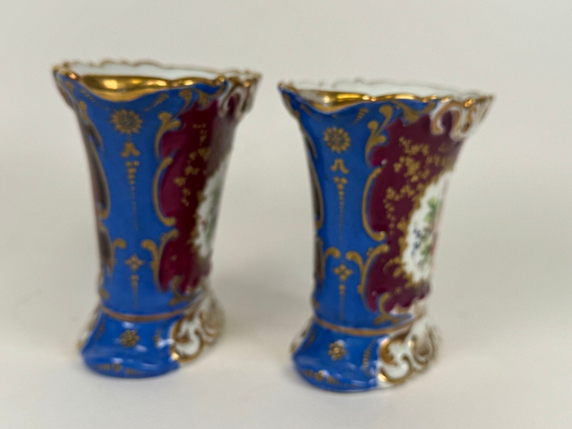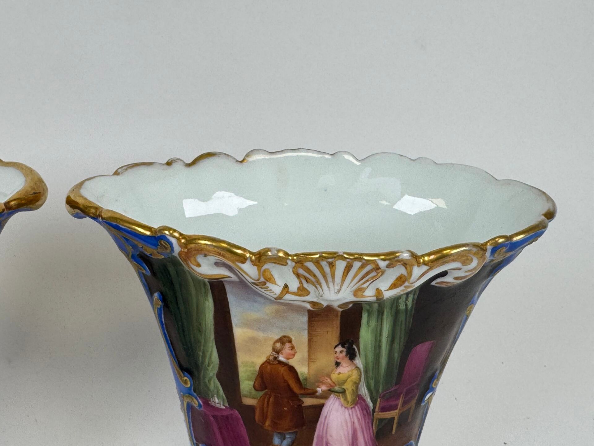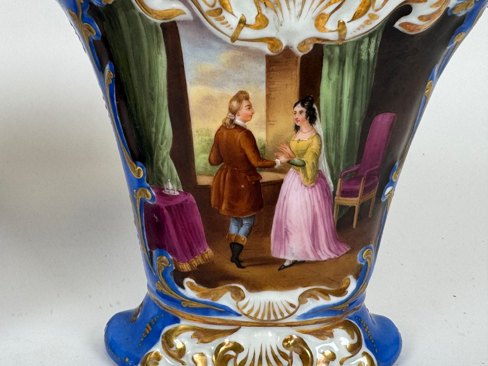 A pair of polychrome and gold porcelain vases decorated in medallions with romantic scenes and flowers.